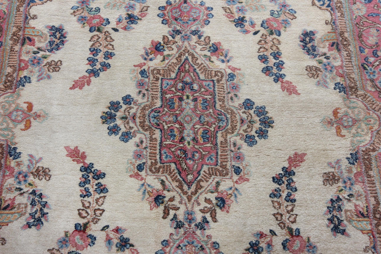 Handknuten persisk matta i ull på bomullsvarp, Medaljongmönster med blomornamentik på naturvit botten. Signerad.