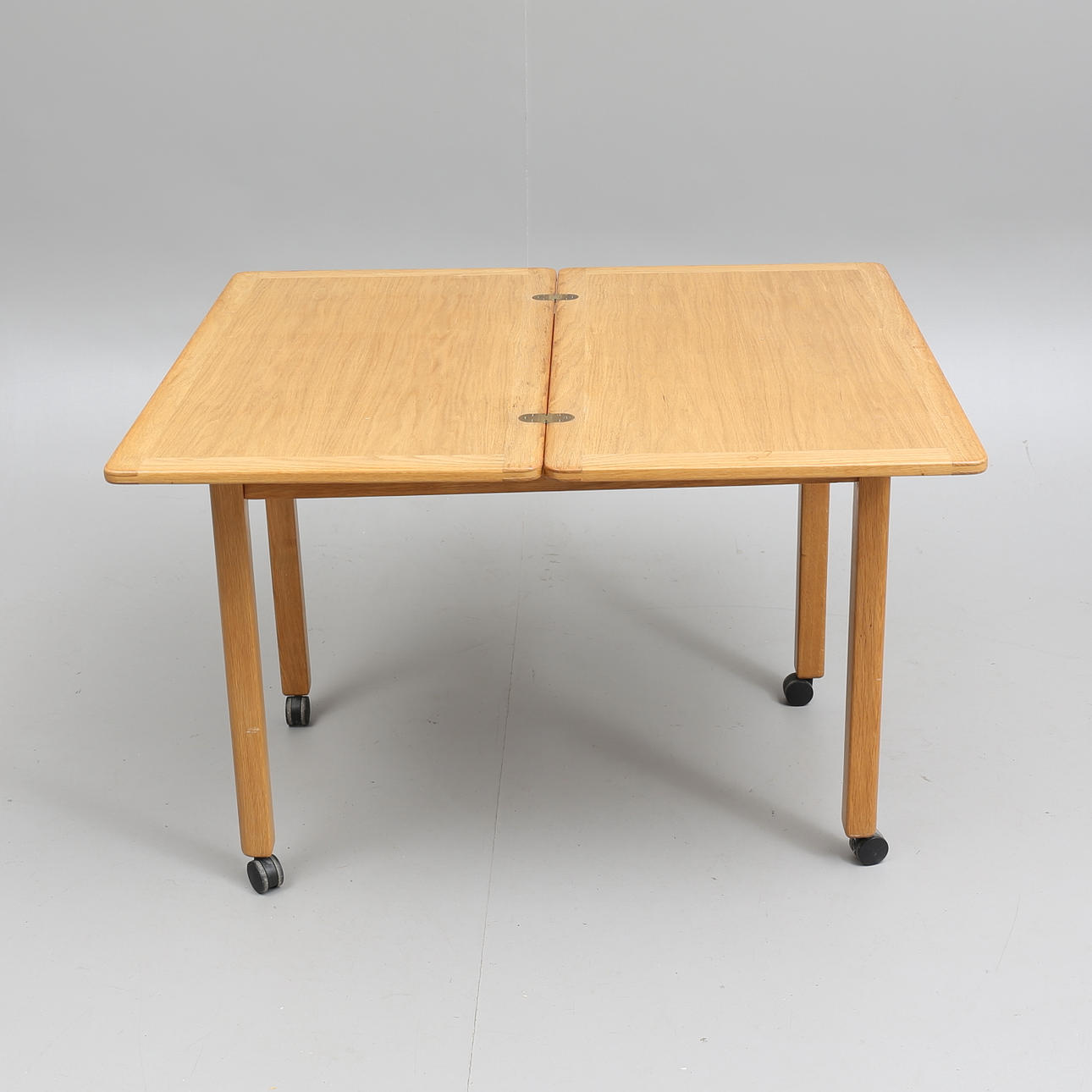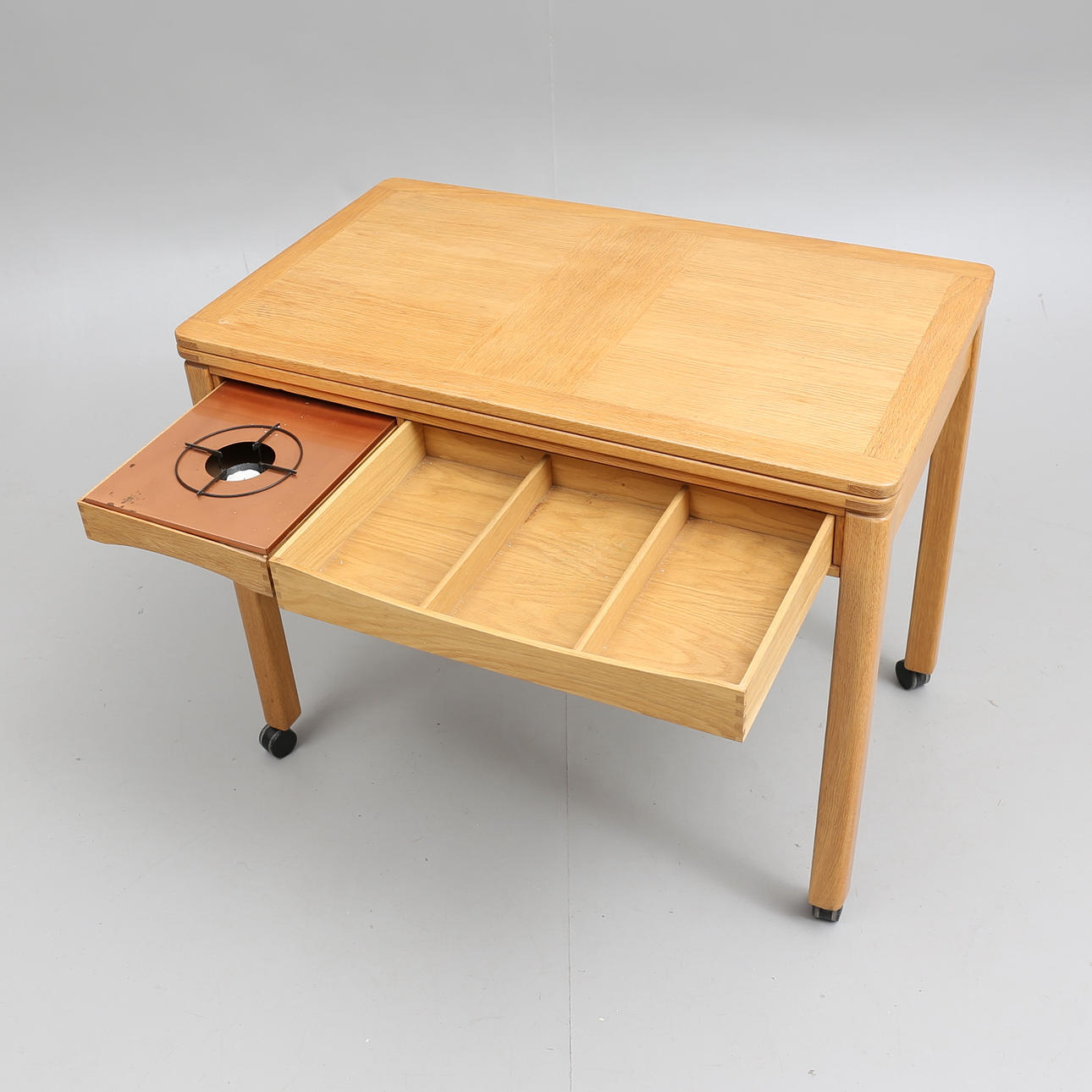 Utfällbar bordsskiva. Utdragbar låda med insats för att hålla mat varm. Längd 85 cm, bredd 50 cm (med utfälld skiva 85 x 100 cm), höjd 67,5 cm.