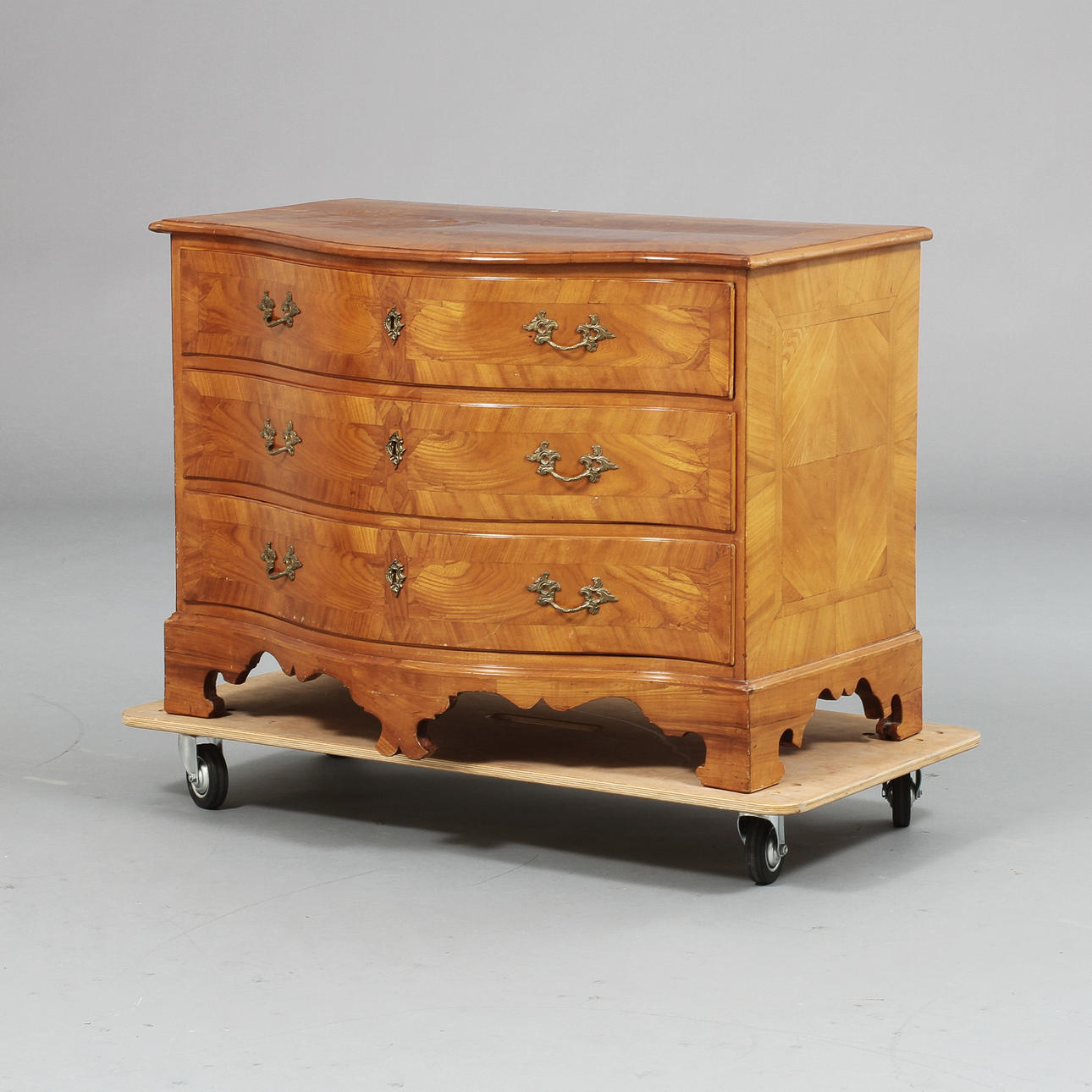 3 lådor, svängd front, längd 106 cm, bredd 62 cm, höjd 75 cm.