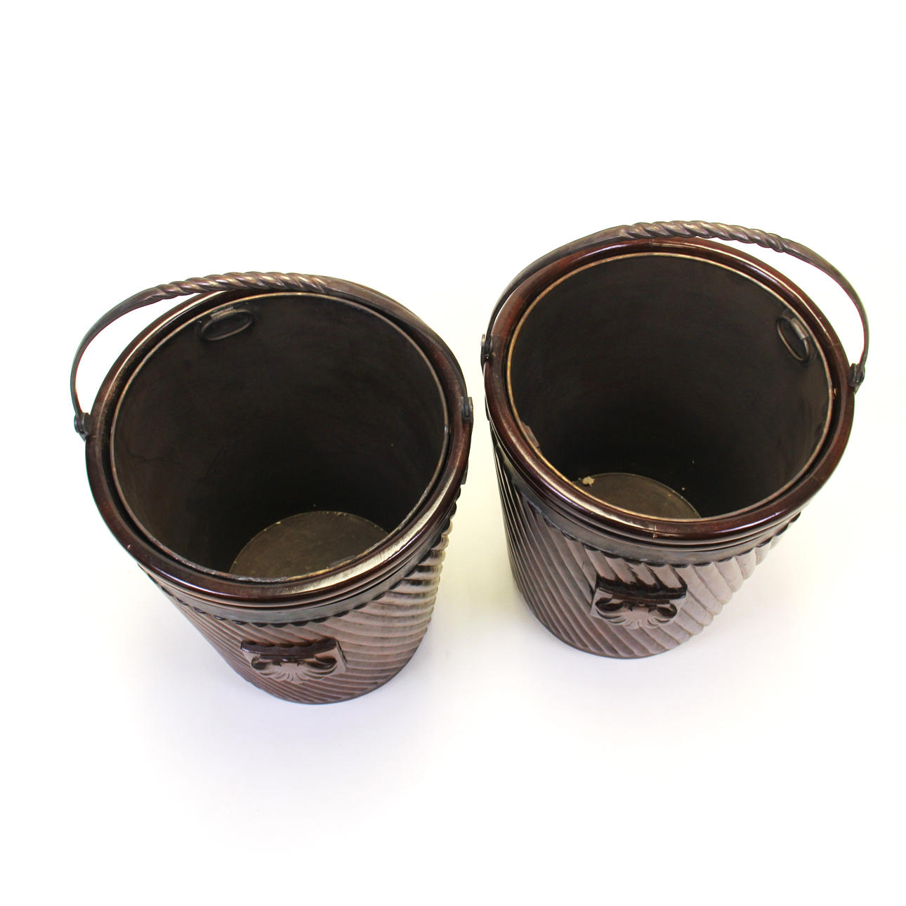 Ett par snidade mahogny metallfodrade torvhinkar, H. 69cm.