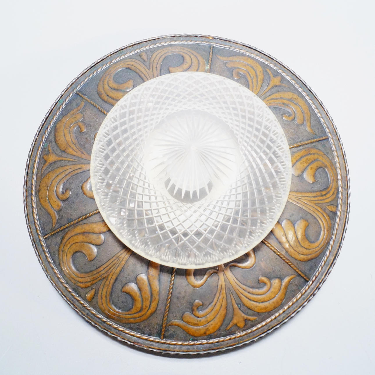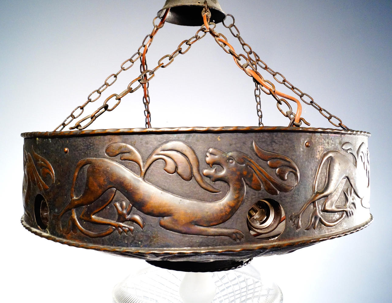Stomme i koppar, kupa i glas. Åtta ljuspunkter. Total höjd 78 cm, enbart lampa 31 cm, diameter 51 cm.