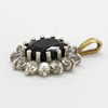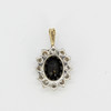 Ett stämplat 9ct gult och vitguld (slitet signallmärke) hänge med ovalslipad safir omgiven av vita stenar, L. 2cm.