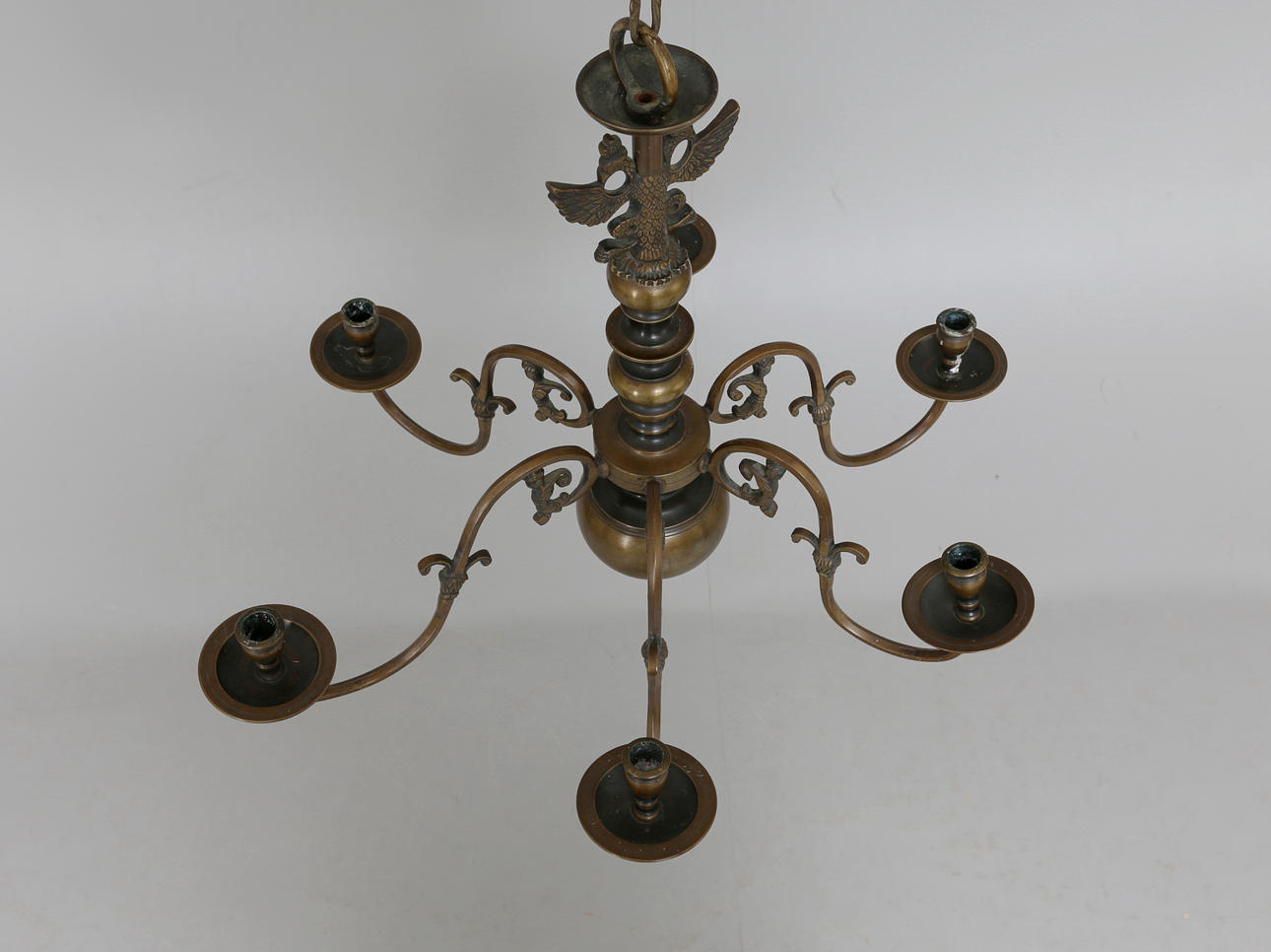 Med sex ljusarmar, dekorerad med tvåhövdad örn samt maskaroner.