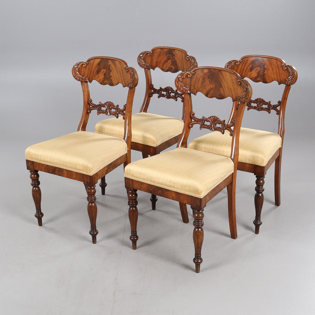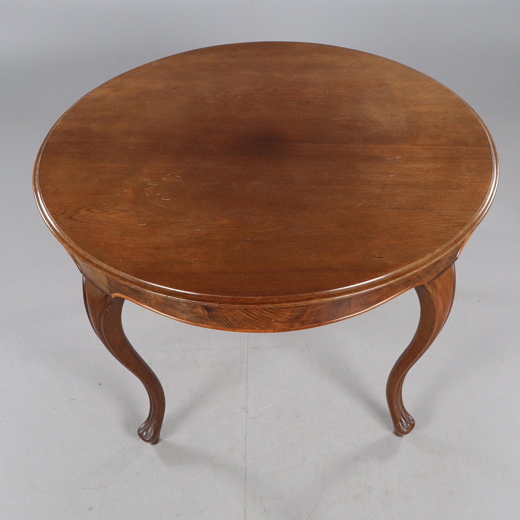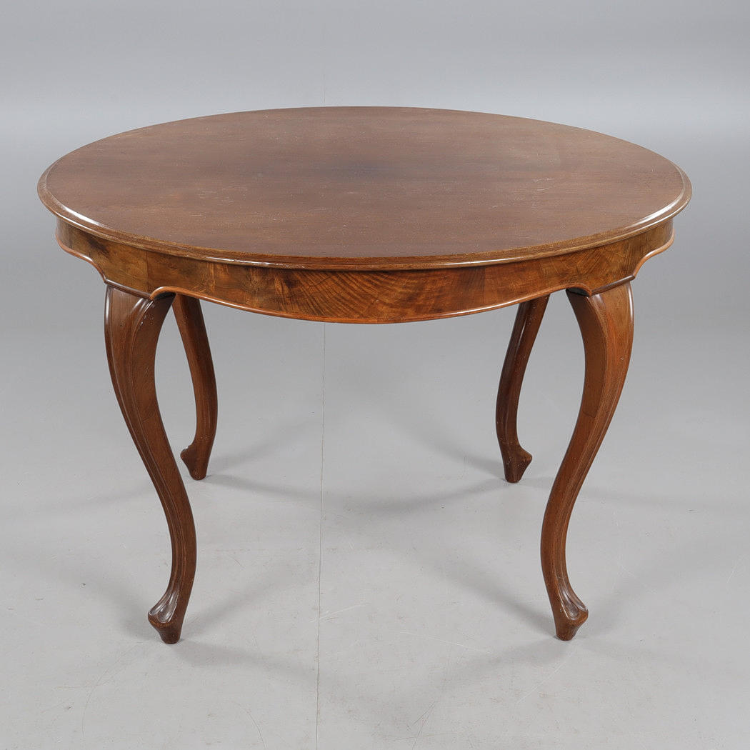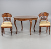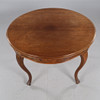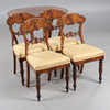 Fanerat och betsad, bord ca höjd 73, diameter 110 cm, stolar med fast stoppad sits, sitthöjd ca 47 cm.