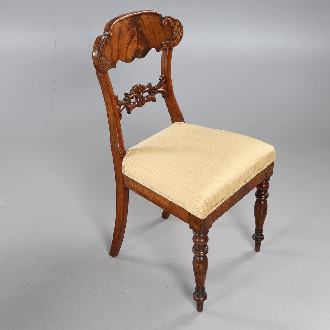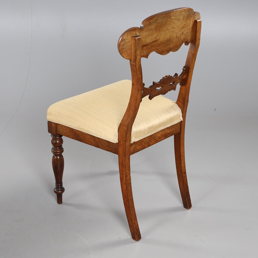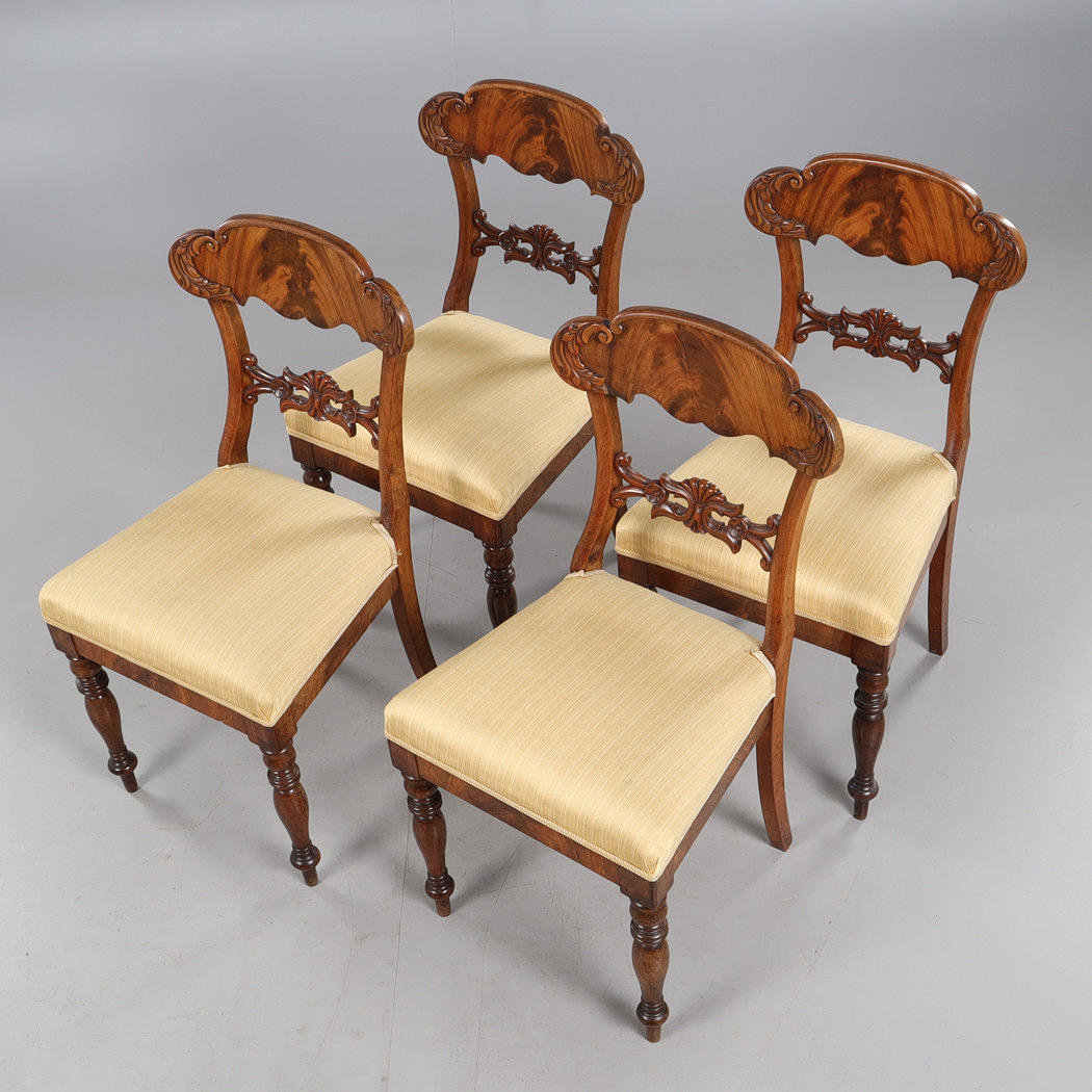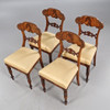 Fanerat och betsad, bord ca höjd 73, diameter 110 cm, stolar med fast stoppad sits, sitthöjd ca 47 cm.