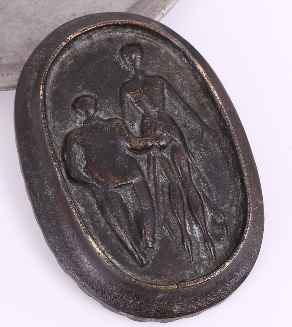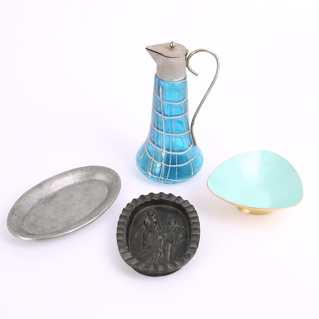 301558. METALLFÖREMÅL 3 st + GLASKANNA jugend.