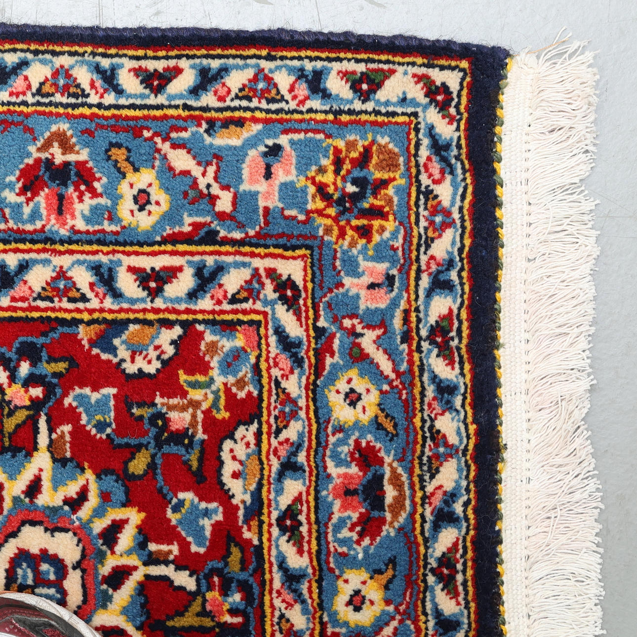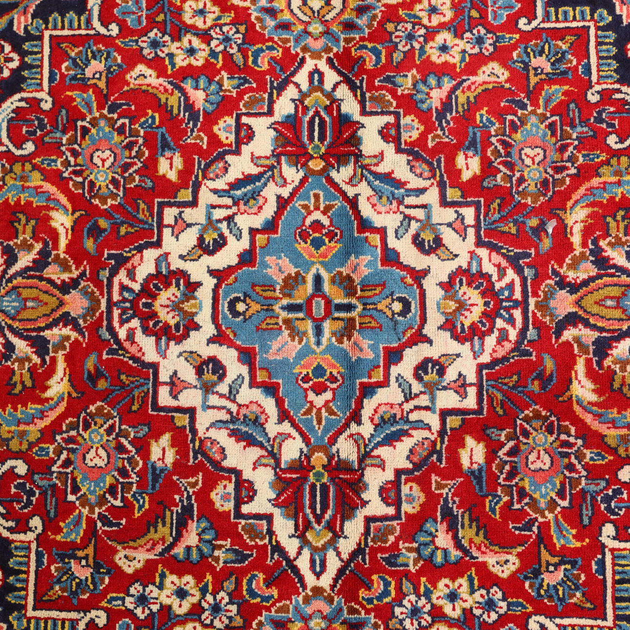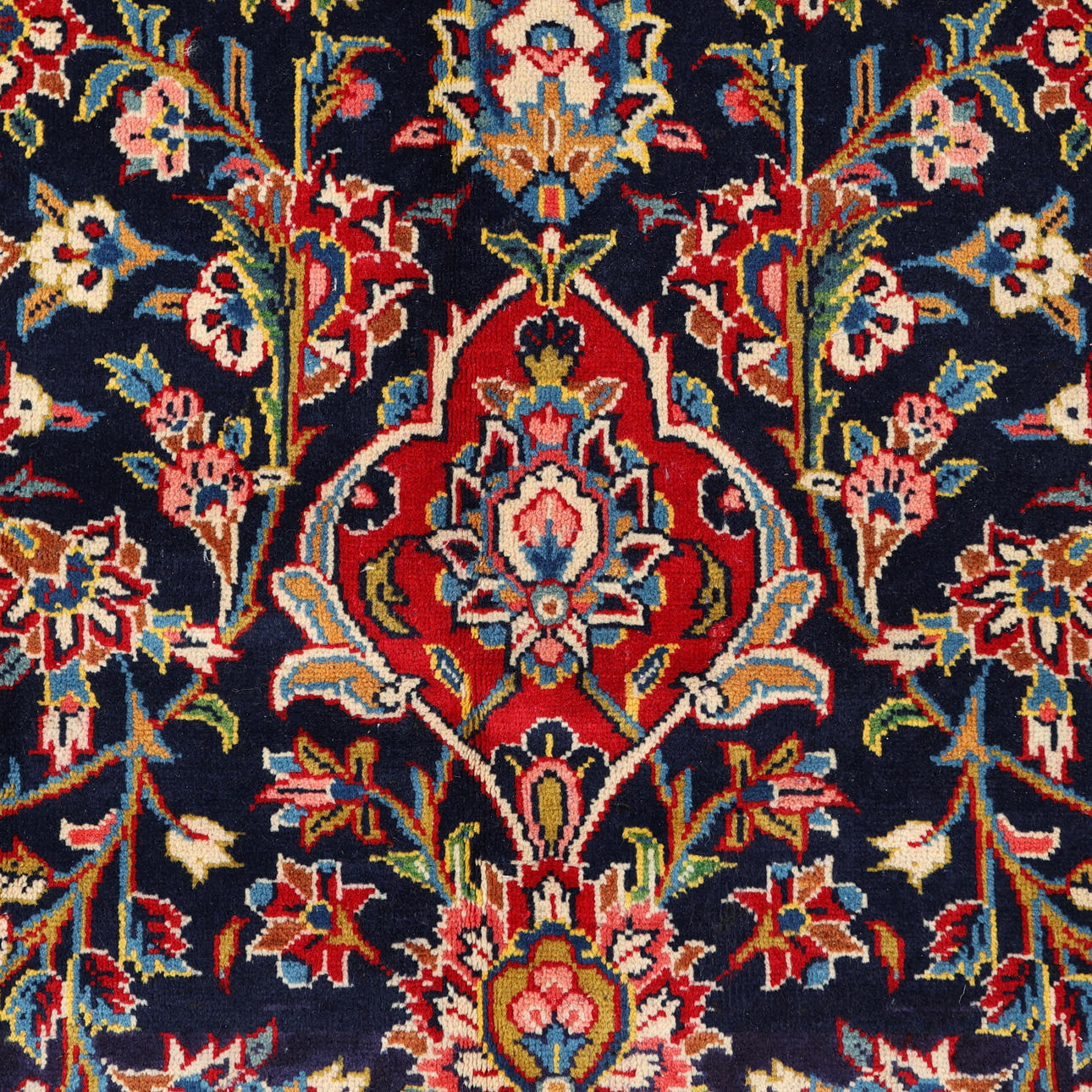 Handknuten persisk matta i ull på bomullsvarp, linsformad medaljong på övermönstrad blå botten.