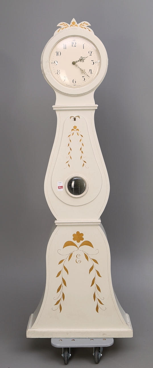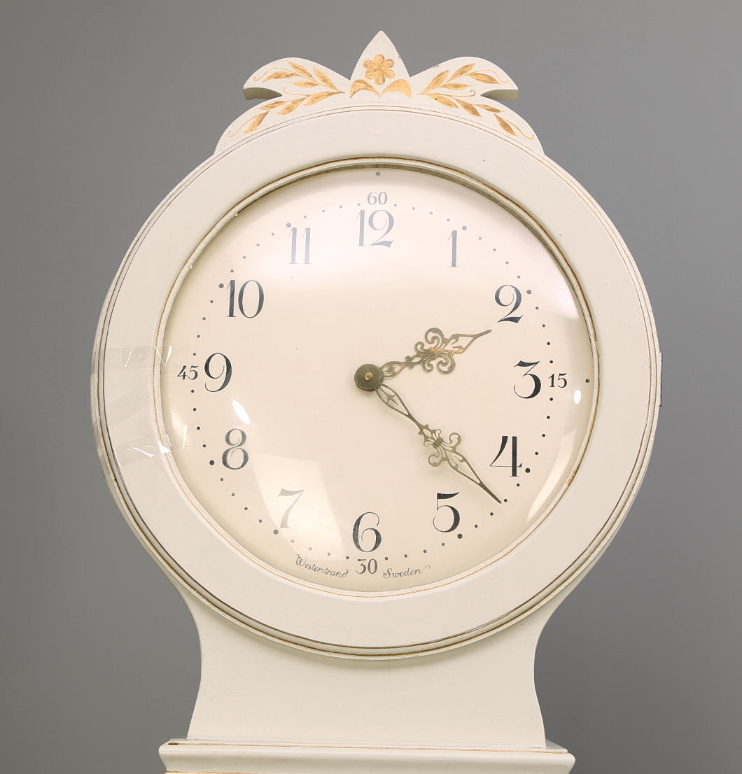 Westerstrand urverk. Vitmålad med gulddekor. Höjd 200 cm.