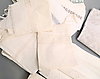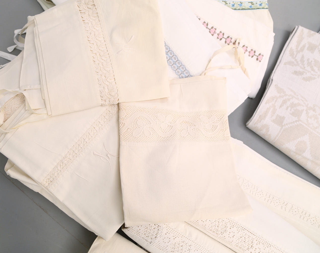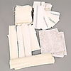 24 örngott, spetskantade/ broderade/hålsöm, monogram. 11 överlakan, bandkantade/spetskantade, monogram. Duk linnedamast, naturvit/beige.