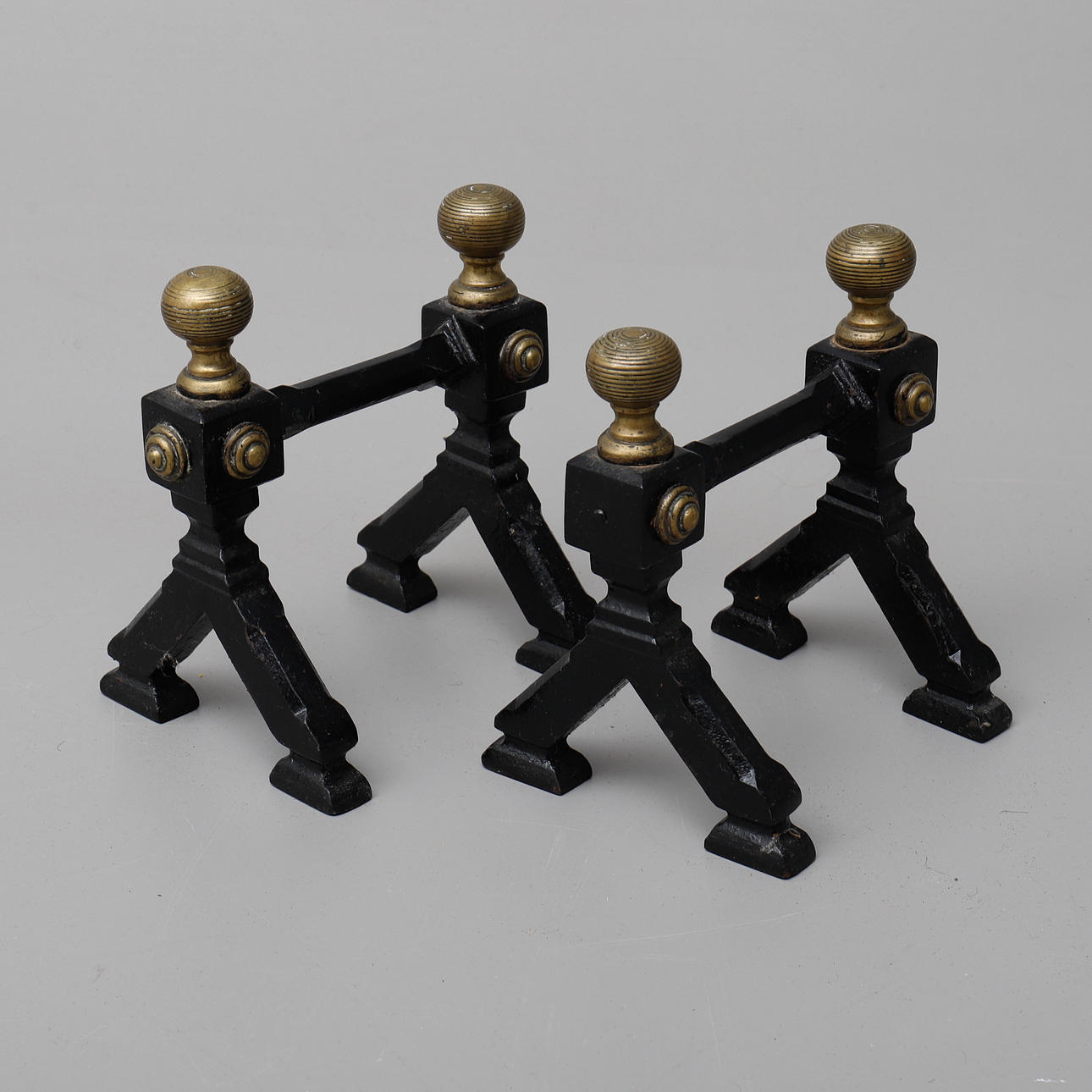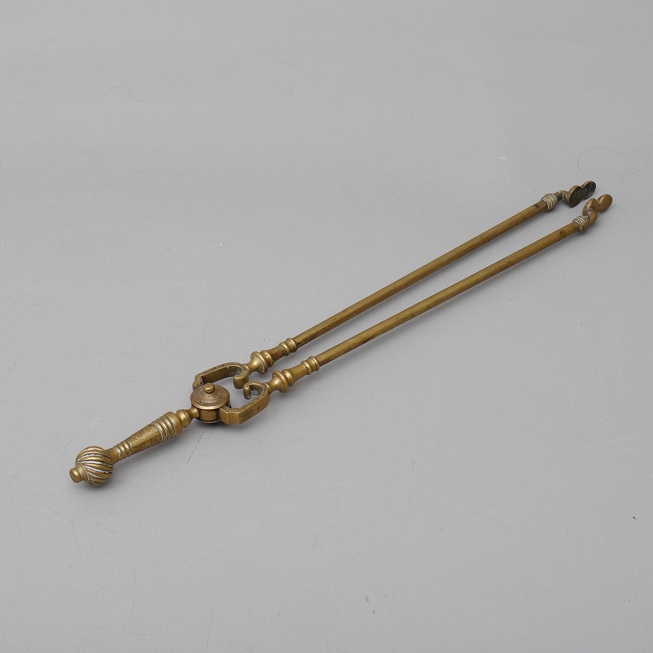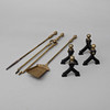 Mässing och gjutjärn, 1800-talet: ett par eldhudar, 1 spade, 1 tång och 1 spett, längd 20-73 cm höjd 22 cm.