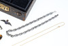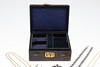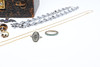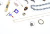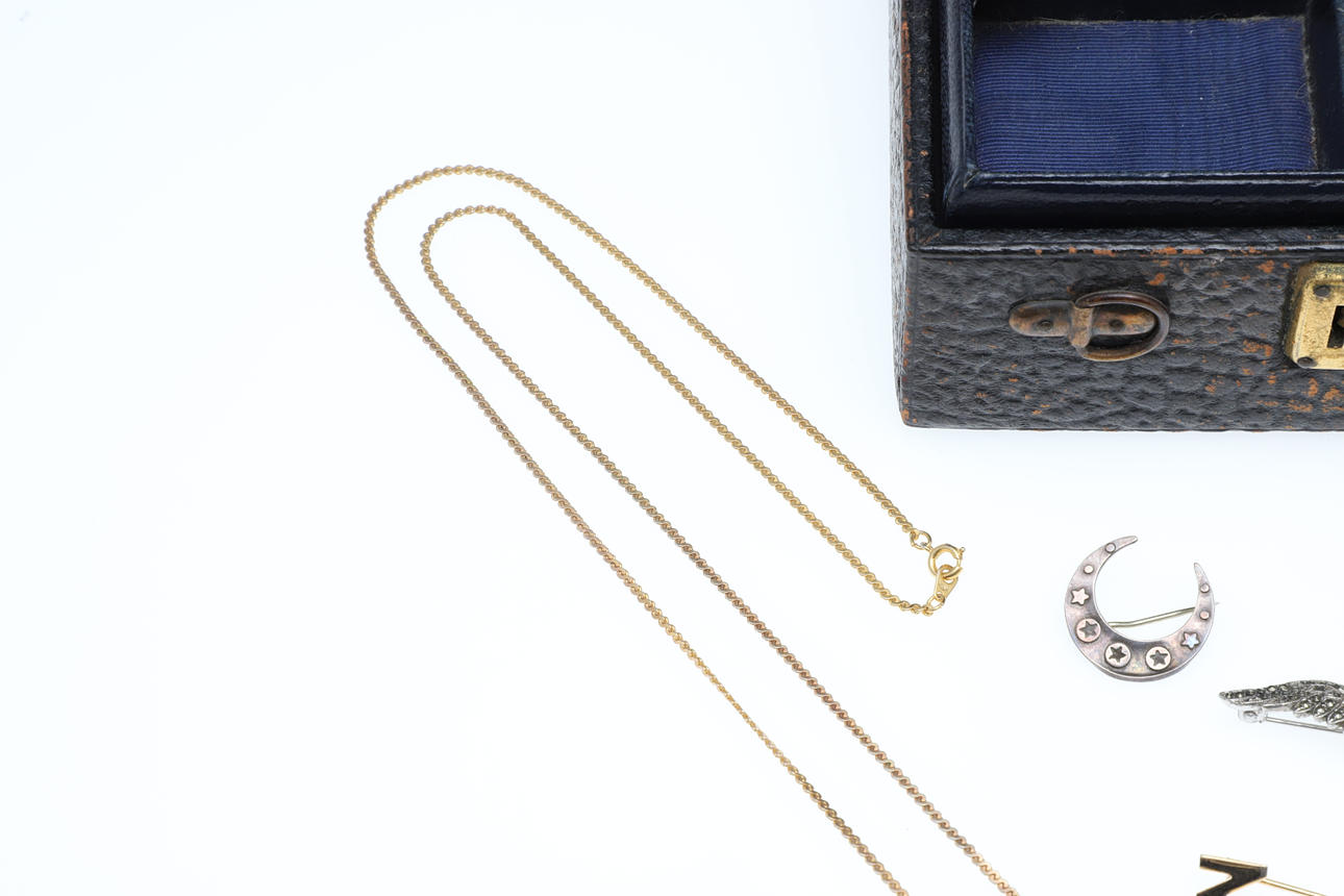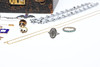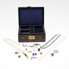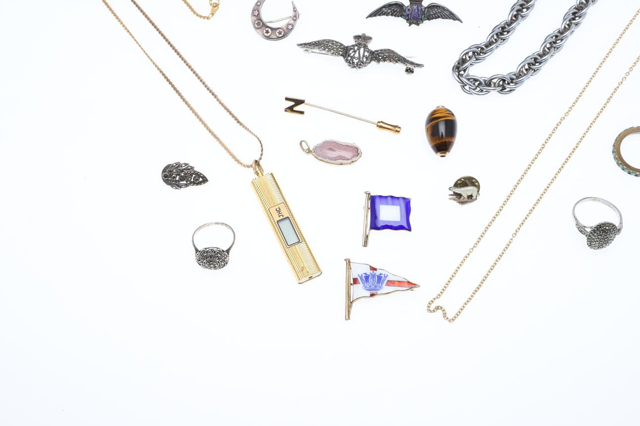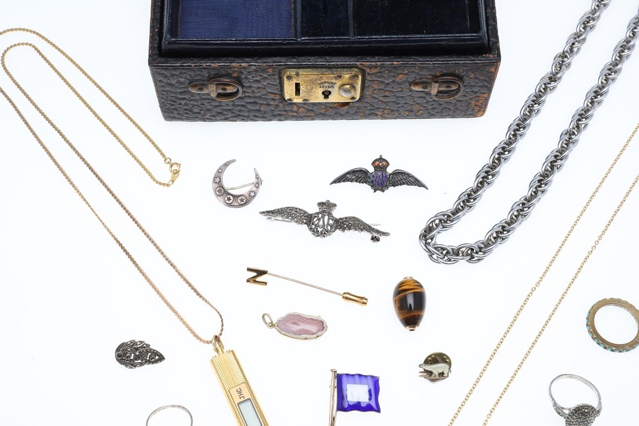 Inklusive en halvmånebrosch i silver, två RAF-vingbroscher, två emaljvimpelbroscher, ett tigerögonägg, ringar etc; lådan 6,25 ”(16 cm) lång.