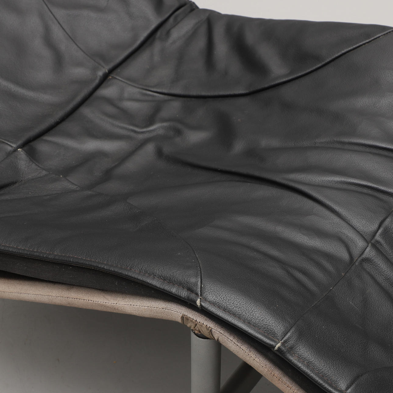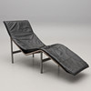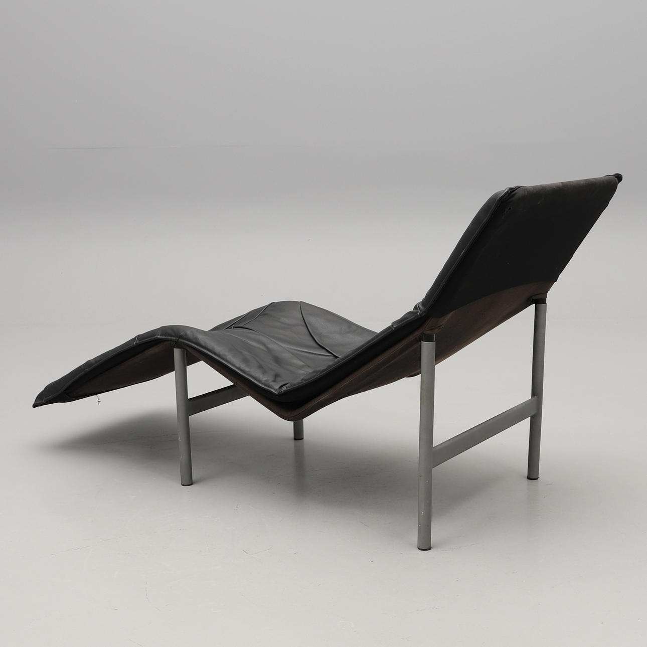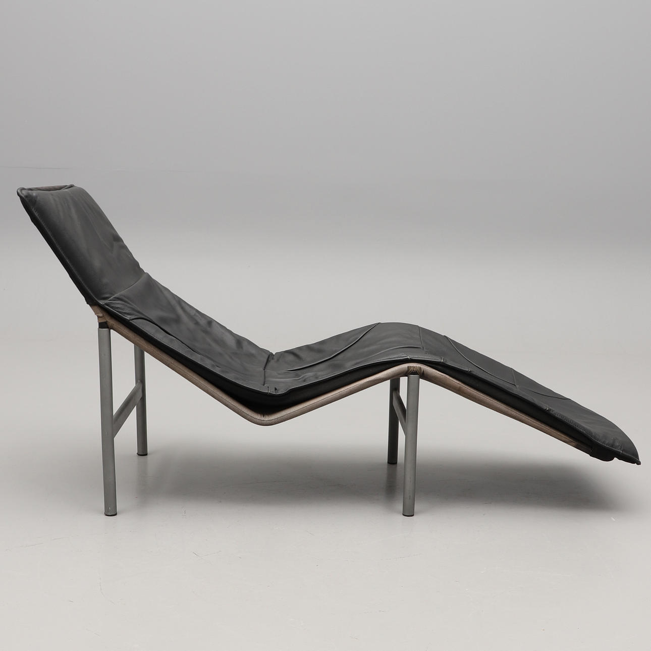 Grålackerad metallstomme, svängd stoppad dyna klädd i svart skinn. Längd c:a 160, bredd 67 cm.