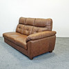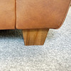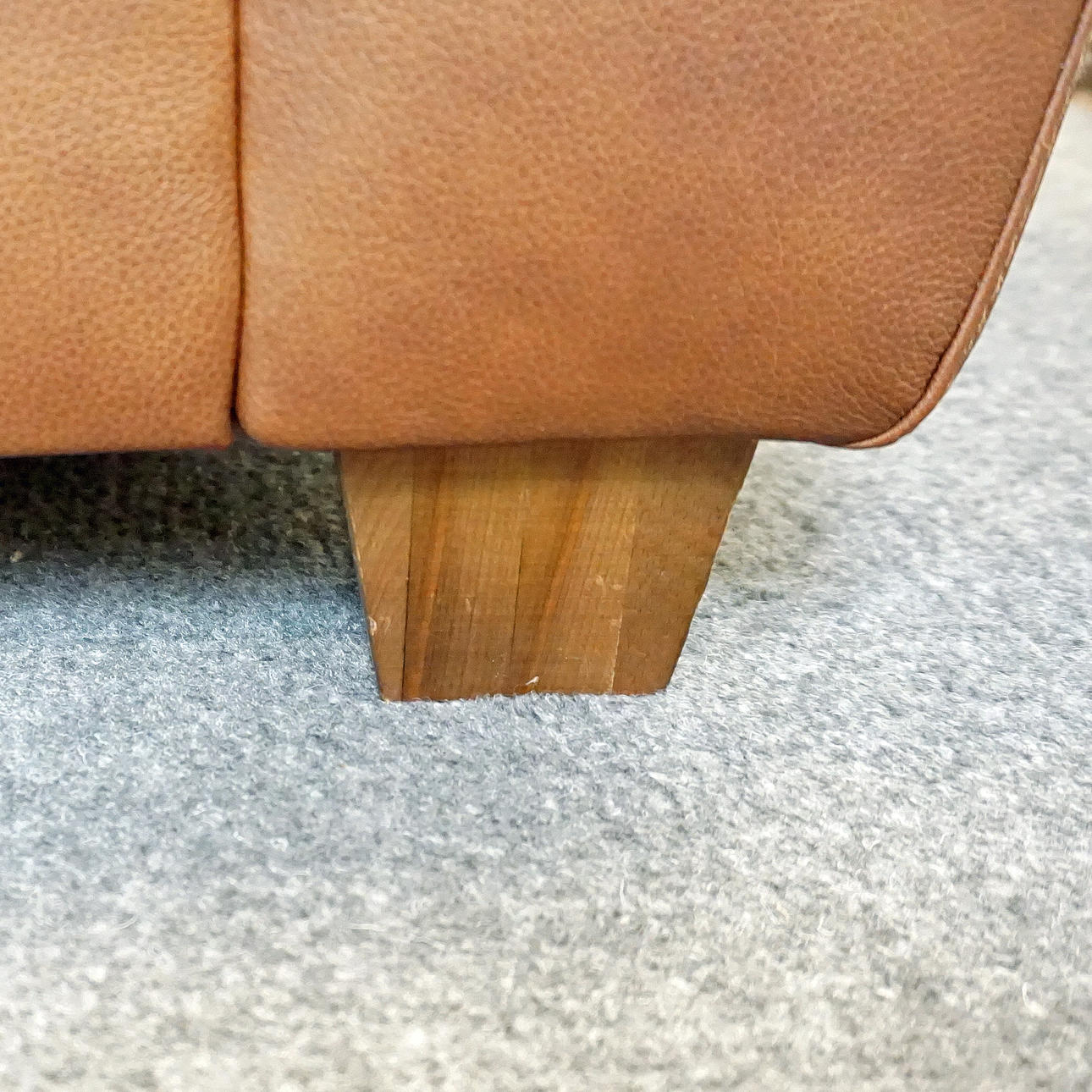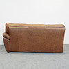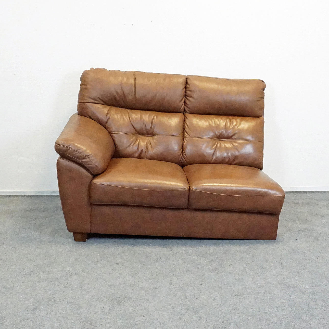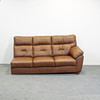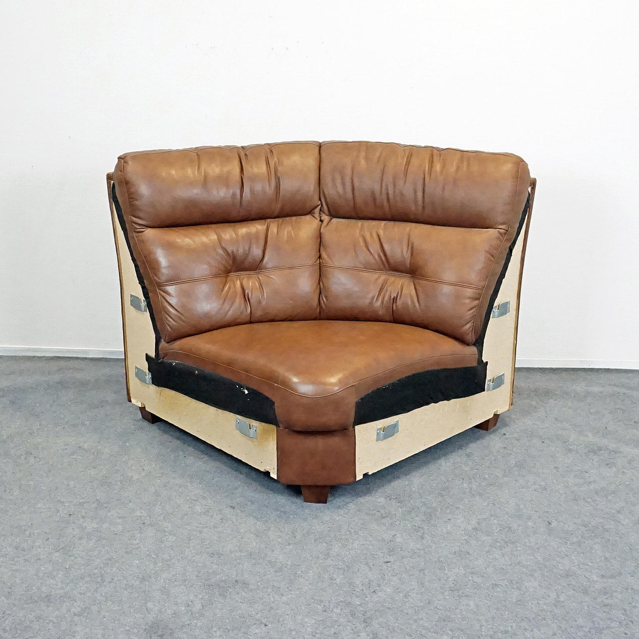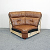 Svängd soffa i brunt skinn med stoppade dynor, ej löstagbara. Tre sektioner.