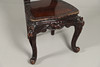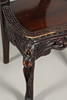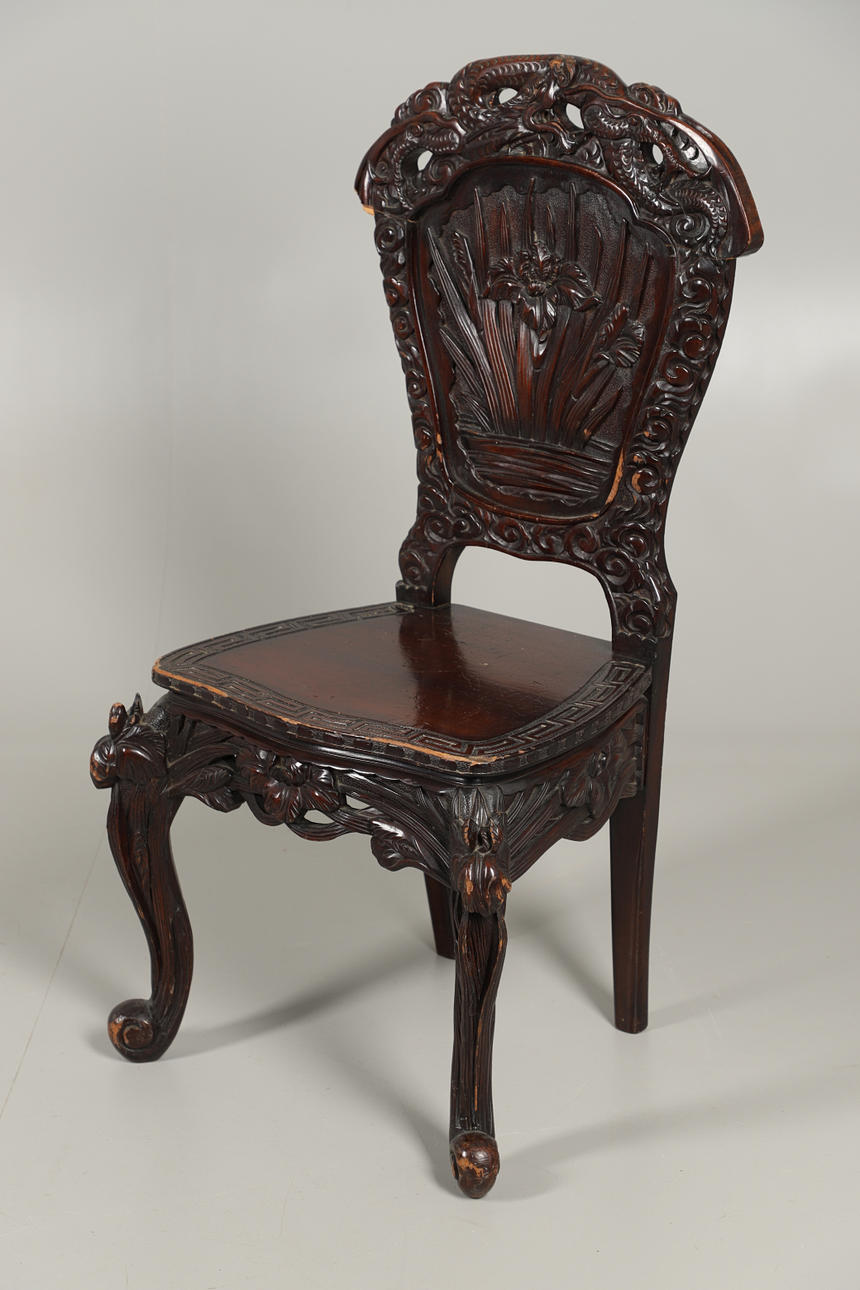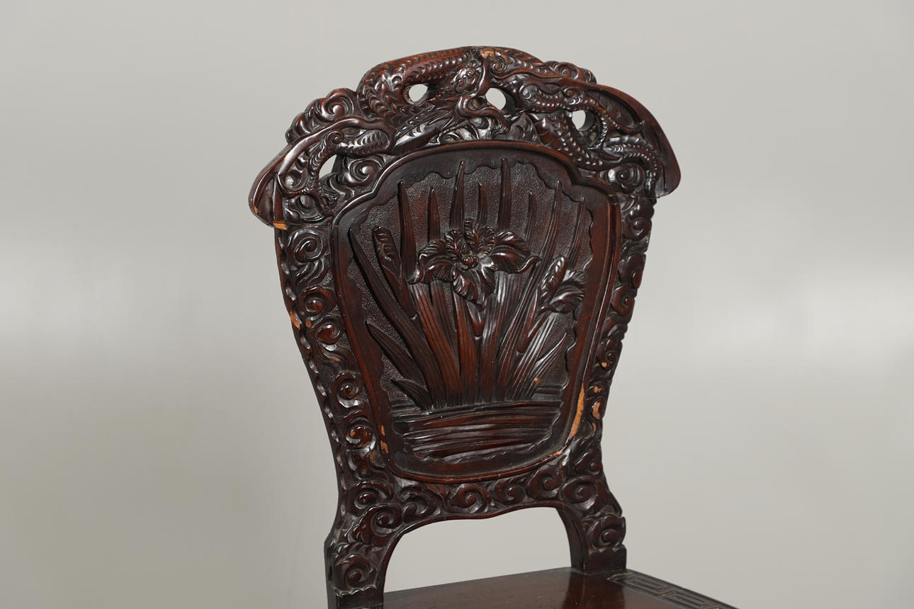 En dekorativ japansk hallstol, toppskenan vårdad och genomborrad med en rullande drake, panelen snidad i relief med iris, ovanför ett fast säte, på liknande ben och sätesskena. 98cm hög, 53cm bred.