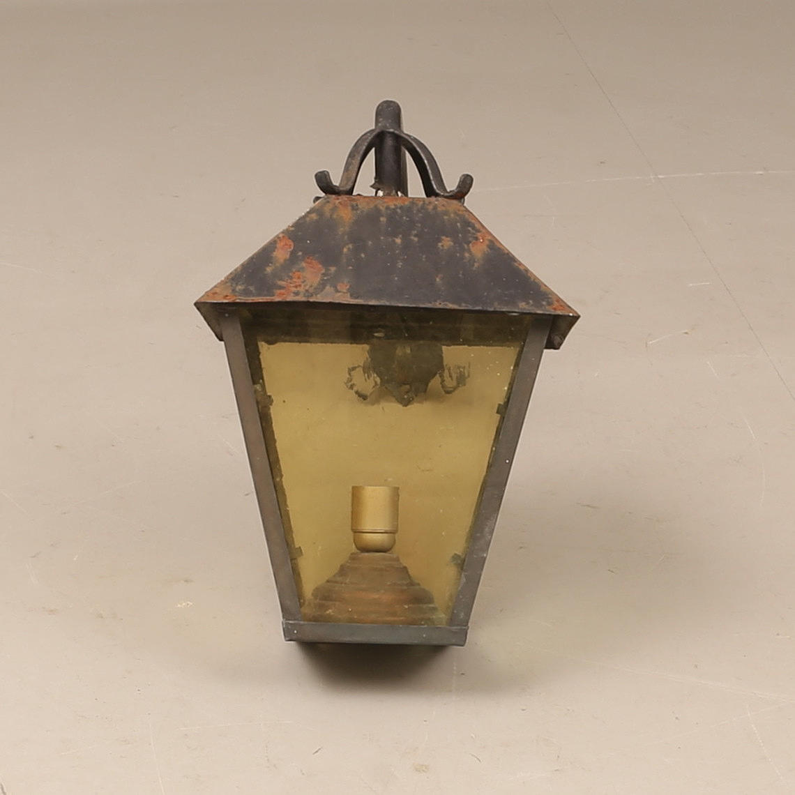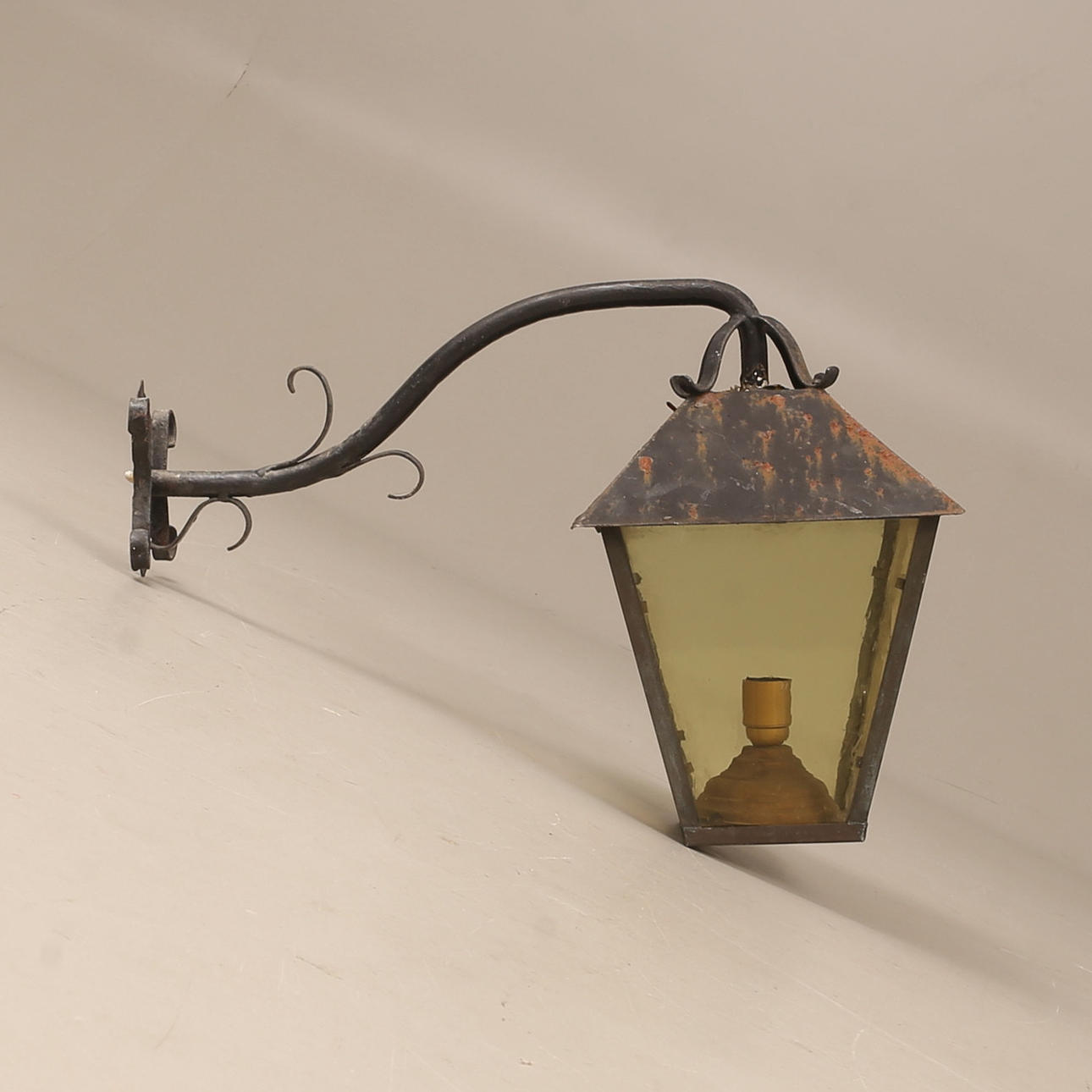 Bemålad plåt. Armens längd inklusive lykta ca 65 cm. Lyktans höjd ca 40 cm.
