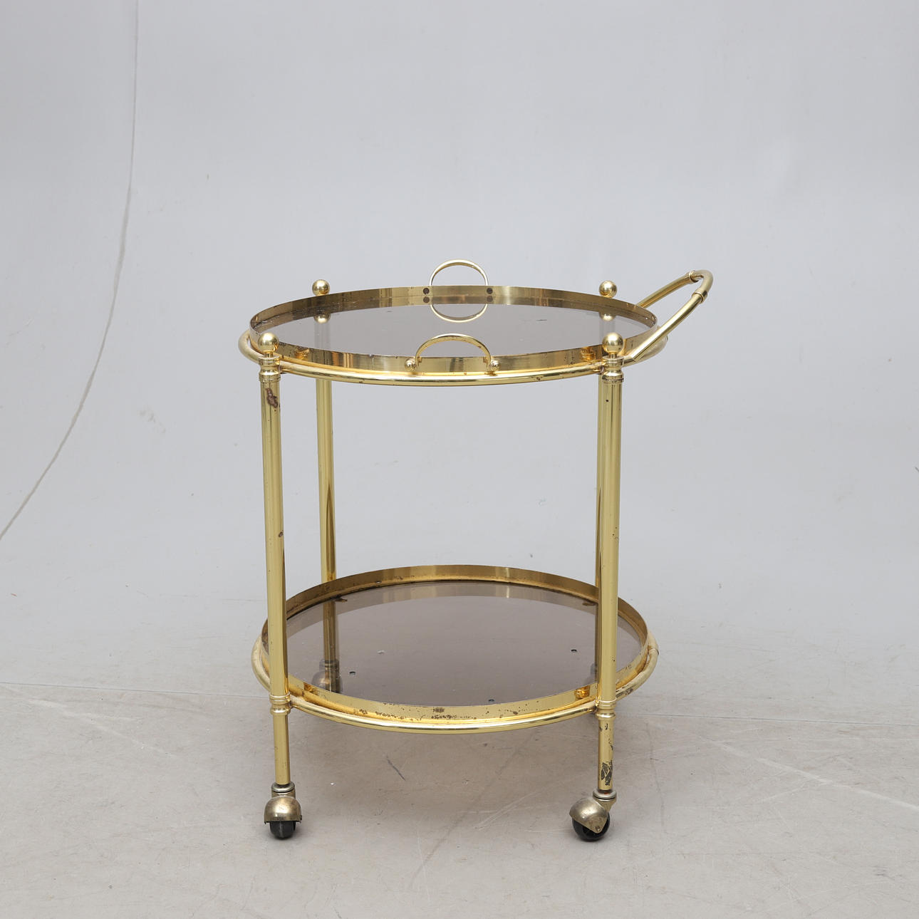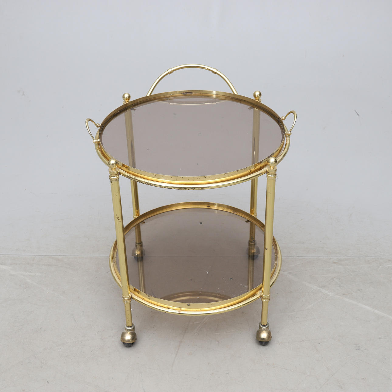 Gulmetall. Glasskivor. Löstagbar bricka. Längd ca 58, bredd 56, höjd 65 cm.