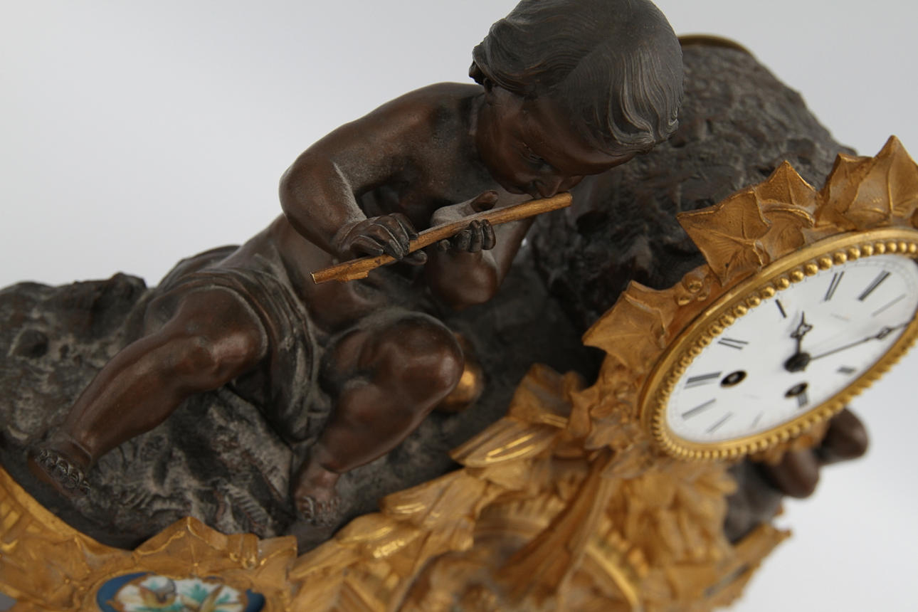 Nyrokoko, 1800-talets slut. Mässing samt porslin. Dekor av puttis. Längd 52, höjd 28 cm.