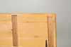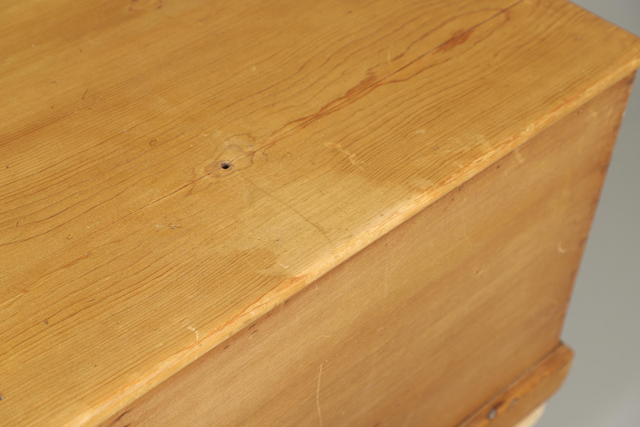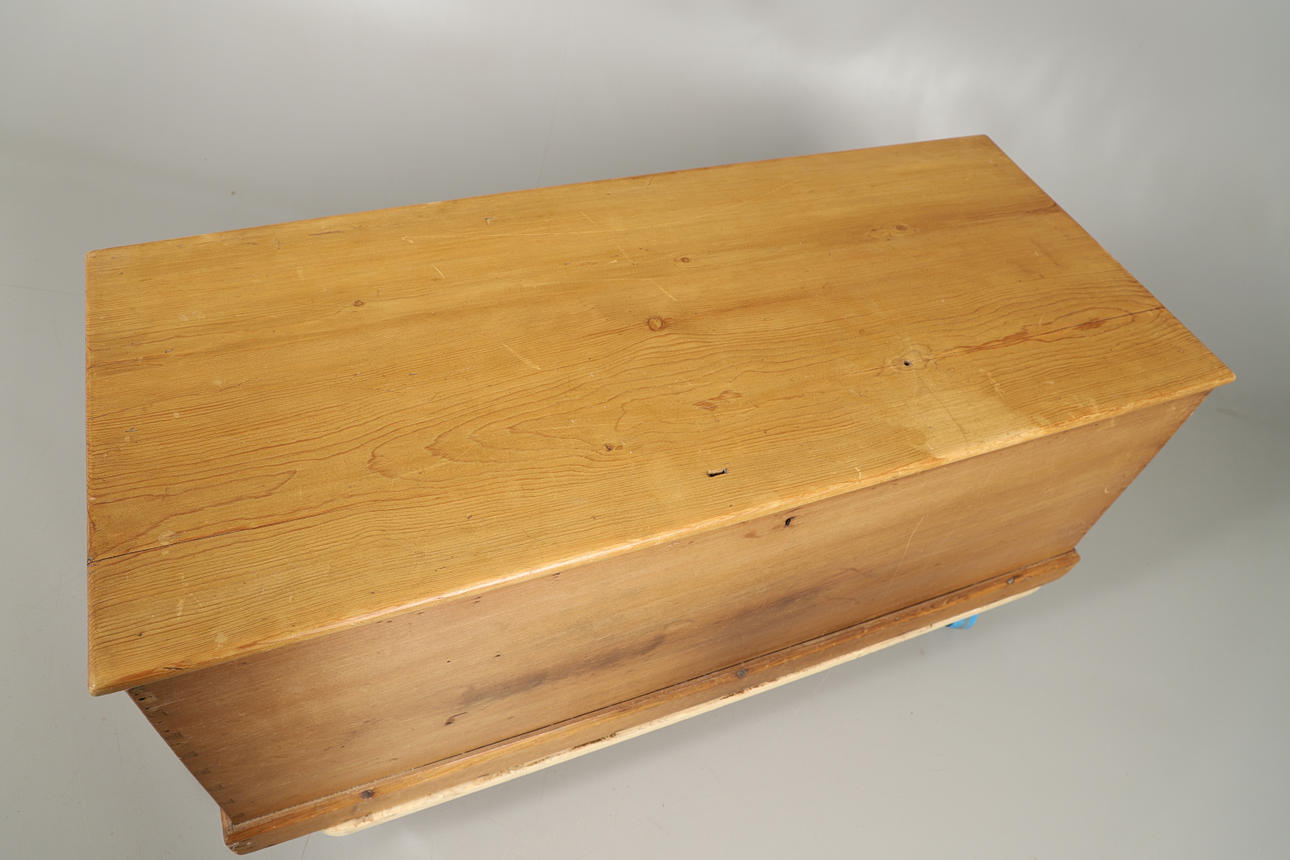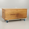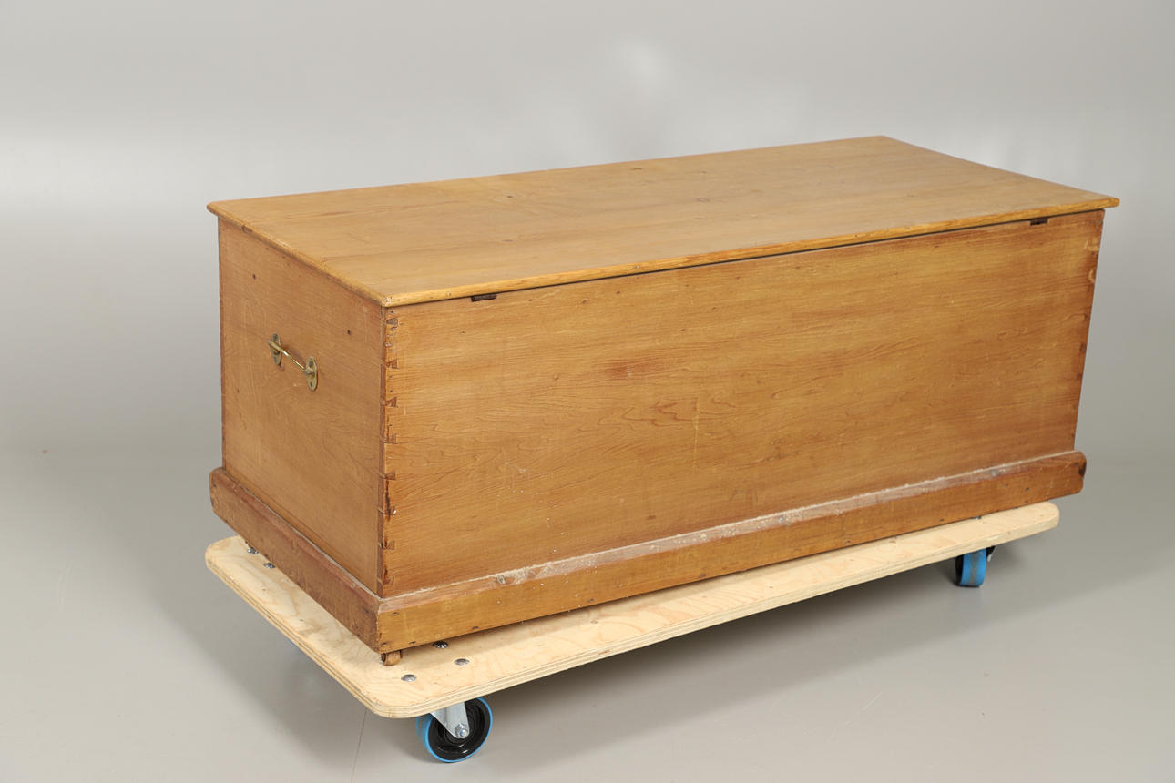 Med en rektangulär topp ovanför raka sidor med synliga fogar, på sockelbotten och hjul, med dubbla mässingsbärhandtag. 51cm hög topp 125 x 53cm.