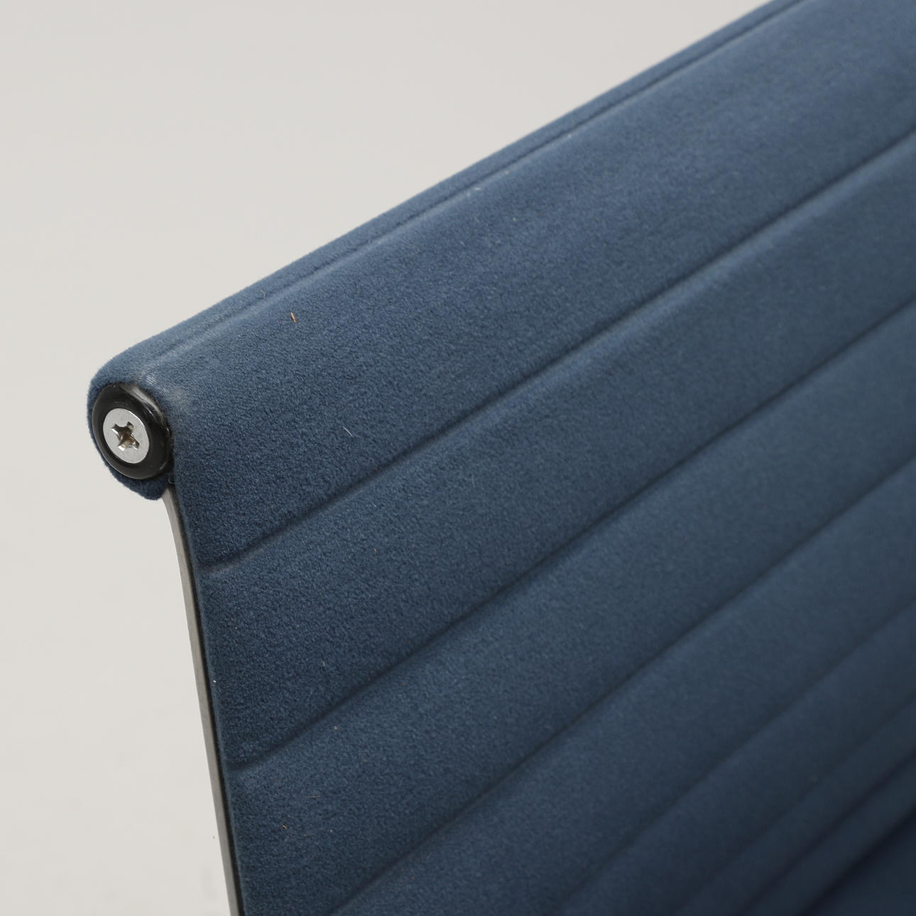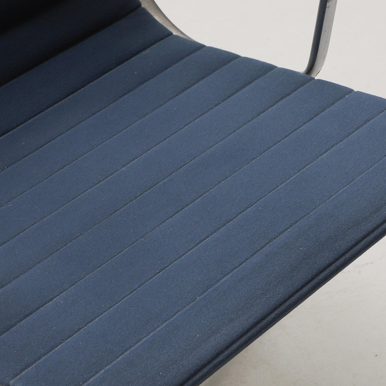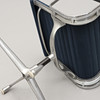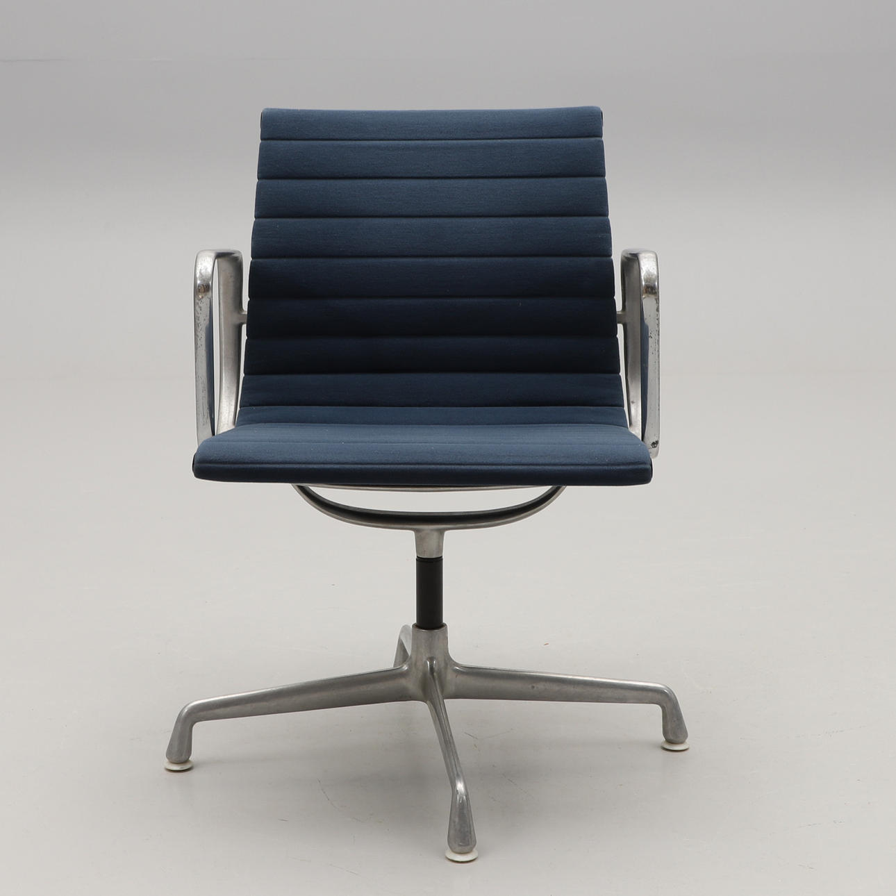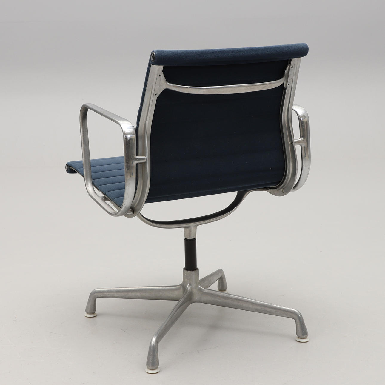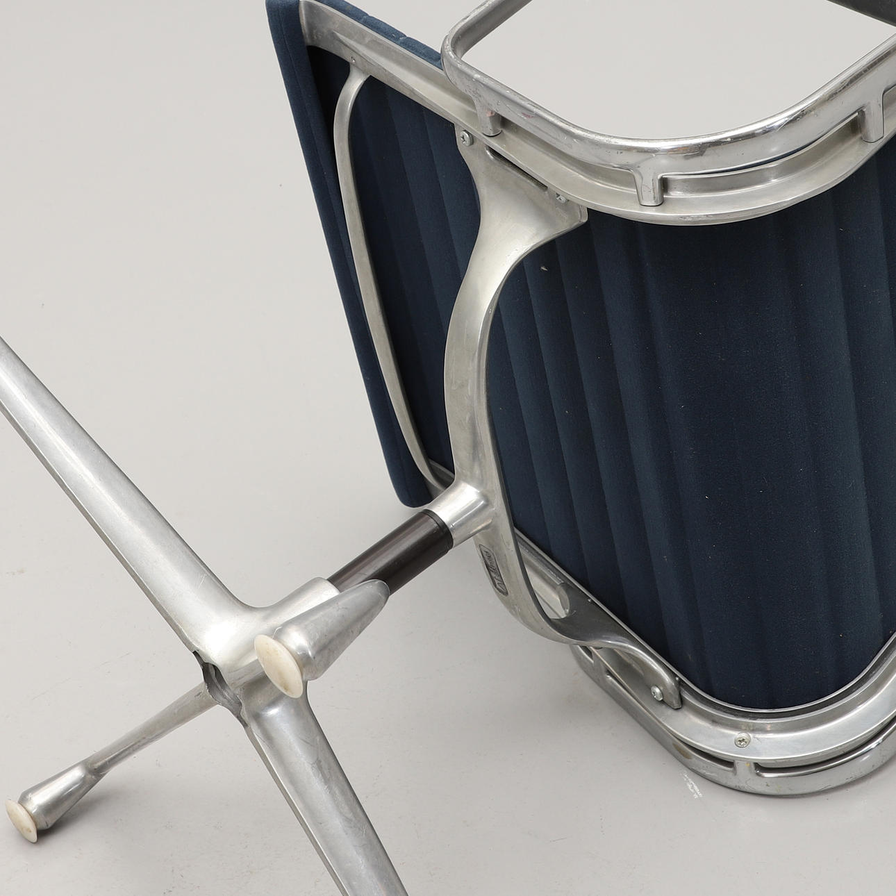 Aluminium, sits och rygg i blågrå textil. Fyrdelad snurrbar fot. Bredd 55 cm.