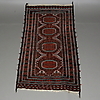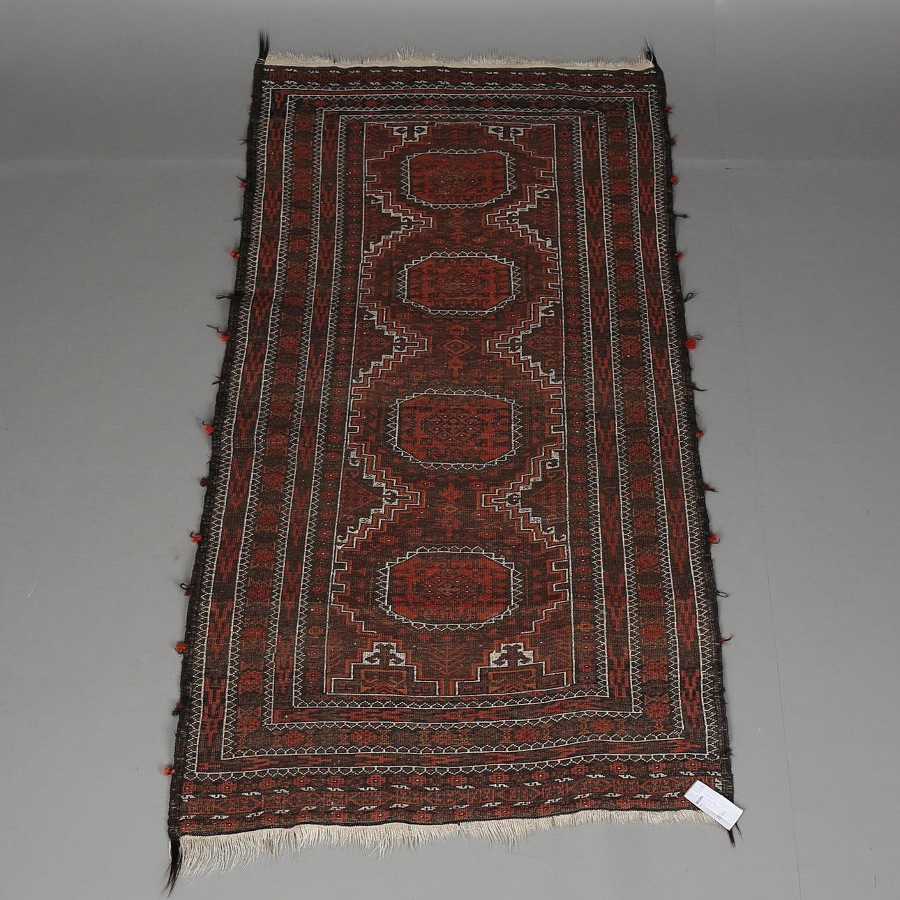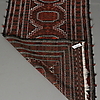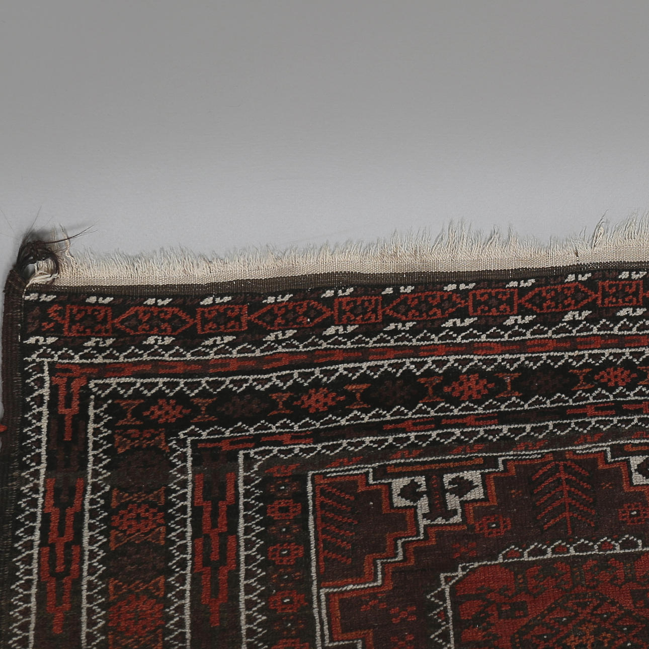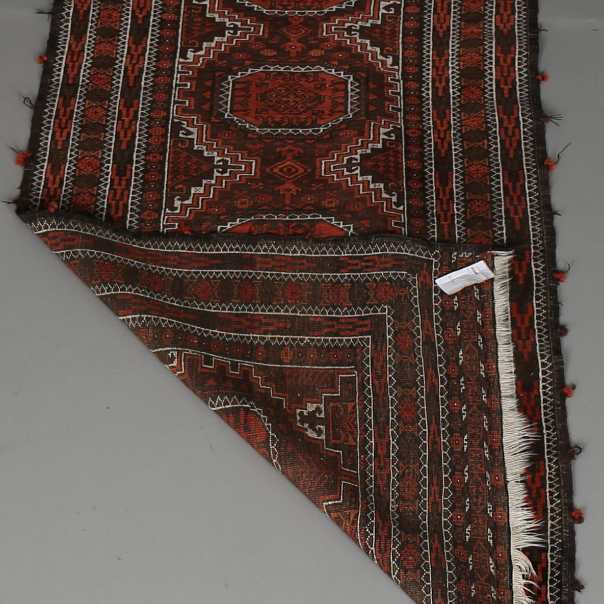 Matta med geometrisk dekor i brunt,svart, vita mot roströdbotten.