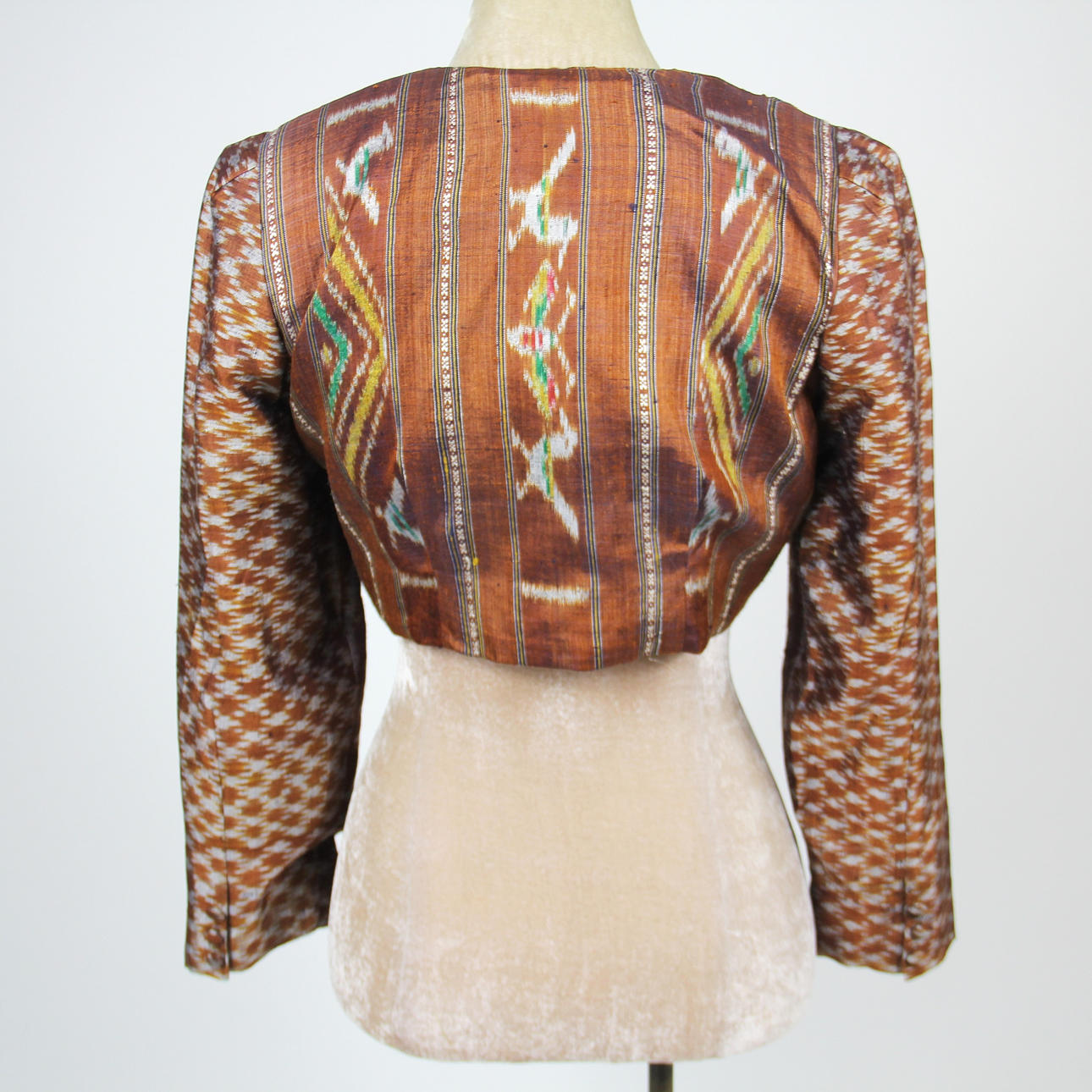 En aztekisk beskuren jacka med vadderade axlar, axel till axel 42cm. L. 37 cm. grop till grop 42cm.
