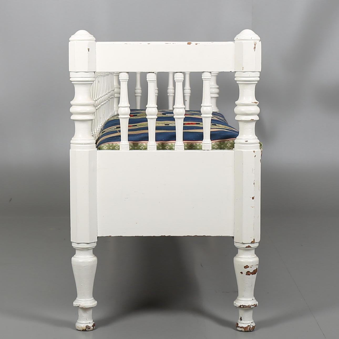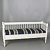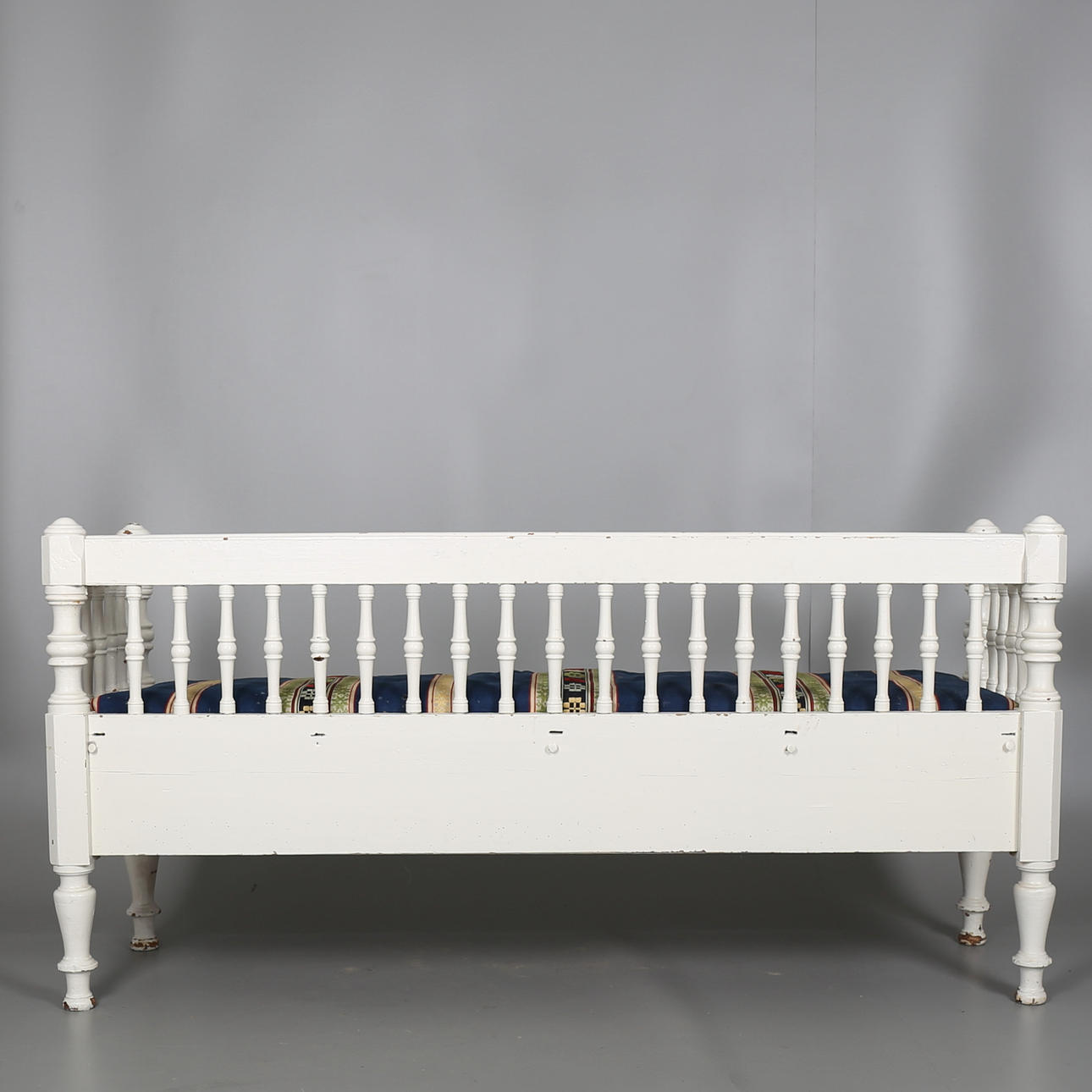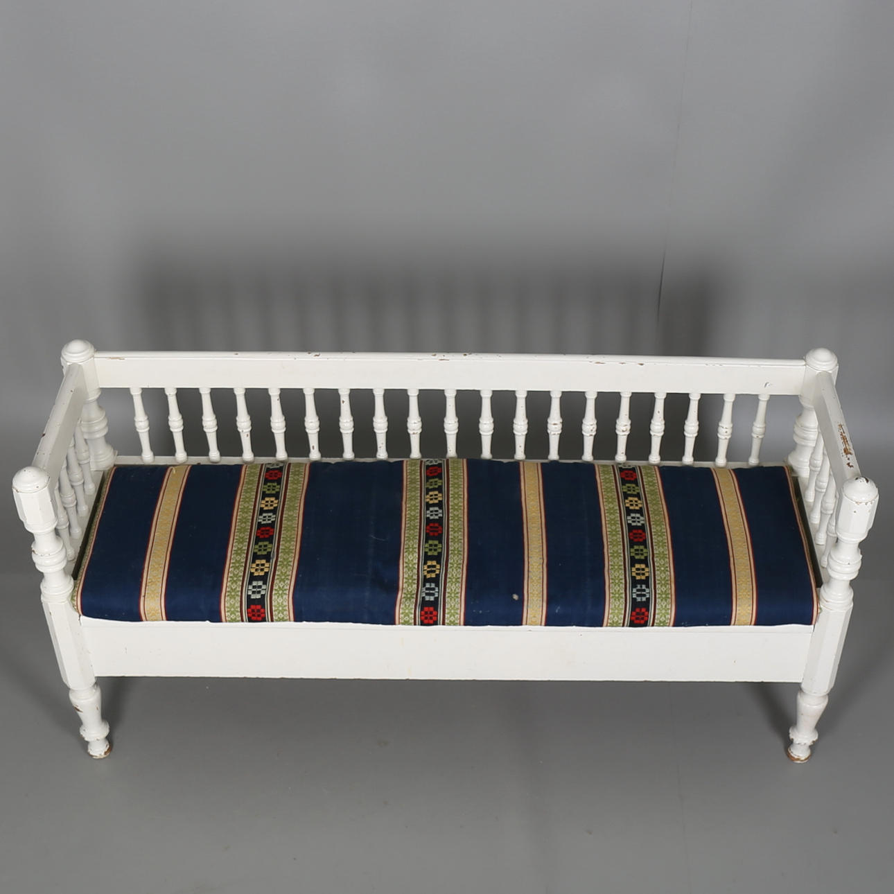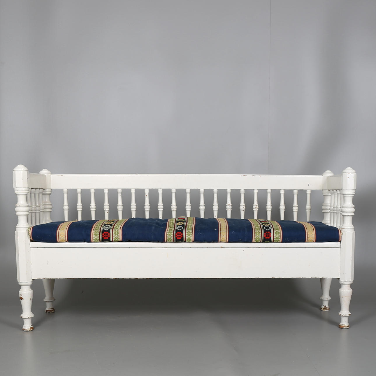 Genombruten ryggbricka Möbelspikad klädsel Stoppad lös sittdyna med vävt ylletyg Höjd 66 cm Längd 137 cm Sittdjup 63 cm.