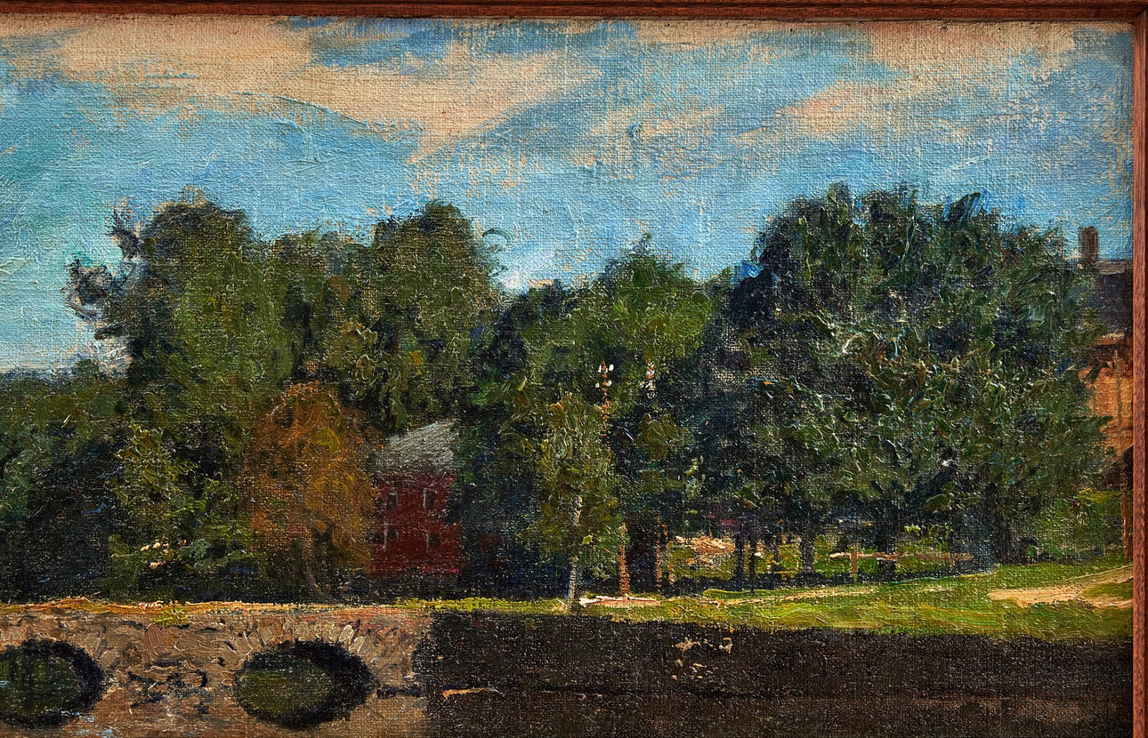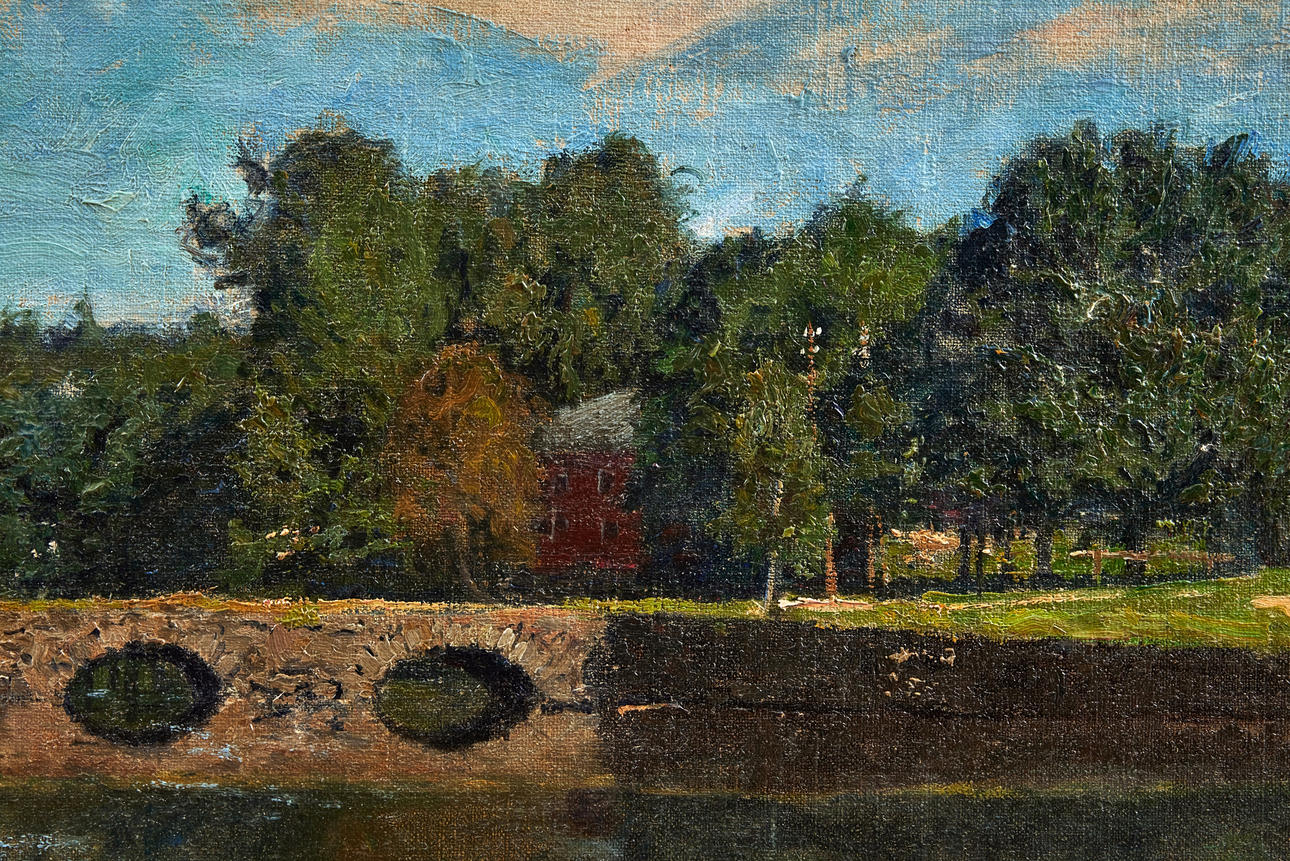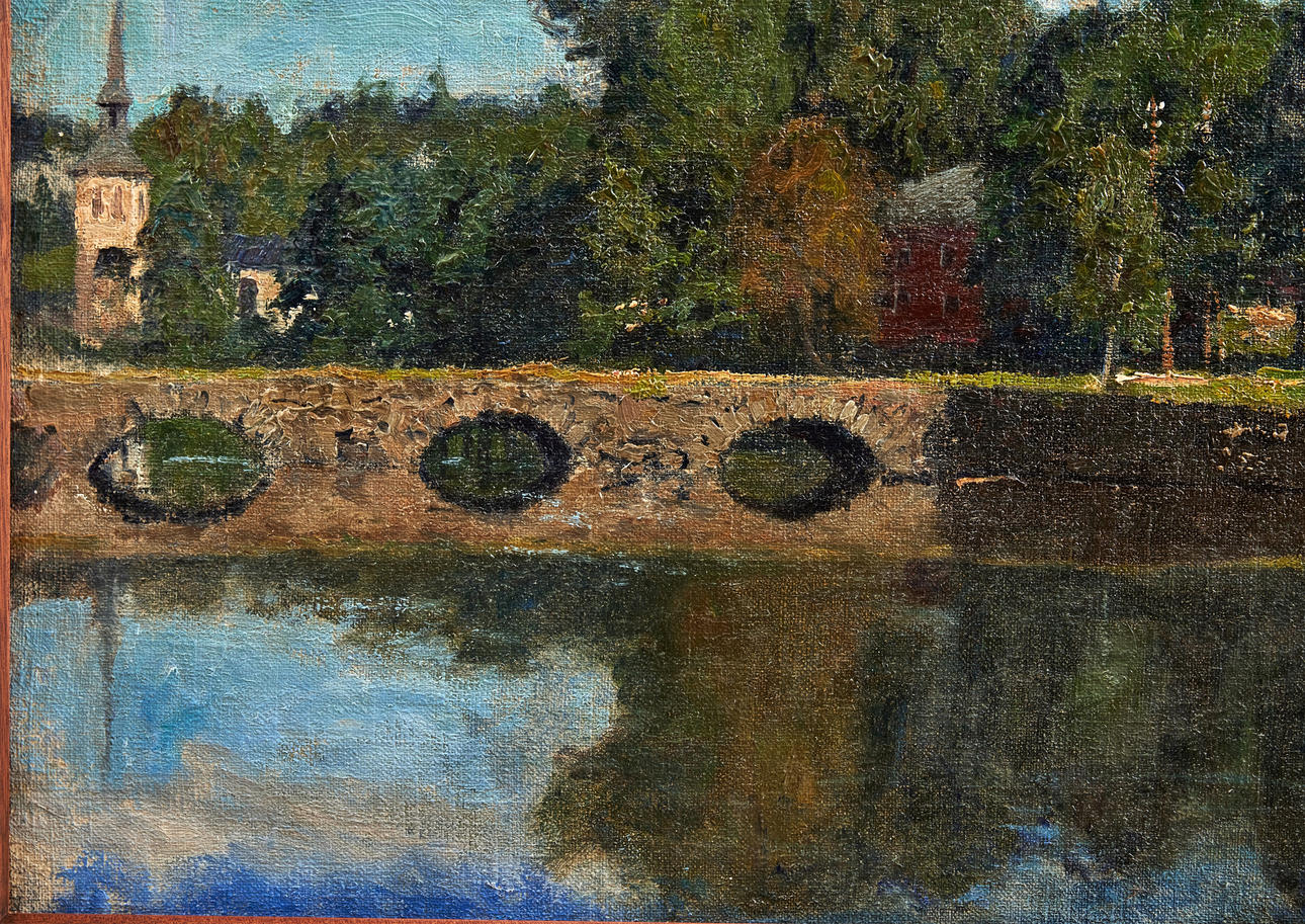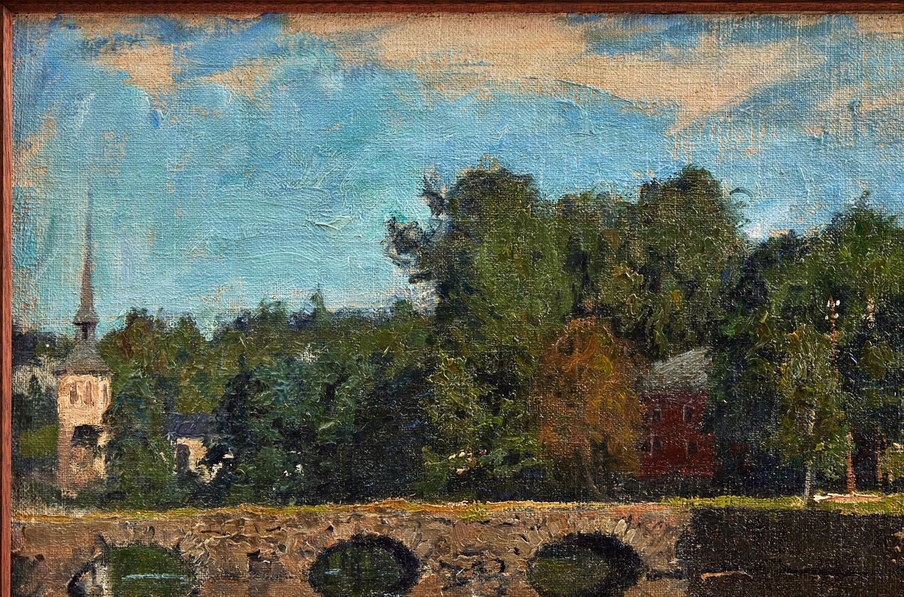Utförd i september 1909. Förarbete till en av två målningar i olika belysningar beställda av Claes Ericsson (f. 1877), disponent och direktör vid Rydboholms textilfabrik, Borås. Hans förfader, Sven Erikson (1801-1866), grundade textilindustrin i Rydboholm.