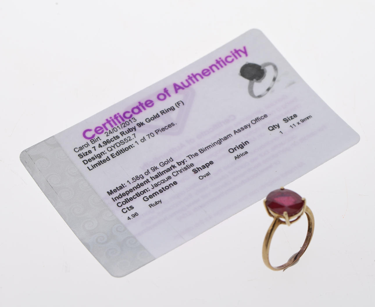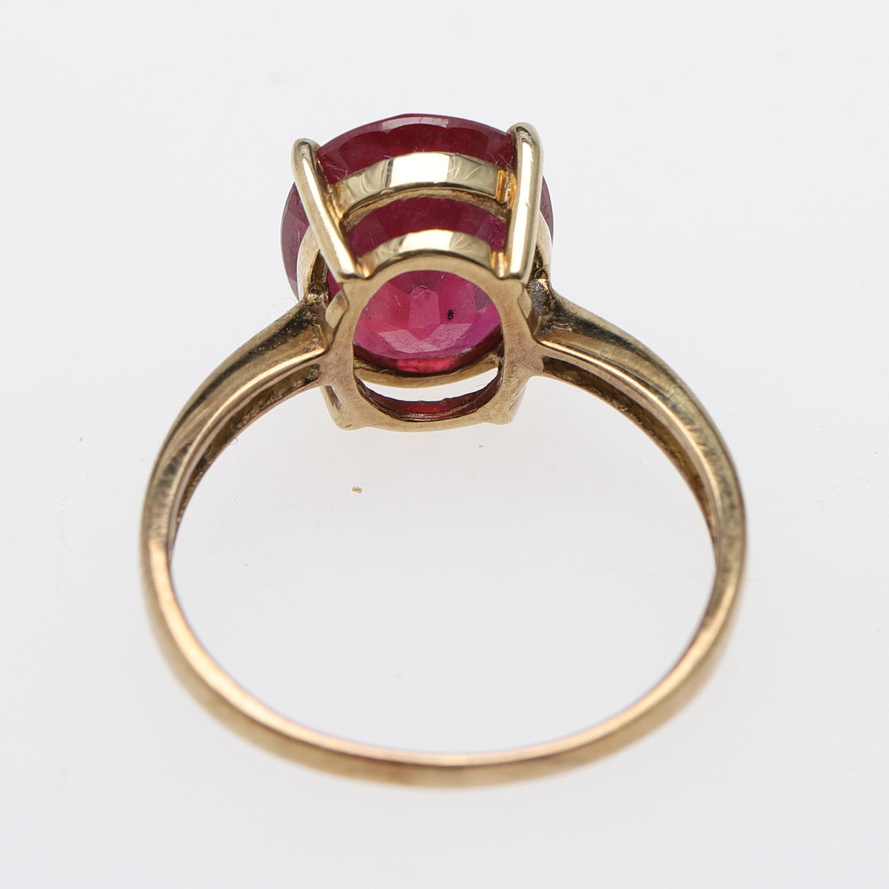 Den ovala klippstenen på cirka fem karat, fyra stift på vanligt 9 karat guldskaft.