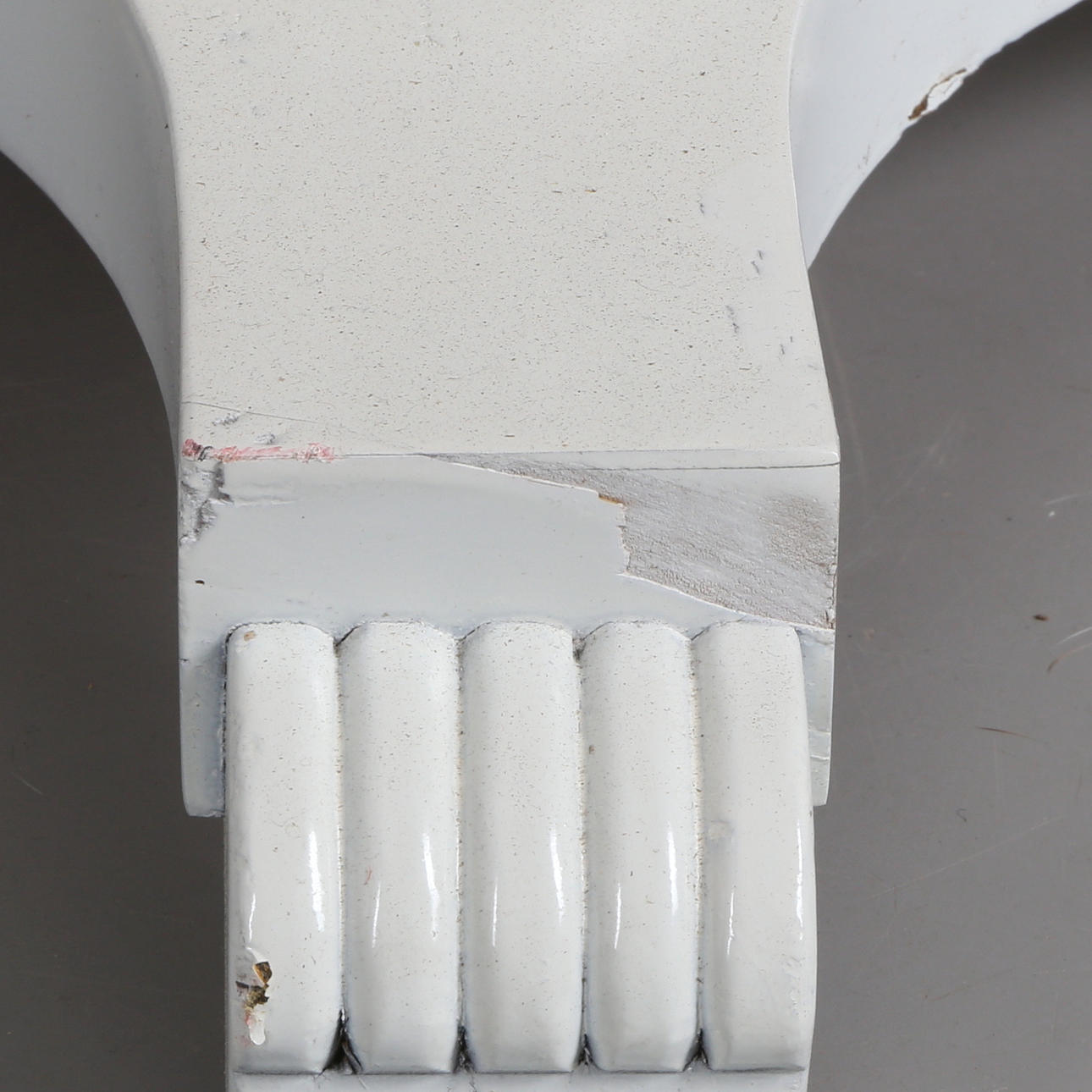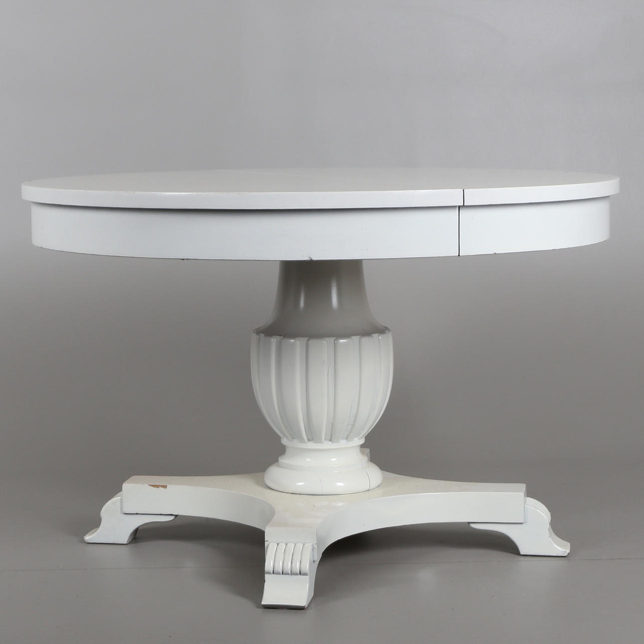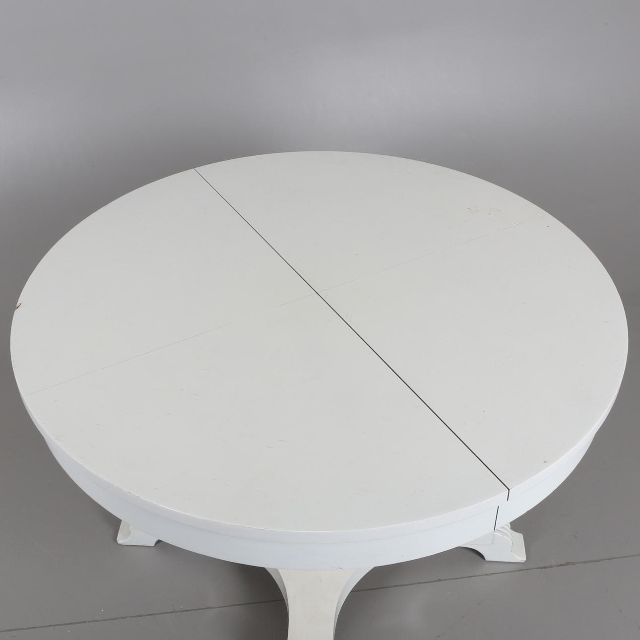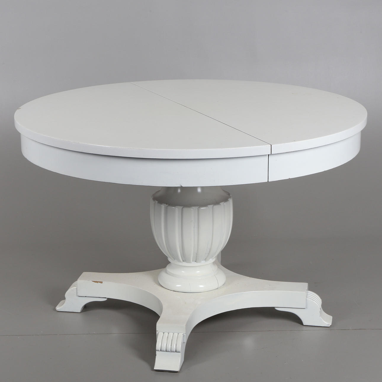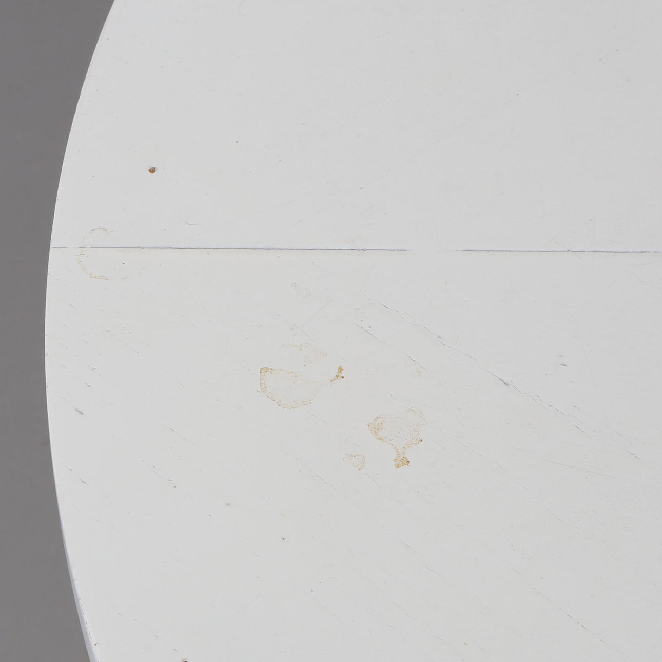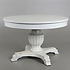 På 4 st ben med höj- och sänkbar bordsskiva. Diameter 89,5 cm. Höjd 56,5 cm.