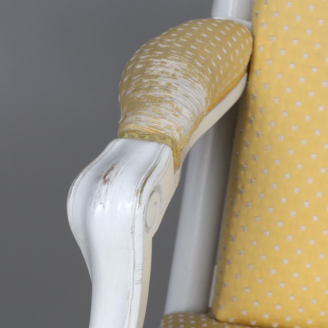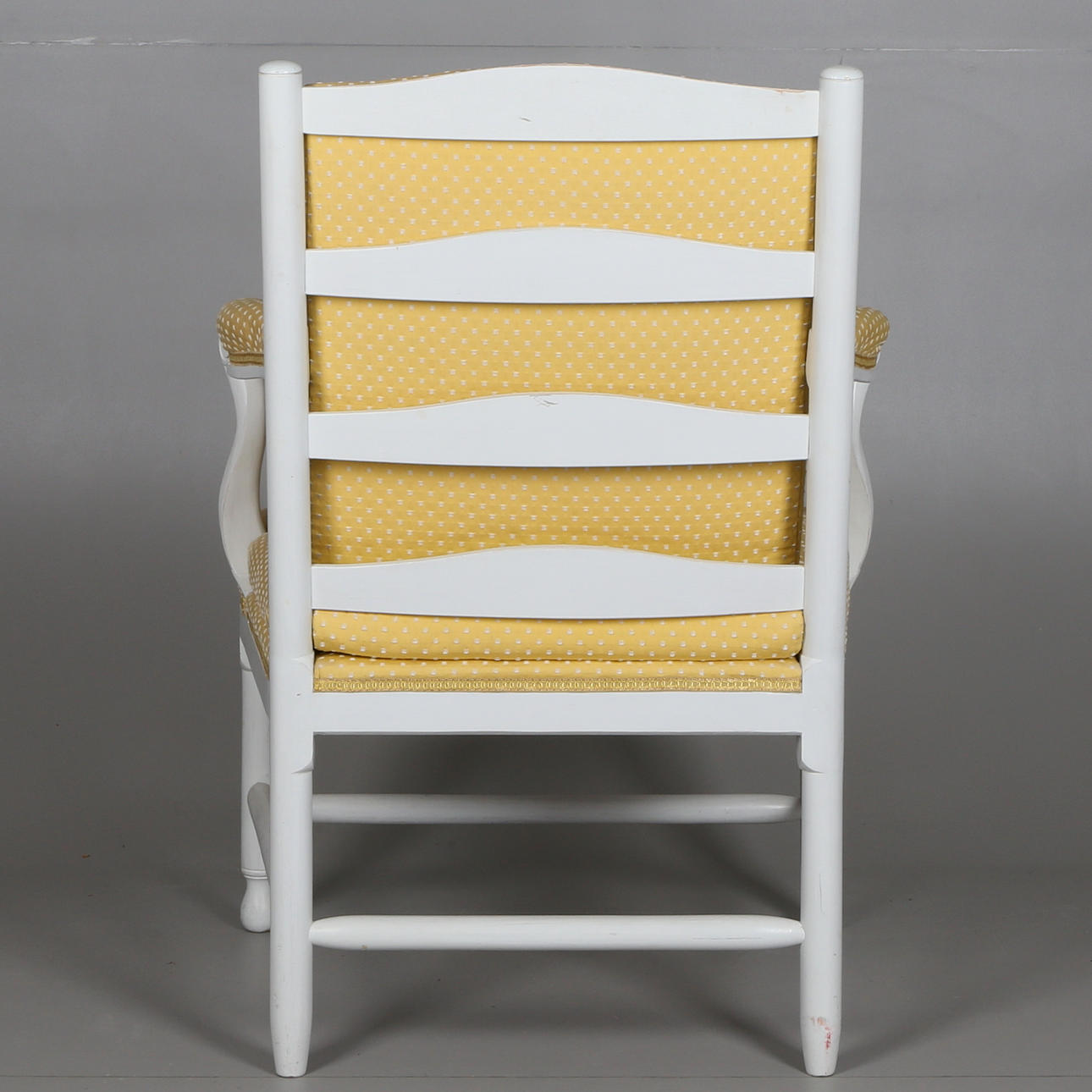 Bruksslitage, slagmärken, smärre fläckar, hårdare slitage på armstöd, senare bemålad.