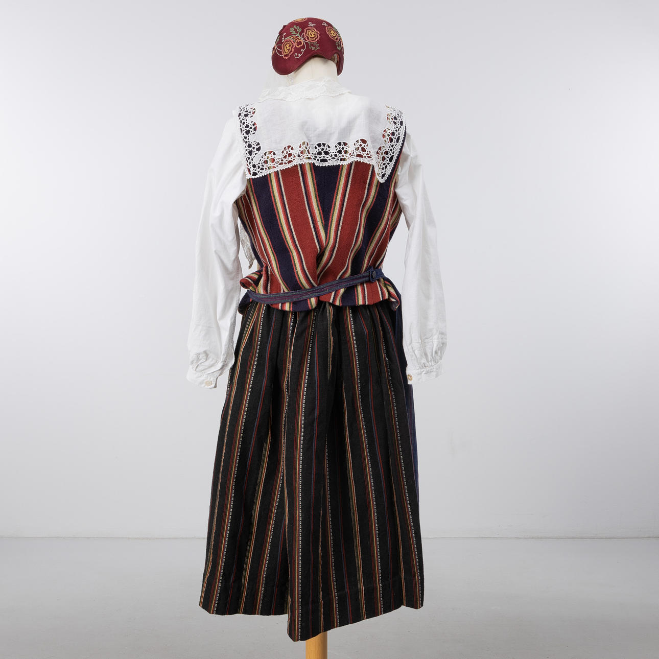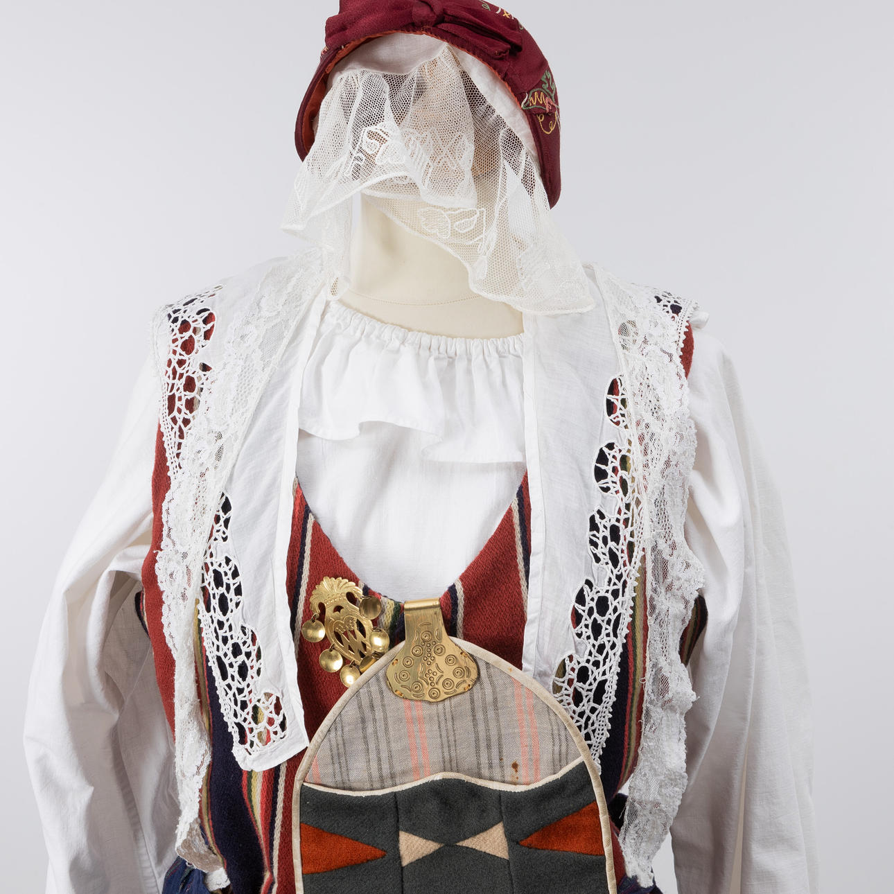 Hätta, väska samt dräktsmycken i mässing.
