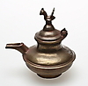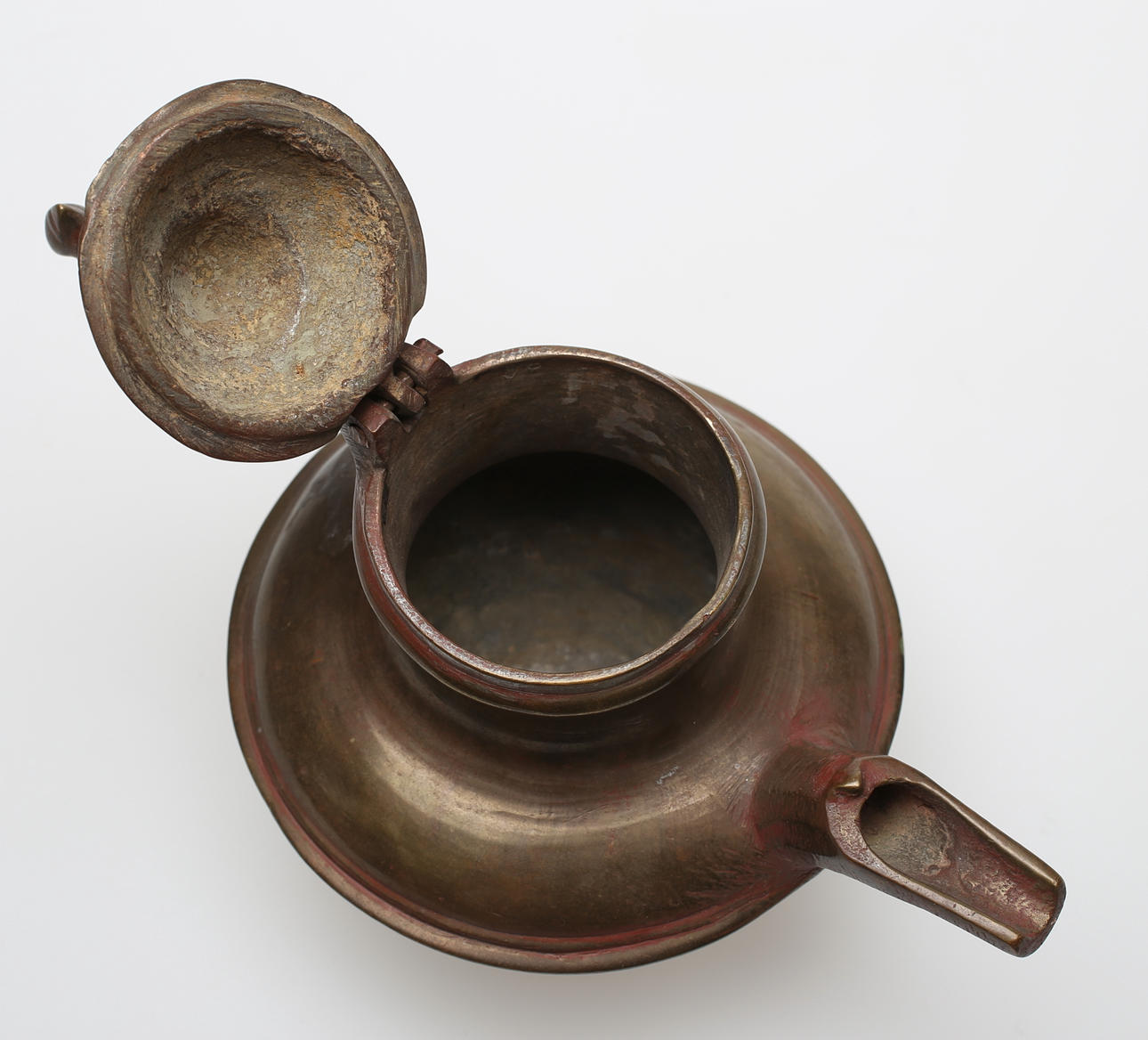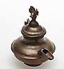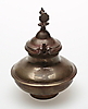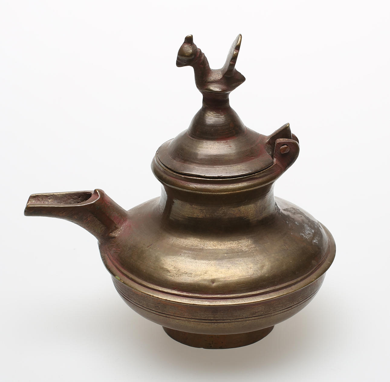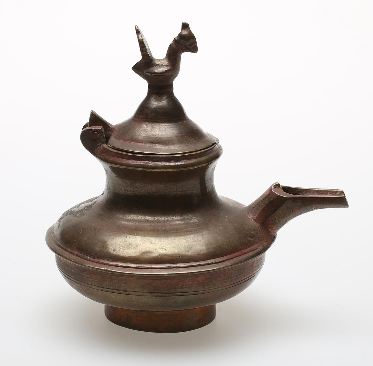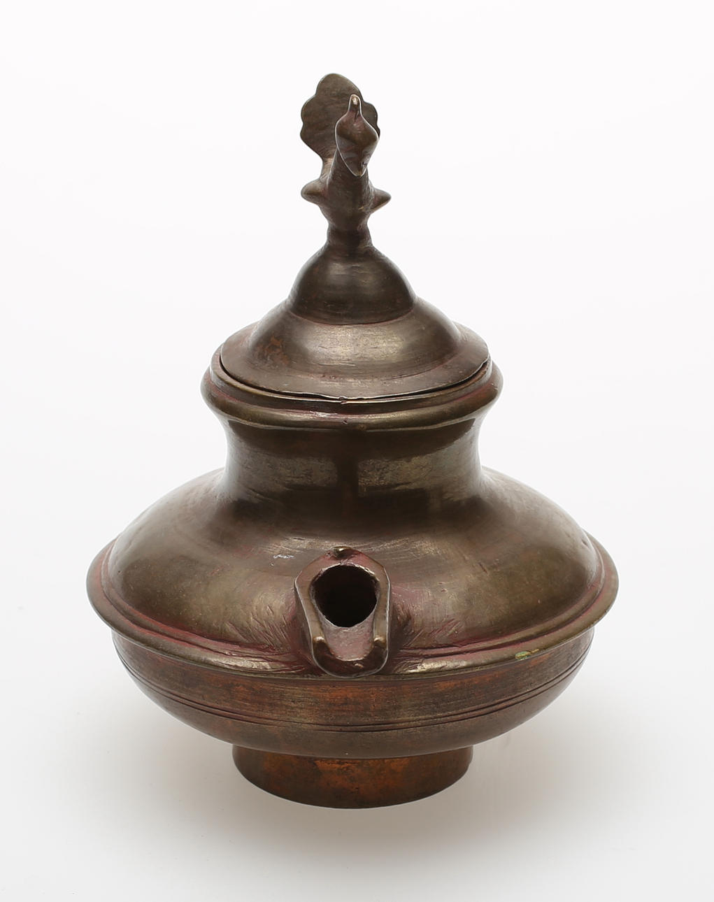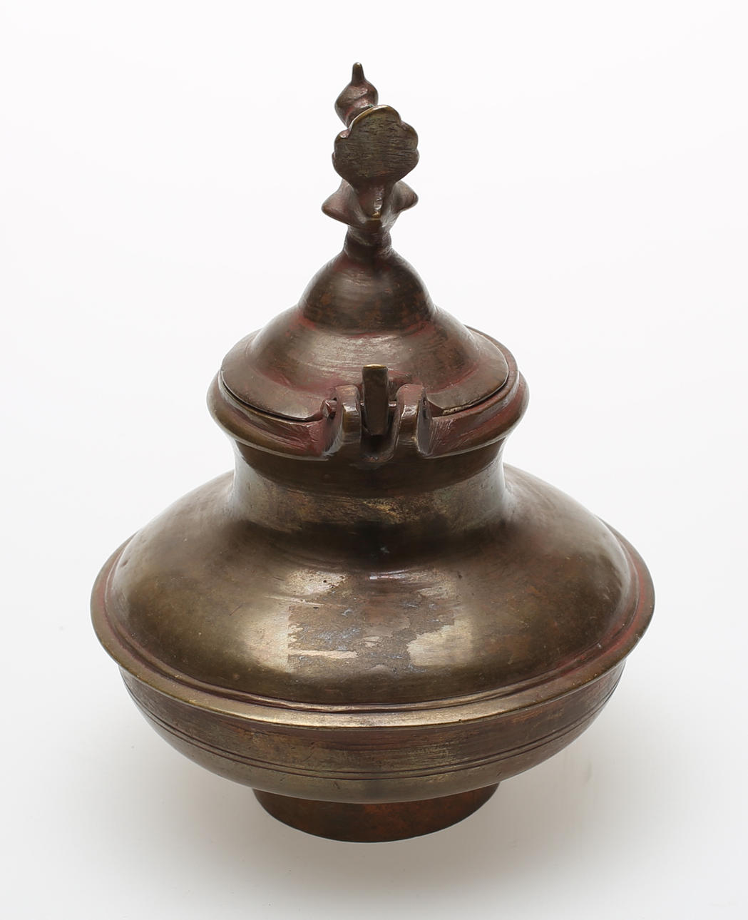 Kopparbrons med rester av den tidigare rituella målningen. Stoppad bulbous med lock som krönar i form av en påfågel. Tecken på användning, höjd 13,5 cm.