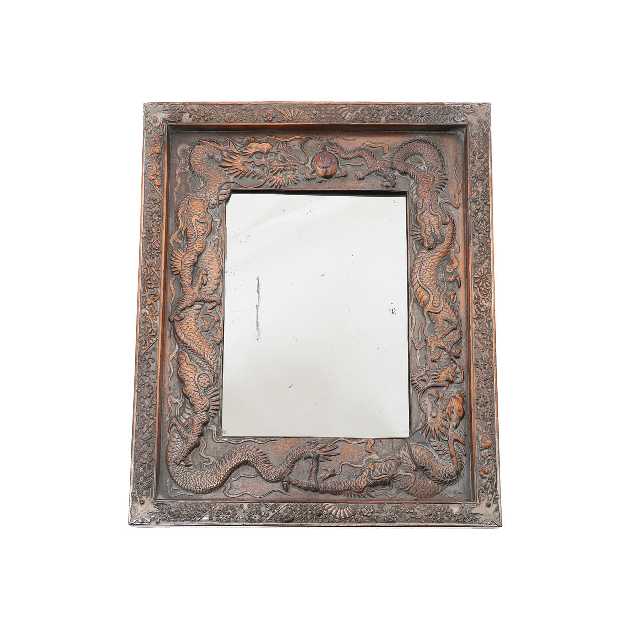 alla med ytrepor den abstrakta träfiguren med två sprickor i bakbenet som håller korgen, spegelpläteringen sliten, med förgylld metall som syns igenom och ”skalar” på platser, ryggen mycket sliten och märkt med fjäderben lös, spegel med avsilverning.
