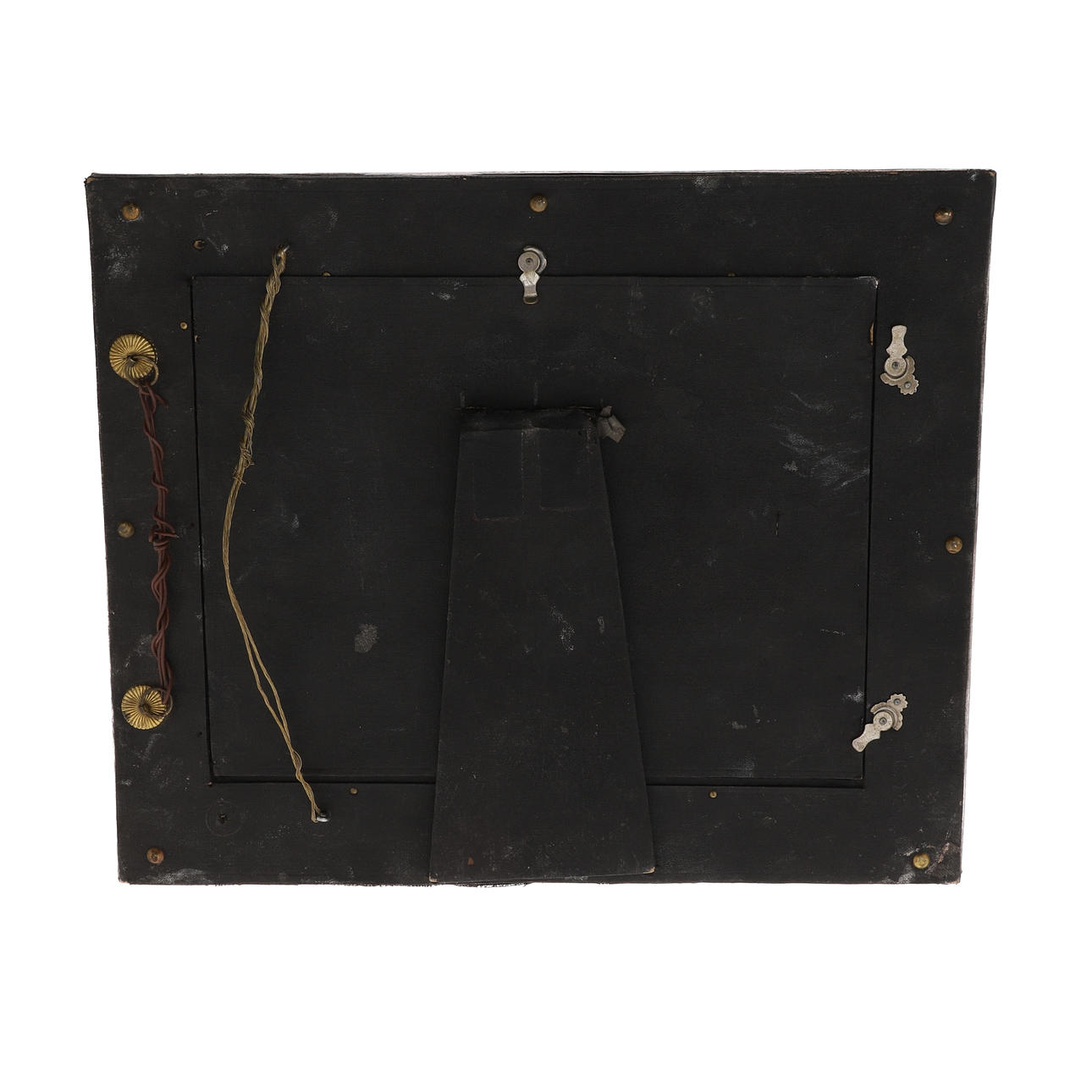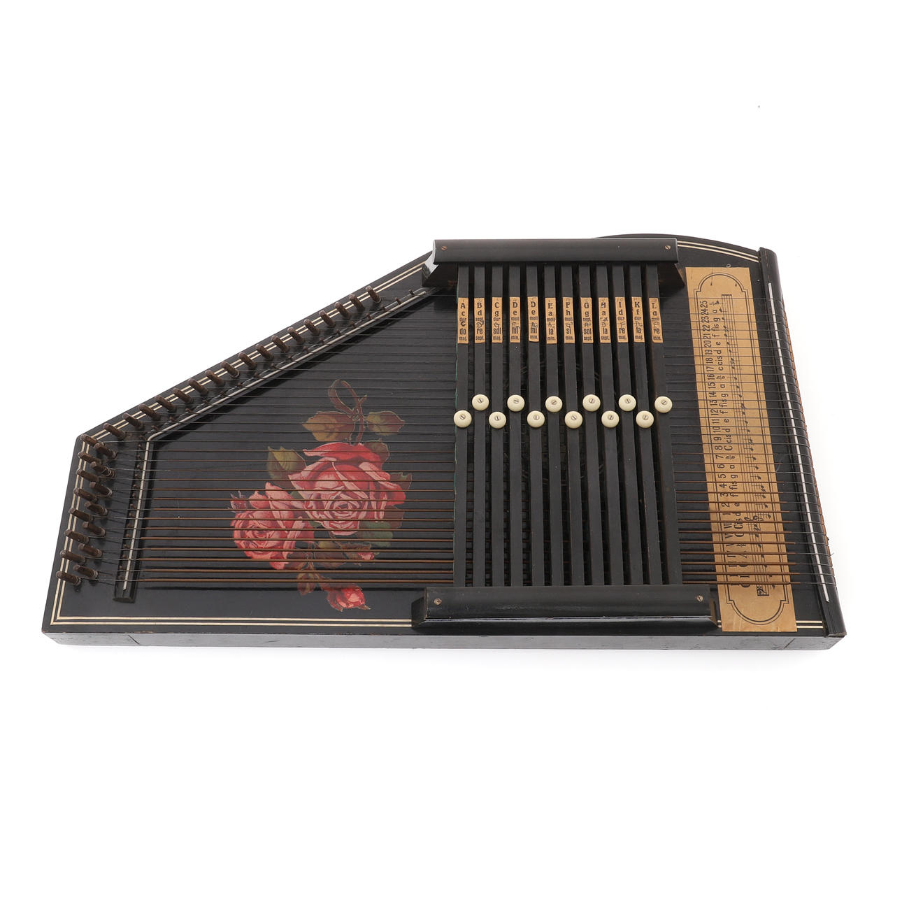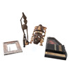 39 cm lång, en sydamerikansk snidad vägghängande mask i trä, 17 cm lång, och en afrikansk snidad träfigur, modellerad som att hålla ett spjut och sköld, 23 cm hög, och en afrikansk abstrakt antropomorf snidad träfigur, figuren modellerad som stående på tre ben, med sitt bakre högra ben som håller en korg på toppen av huvudet, på en formad strukturerad bas, 56 cm hög, en vintage eboniserad harpa eller citter med röd rosdekoration och tryckt nyckeltavla, 51 cm x 31 cm, en japansk pläterad rektangulär fotoram nu med spegelplatta, tidigt 1900-tal, präglad med ett brett band av drakar som jagar flammande pärlor, baksidan med stafflistag, siktstorlek 14,2 cm x 19,5 cm, 27,5 x 33 cm totalt (6).