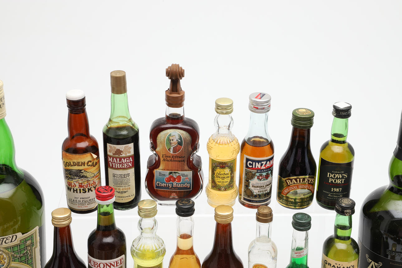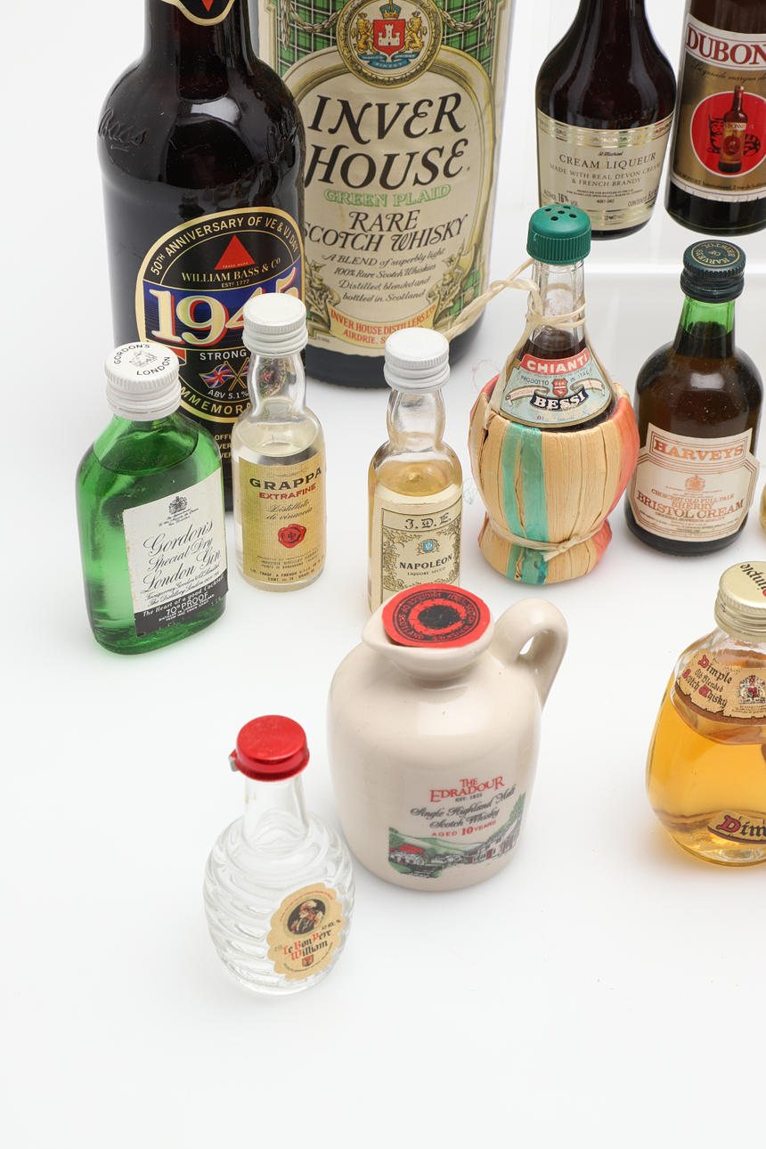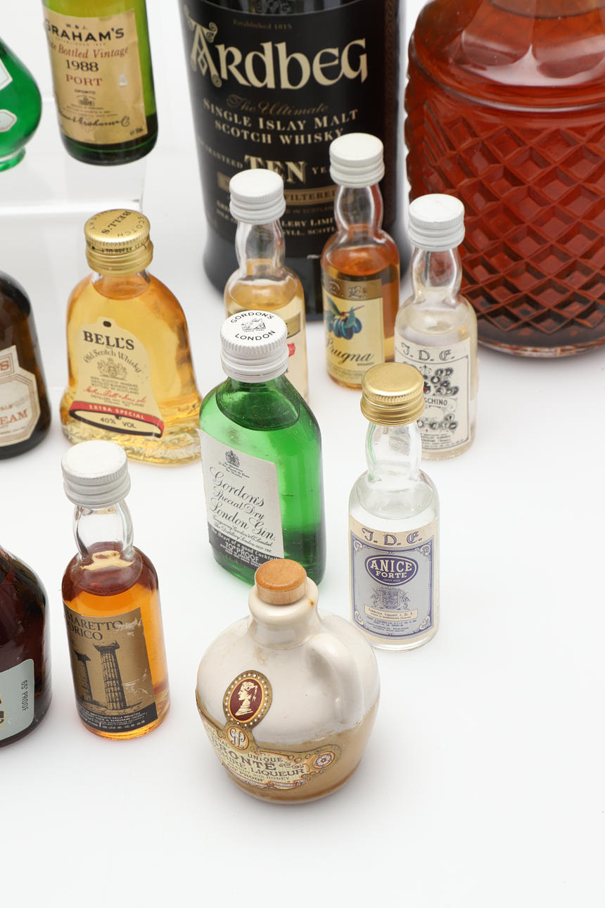 En mängd alkoholminiatyrer, inklusive likörer, gin och whisky, bland andra av olika tillverkare. Tillsammans med en flaska Inver House Whisky (Höjd 31cm), Ardbeg Whisky och en flaska omärkt sherry.
