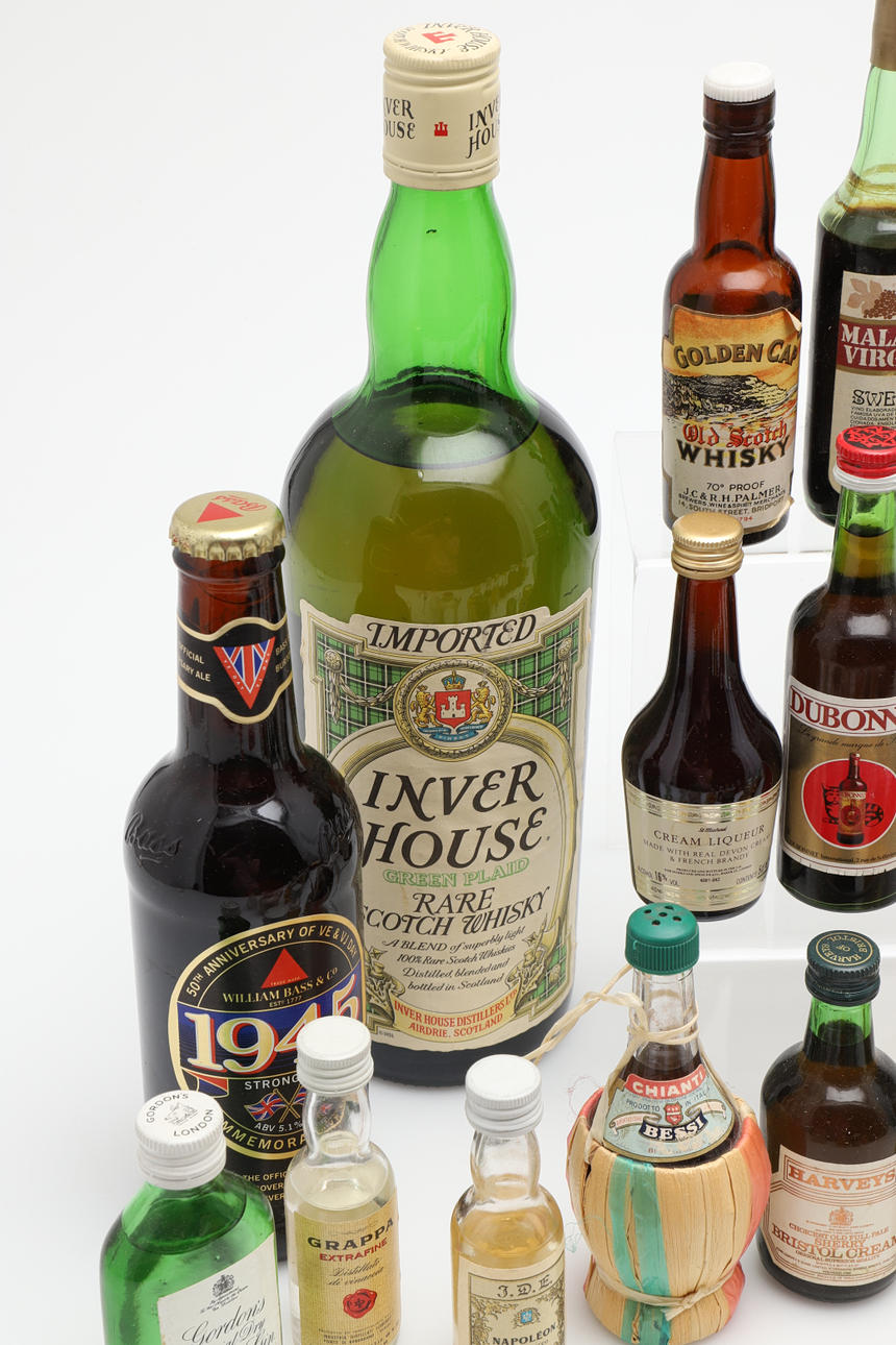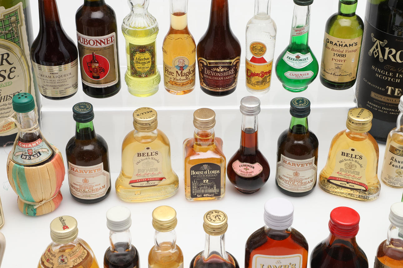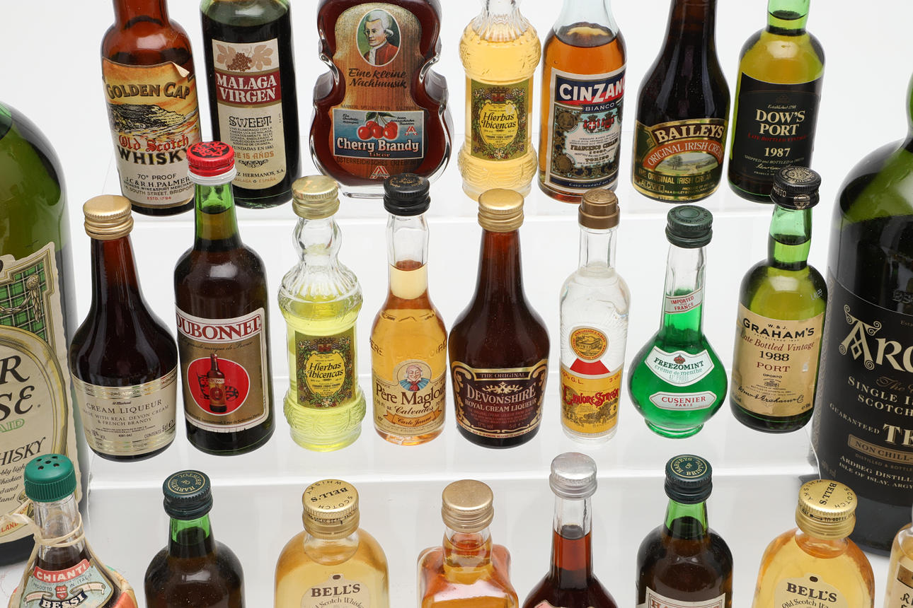 En mängd alkoholminiatyrer, inklusive likörer, gin och whisky, bland andra av olika tillverkare. Tillsammans med en flaska Inver House Whisky (Höjd 31cm), Ardbeg Whisky och en flaska omärkt sherry.