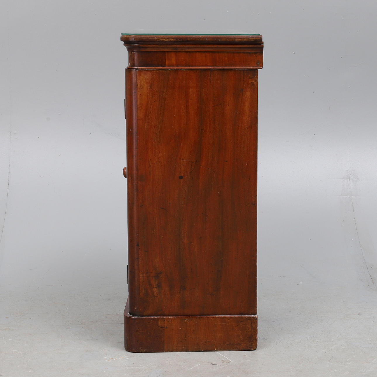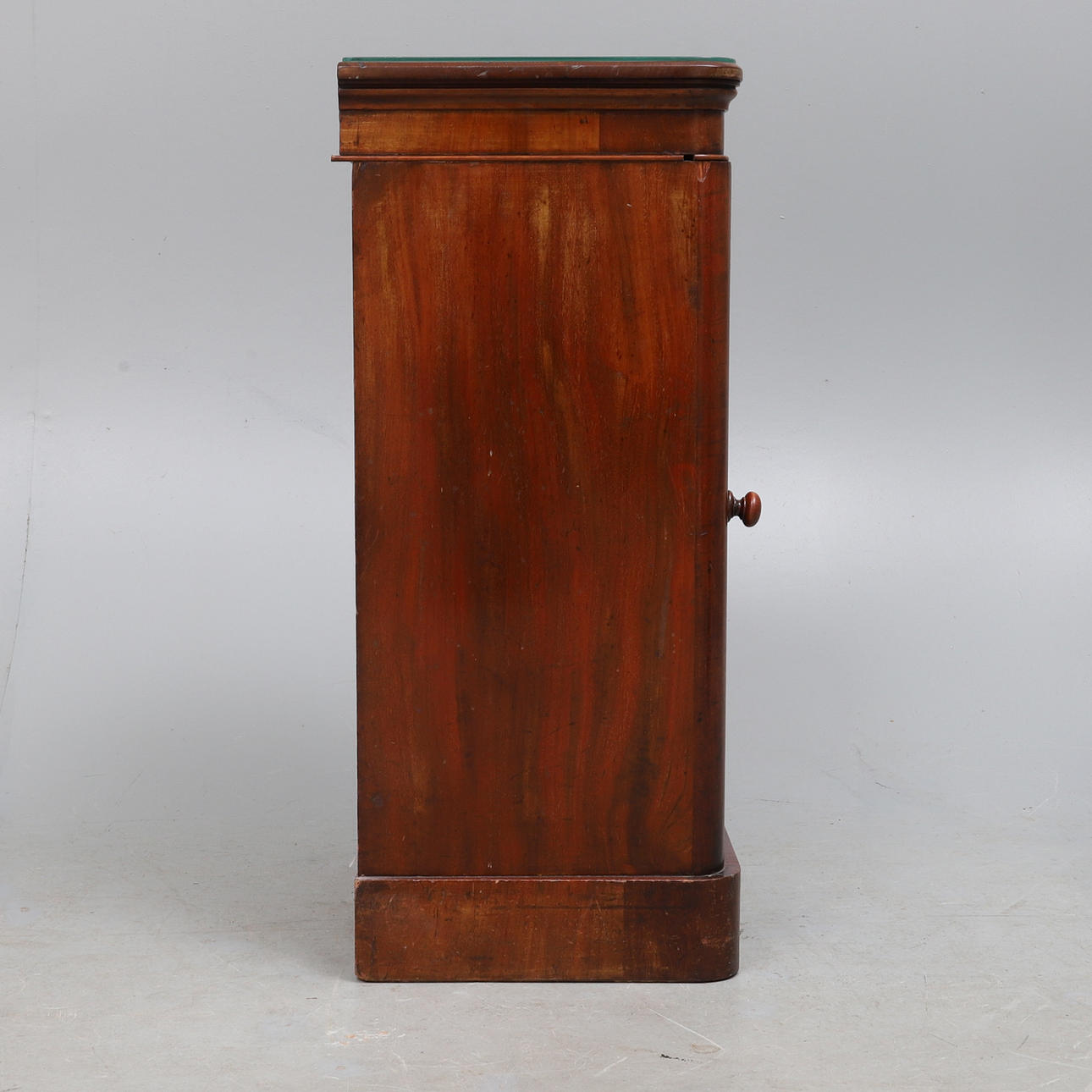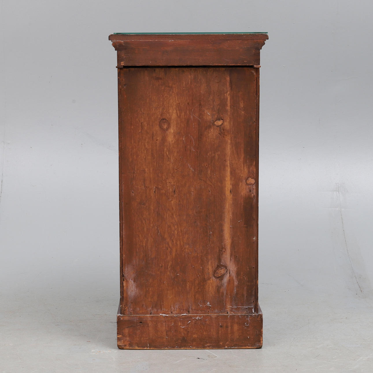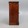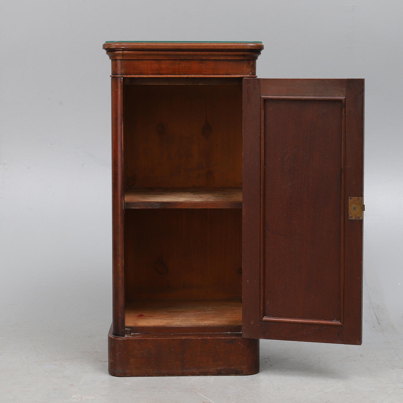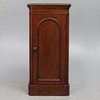 den gjutna toppen ovanför två fasta hyllor omslutna av en välvd paneldörr, på sockelbotten, 39,5 cm bred x 35,5 cm djup x 81,5 cm hög.
