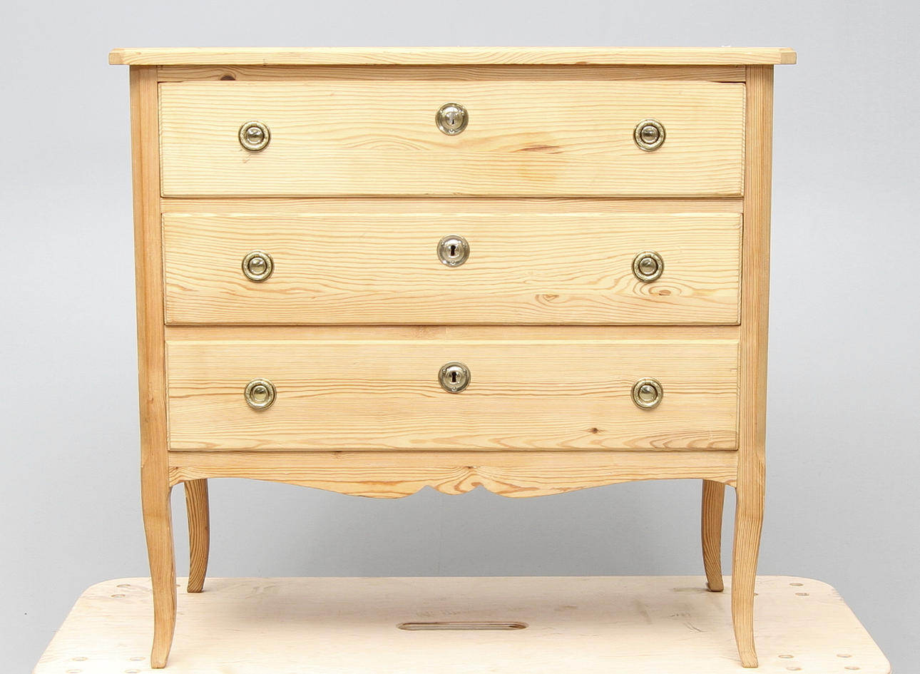 Avlutad furu, tre lådor, beslag och handtag av gustaviansk typ i mässing, längd 90, bredd 45, höjd 85.