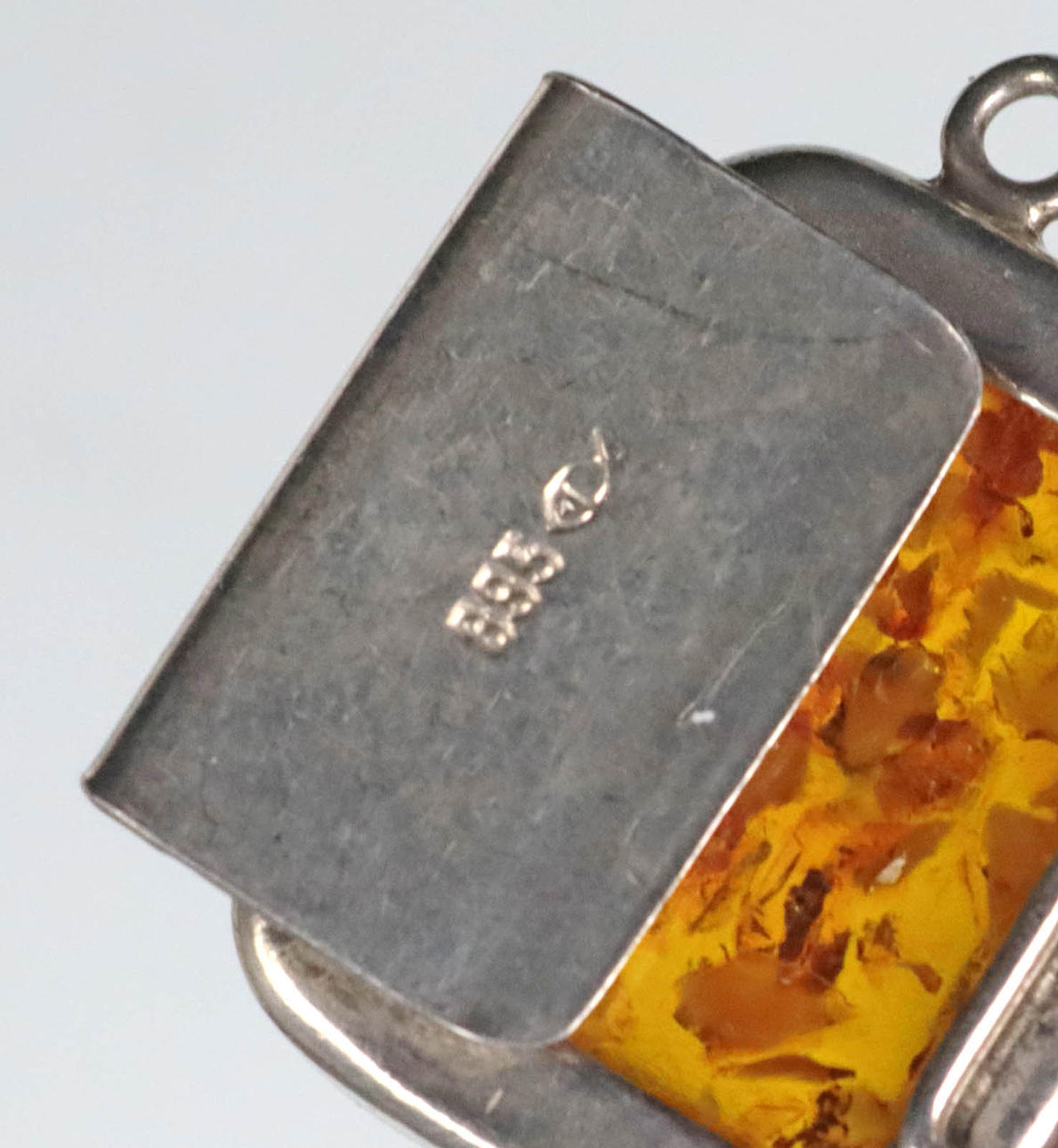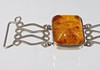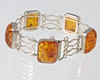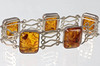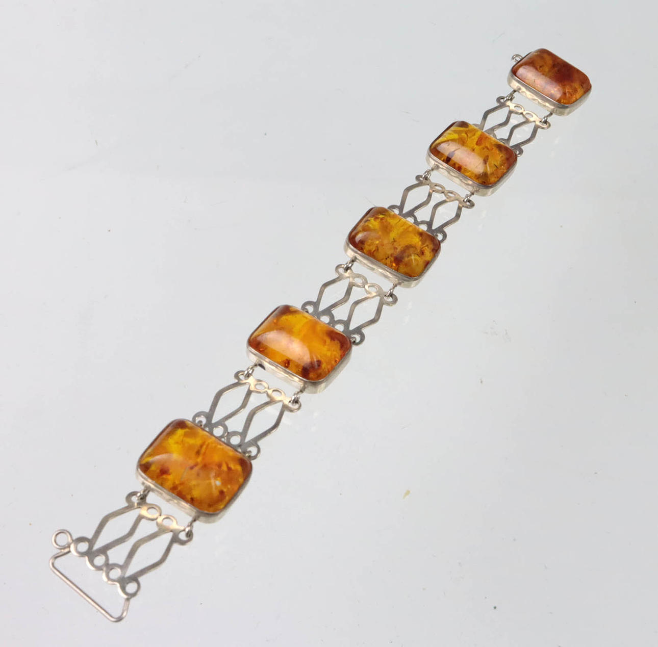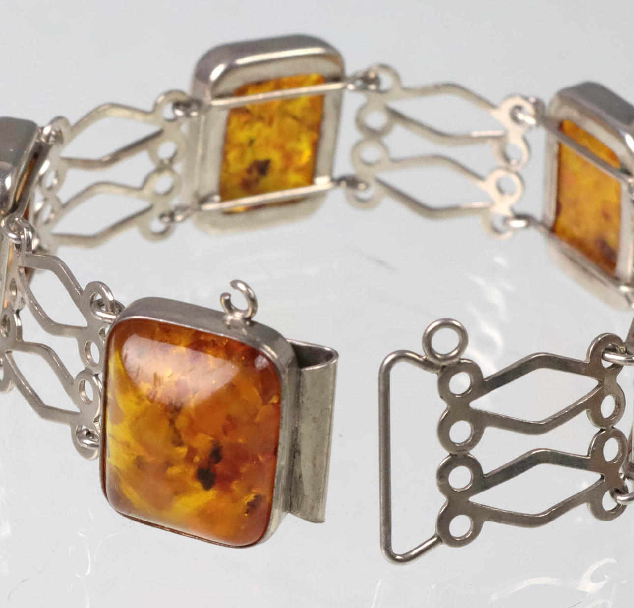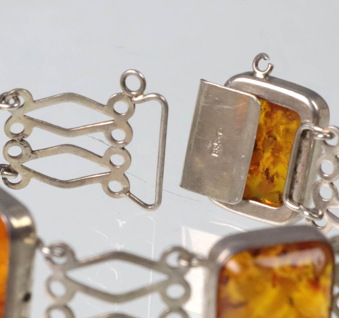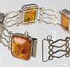 Armbandet är tillverkat av 835 silver och stämplat på baksidan, plus logotypen för Fischland-Schmuck, Ribnitz-Damgarten, 5 länkar med bärnsten, däremellan, silverprydnadslänkar, längd 18,5 cm, bredd 2 cm, bärnsten 19 x 15 mm, vikt 25 gram.