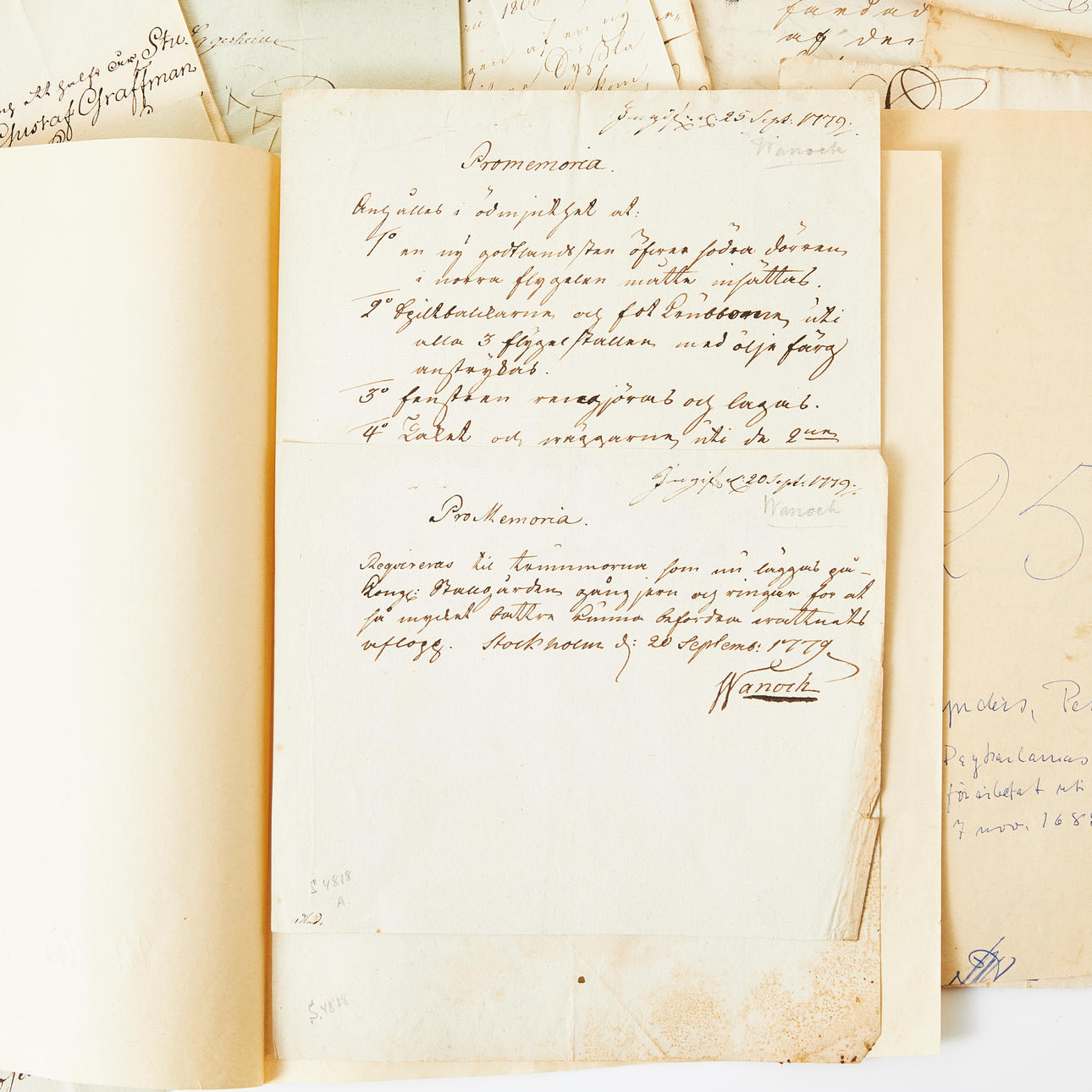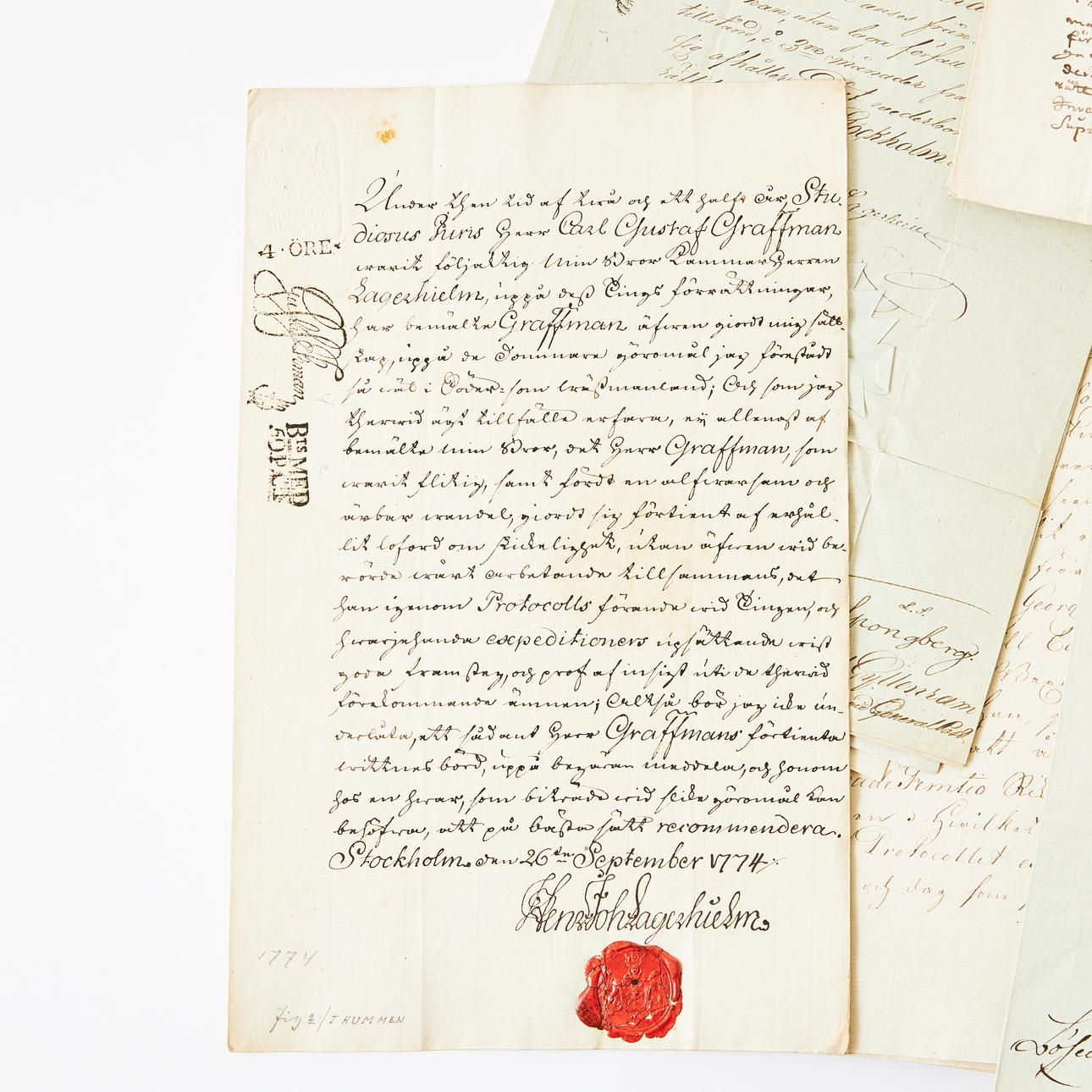 Bl.a. signerade av Jacob Gyllenborg, Uppsala 1694; Erik Fleming, Stockholm 1652; Pehr Adlerheim, 1776; Herman Winter, kvittens 1652);