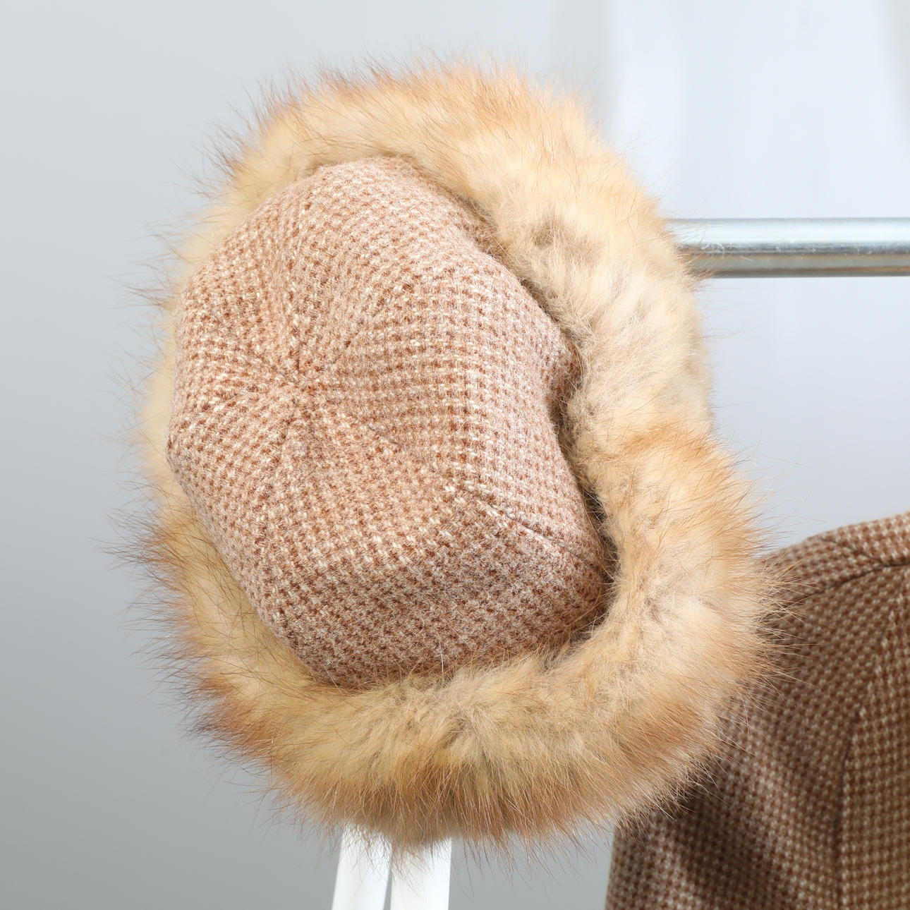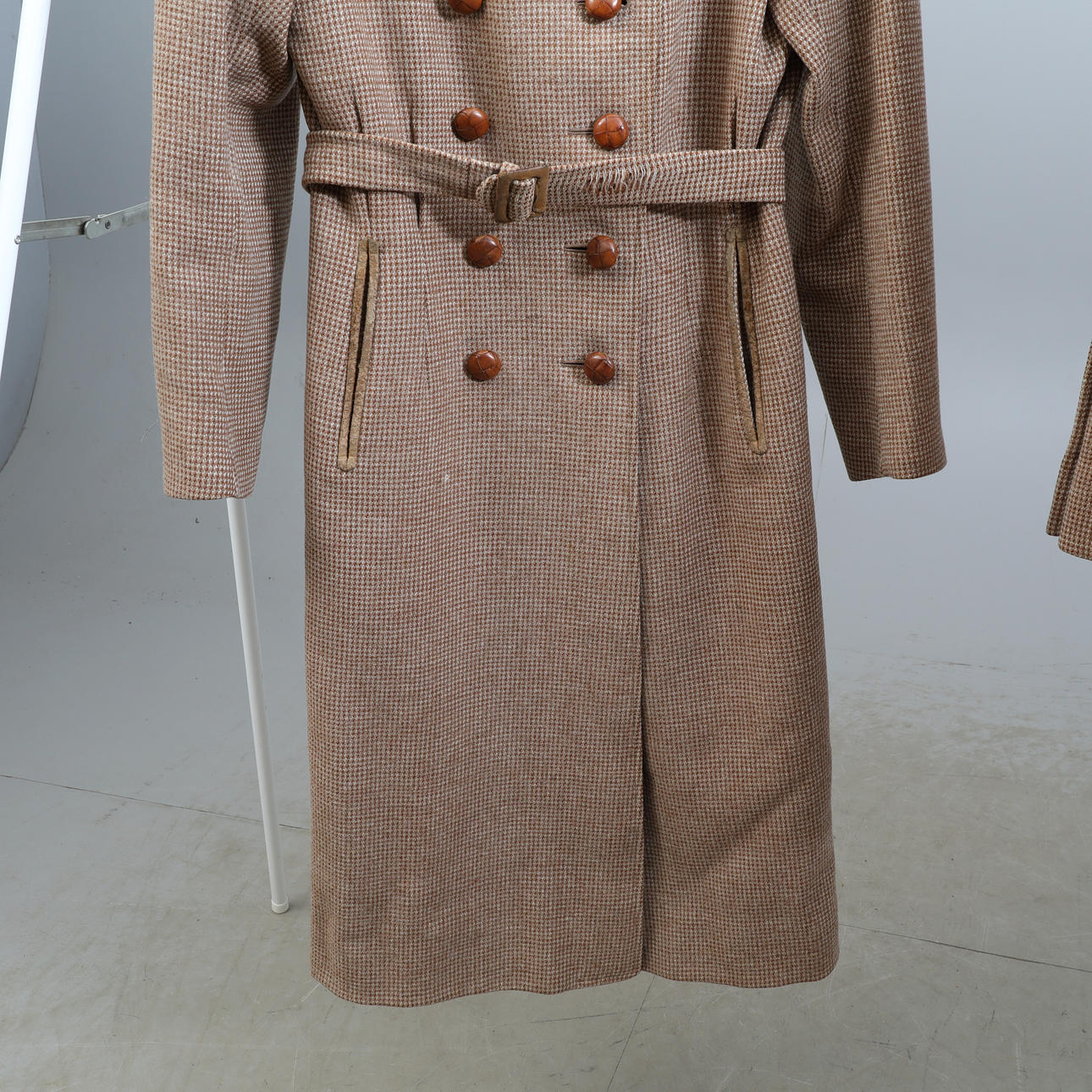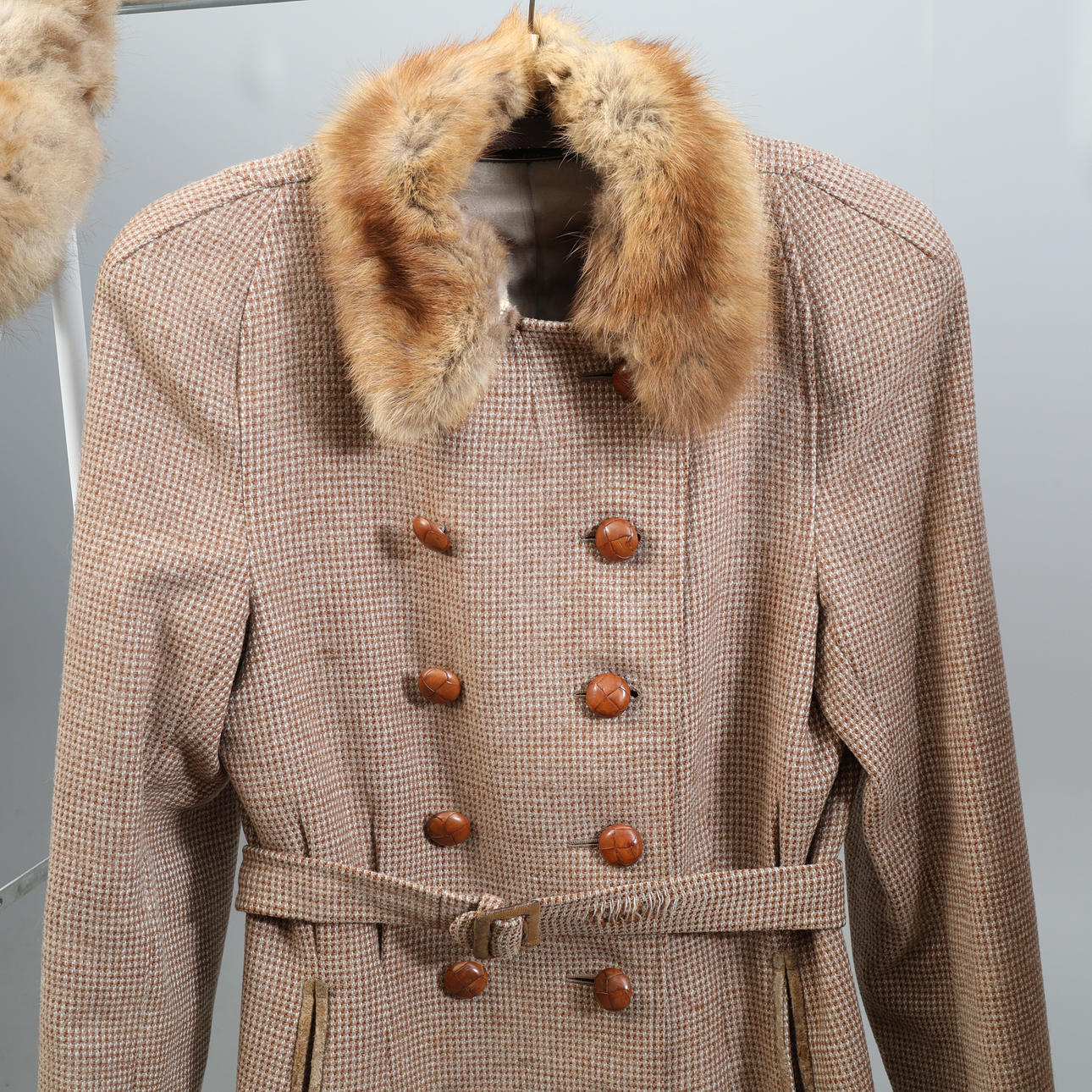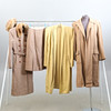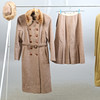 Tre dam, ytterplagg, kappor. Den ena med tillhörande hatt/mössa samt matchande kjol. Päls-detaljer.