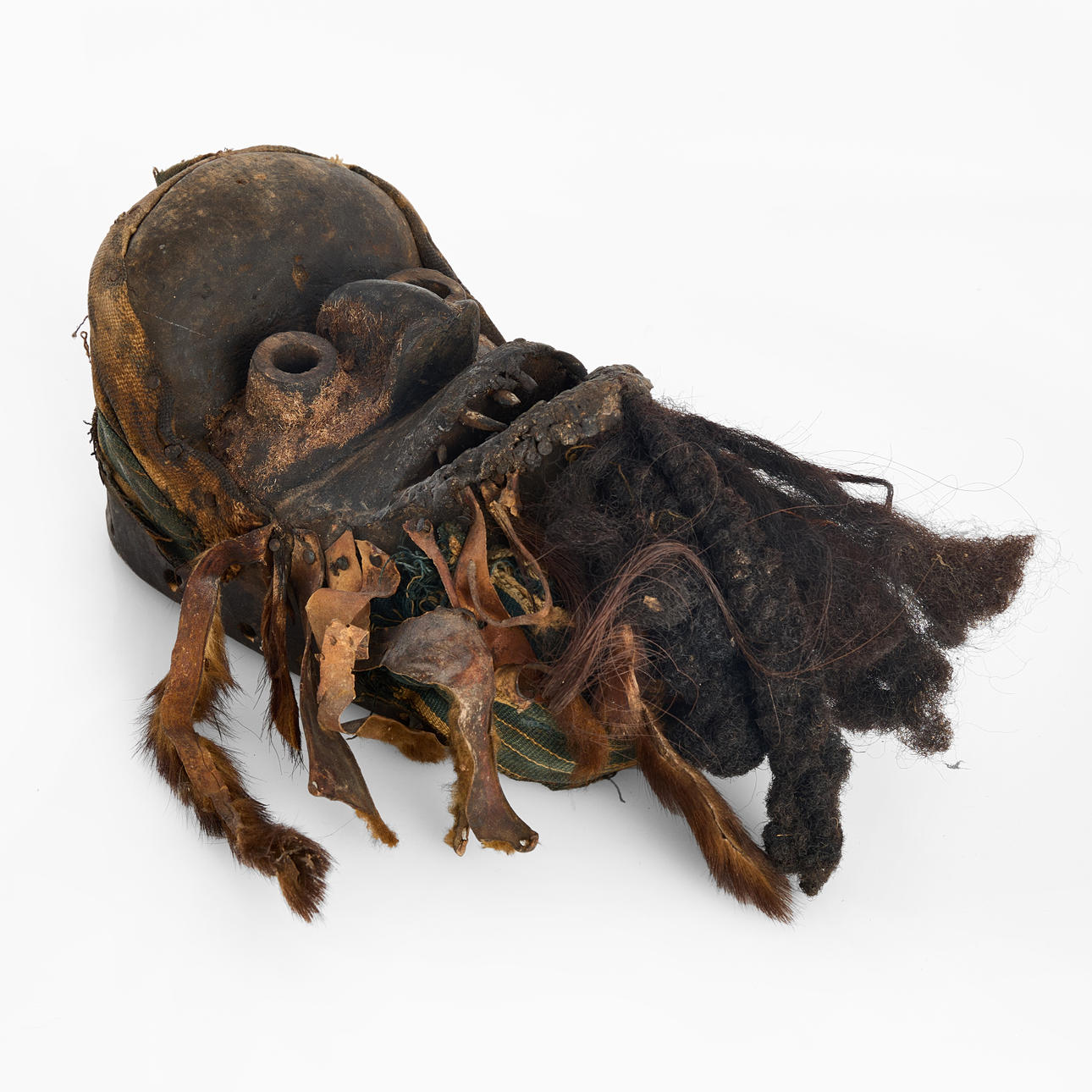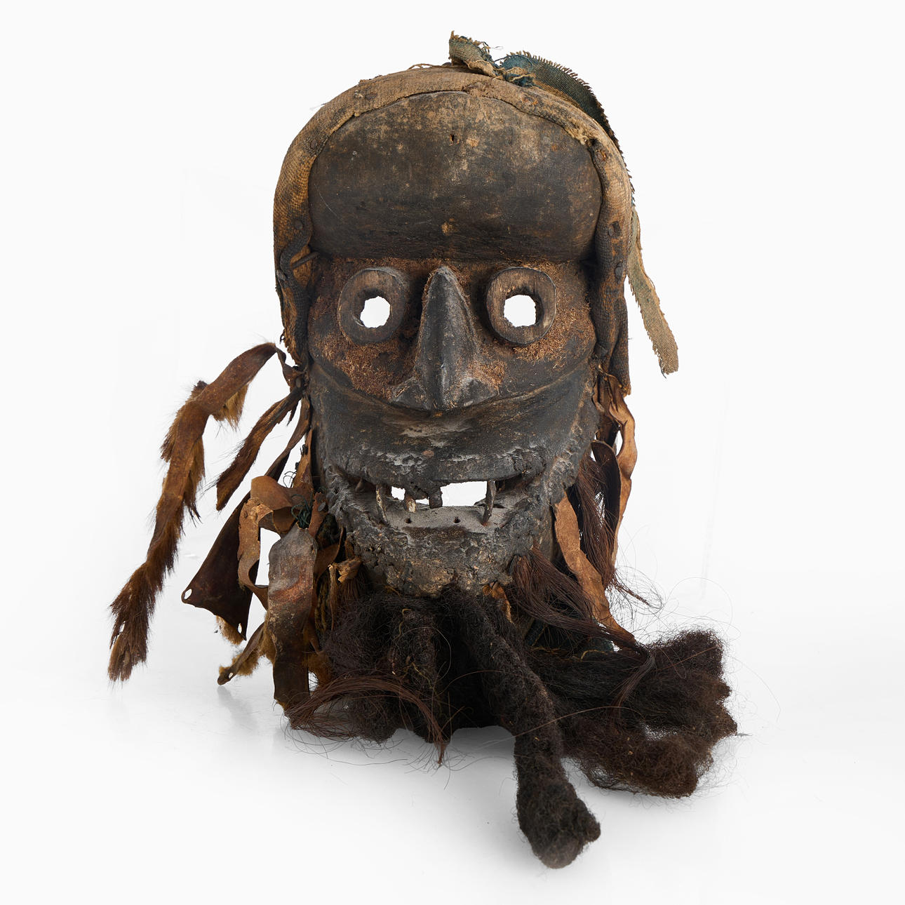Guere/Wobe/Dan, skuret trä med applikationer av hr, textil, läder och metall. Höjd 25-30 cm exkl. skägg.