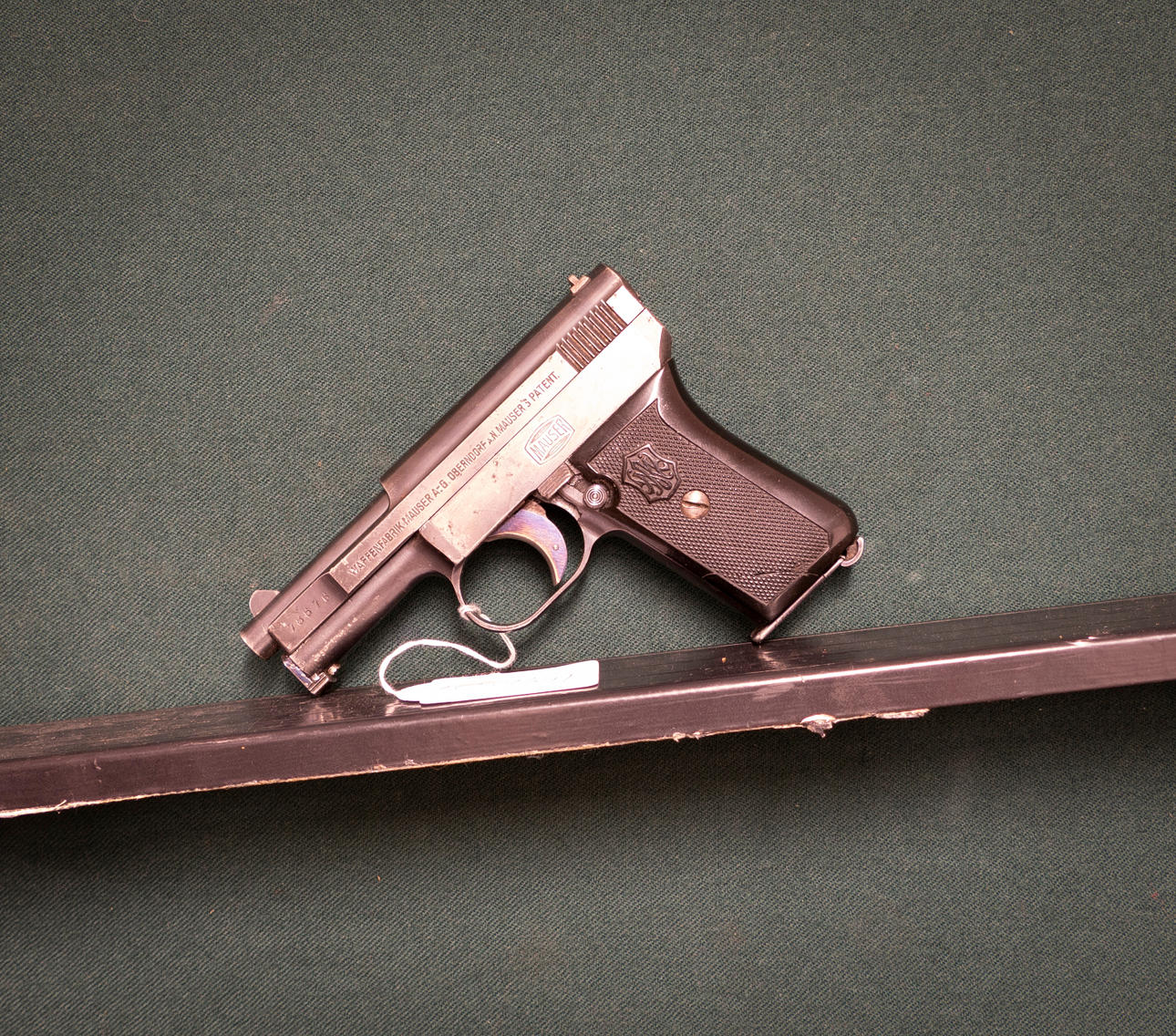 Pistol Tysk Halvautomat. Fabrikat Mauser Mod 1910. Kaliber 6,35. Tillv.nr. 78676. Piplängd 7,5cm. Fast sikte. Löstagbart magasin.