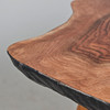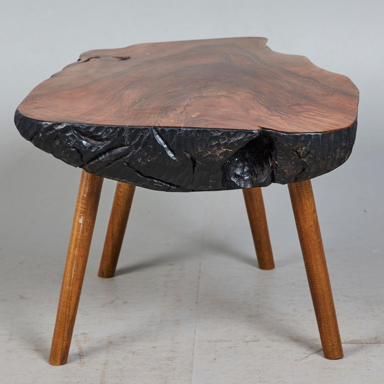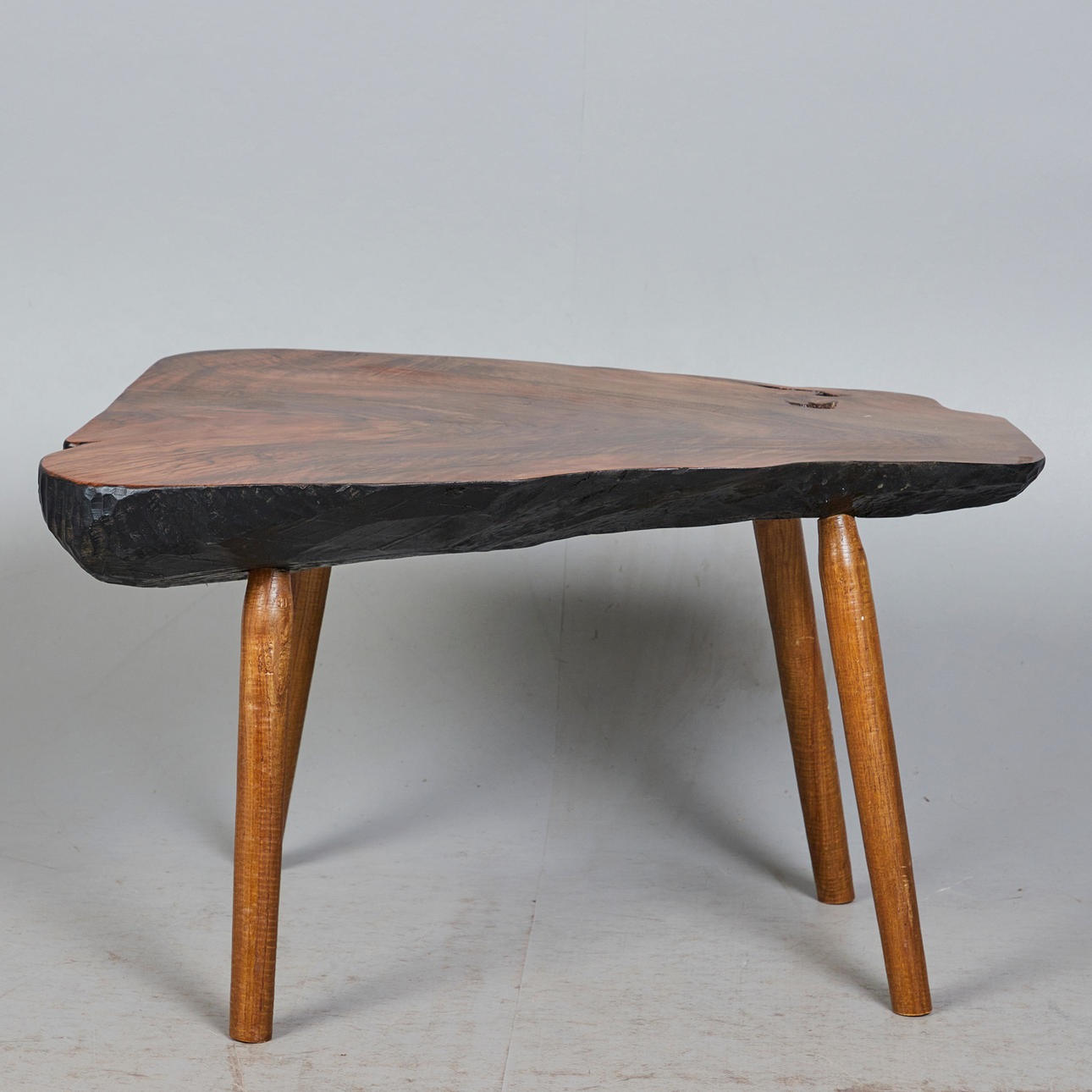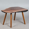 Sidobord/soffbord, valnöt. Sidobord med fyra koniska, utsvängda ben i glaserat valnötsträ och en organiskt formad, fanerad bordsskiva, H.54cm, L.87cm, W.69cm.