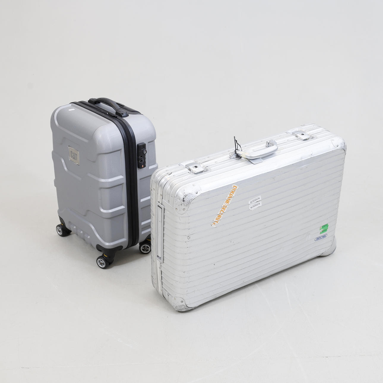 Den större (Rimowa) i aluminum. Båda två på hjul. Längd ca 37-71 cm.
