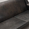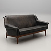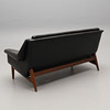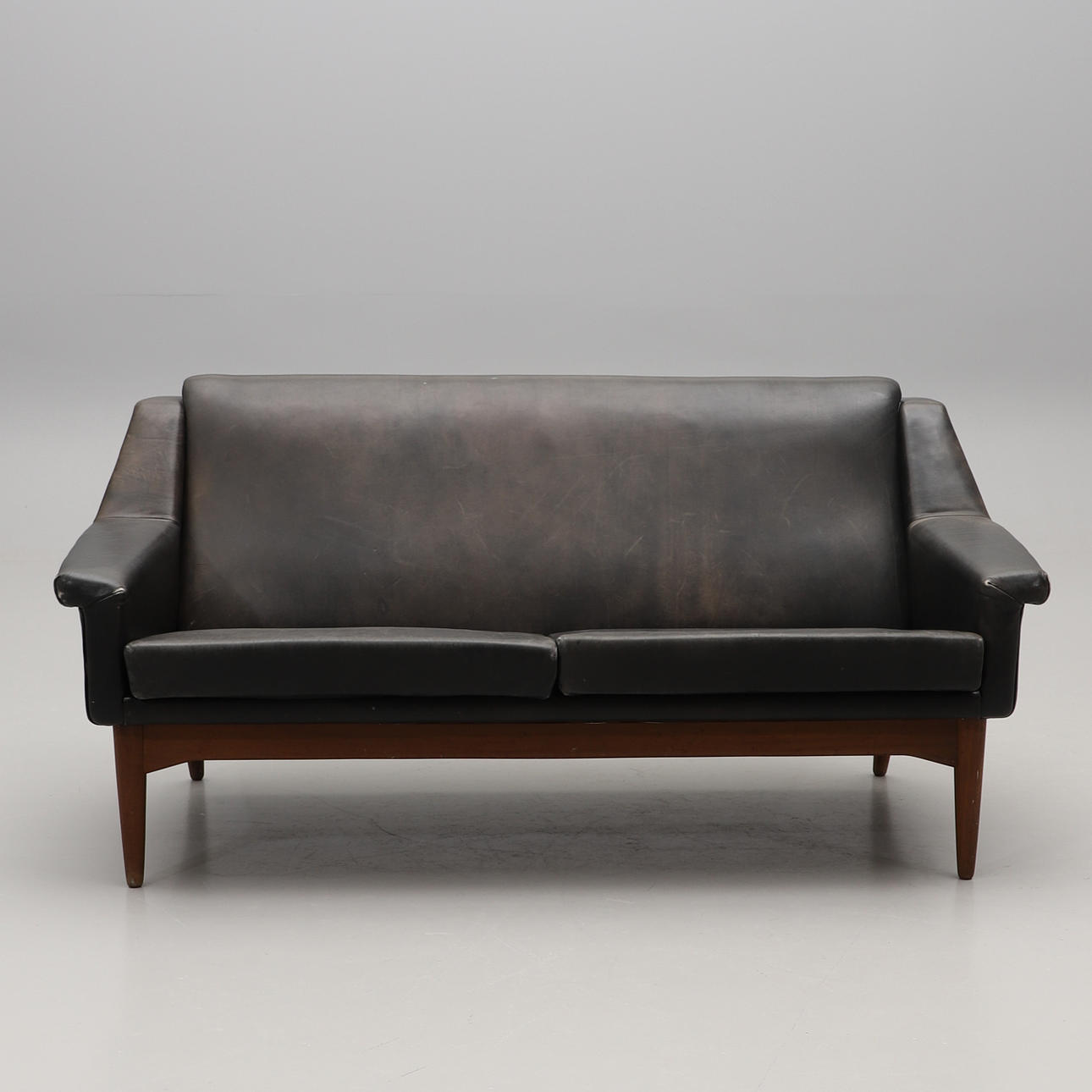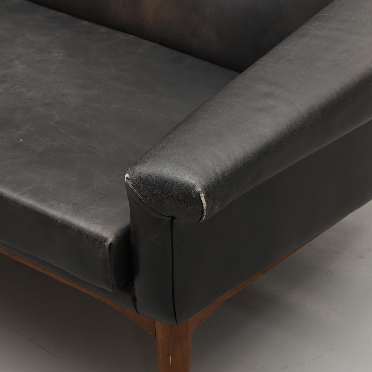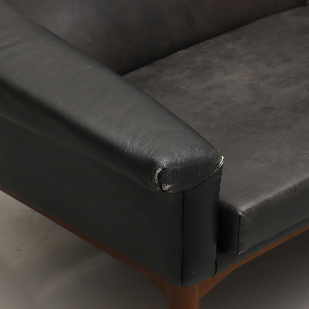 Tvåsitssoffa klädd i svart skinn med underrede i teak. Lösa sittplymåer. Längd 158, djup 80, rygghöjd 75, sitthöjd ca 31-40 cm.