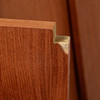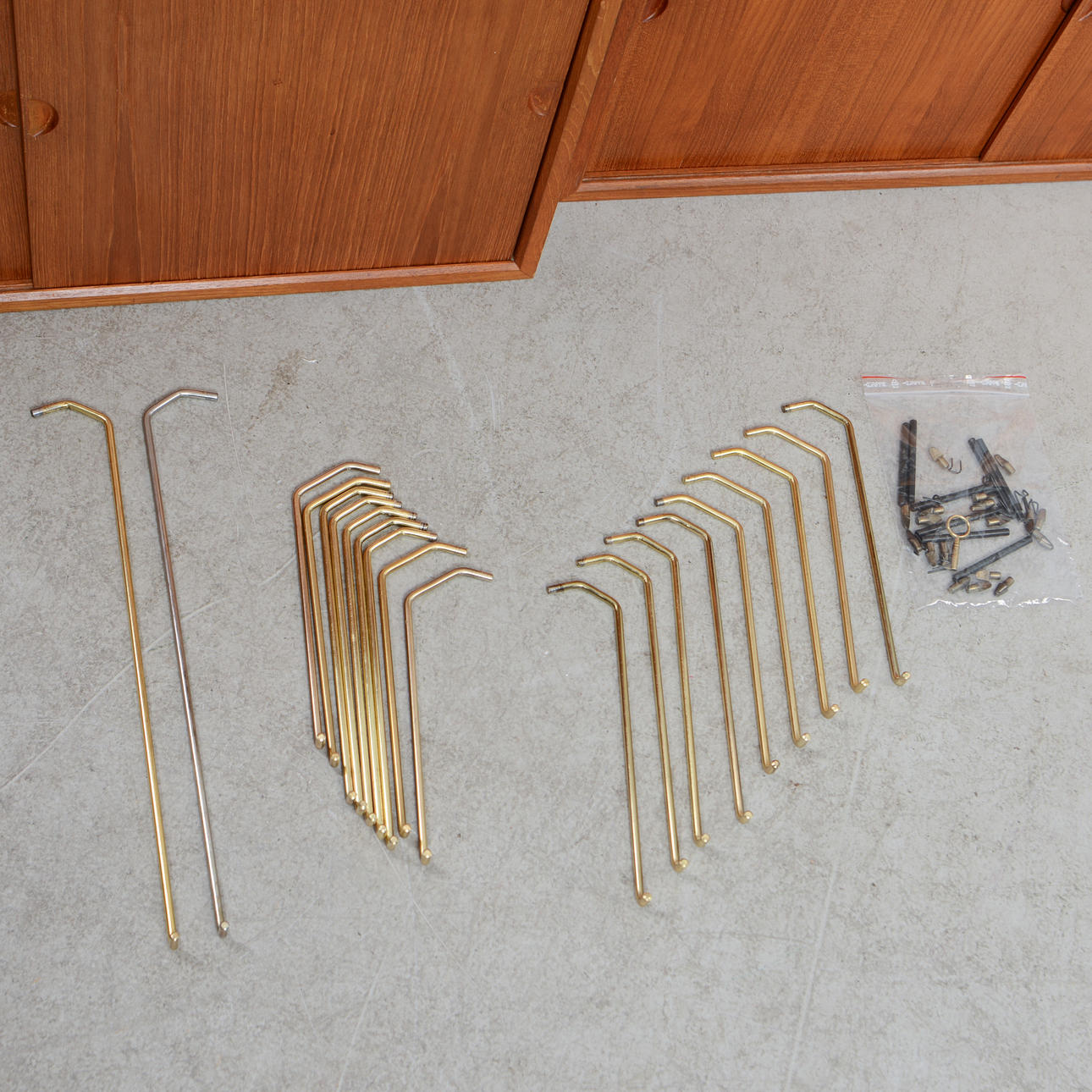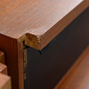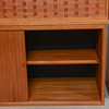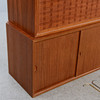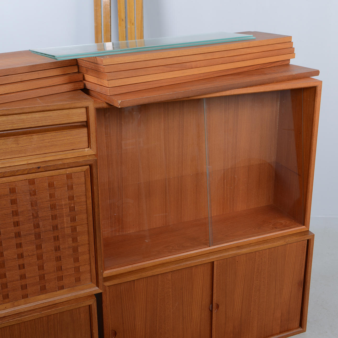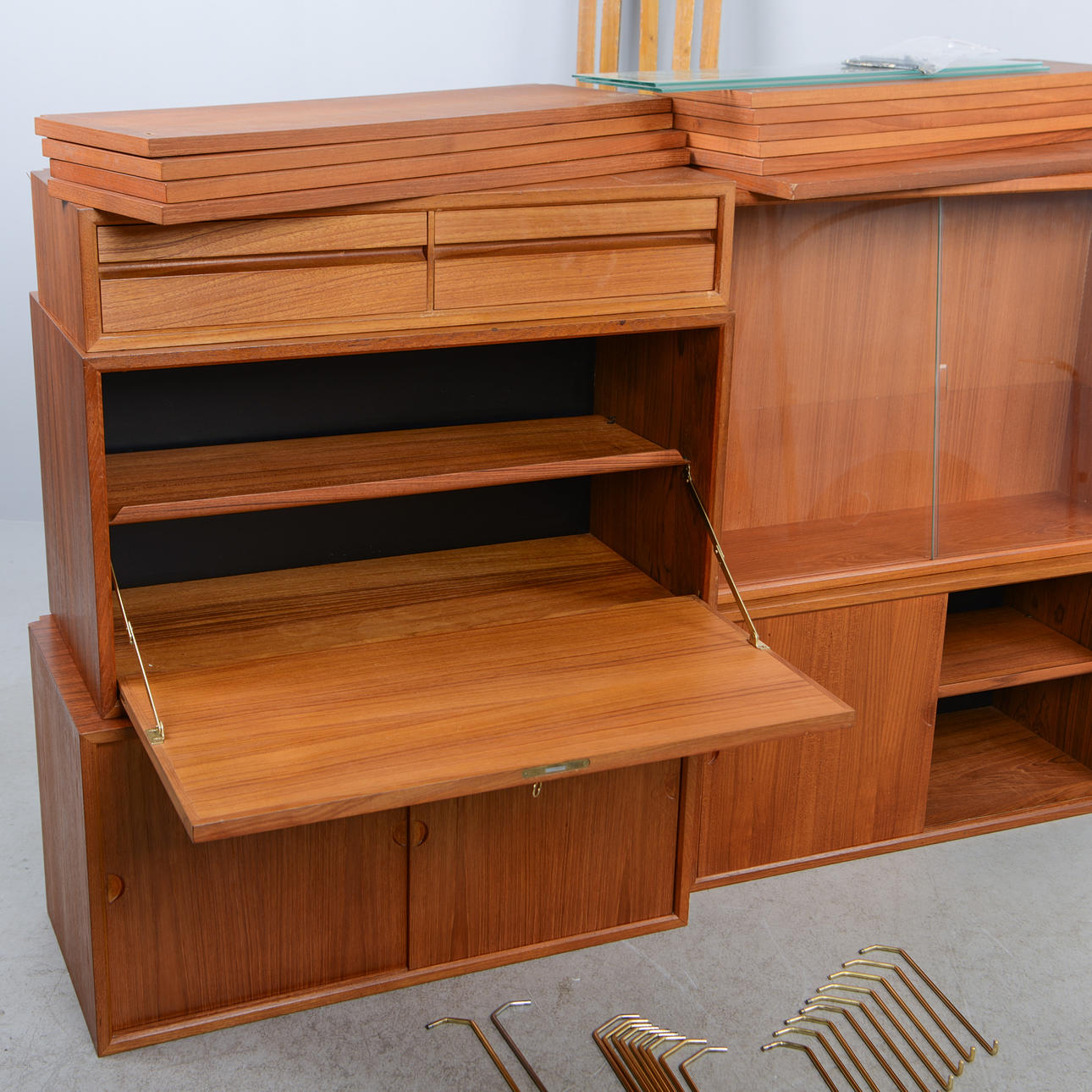 Teak. Hyllsystem med 4 hyllplan med djup 20 cm, 5 hyllplan med djup 24 cm, 1 hyllplan djup 40 cm, 3 skåpsmoduler, djup 38 cm, 2 moduler med skjutdörrar samt 1 med nedfällbar lucka, 1 skåpsmodul med glasade dörrar, djup 24 cm, 1 modul med 2 lådor, djup 30 cm, 5 väggskenor. Beslag i mässing.
