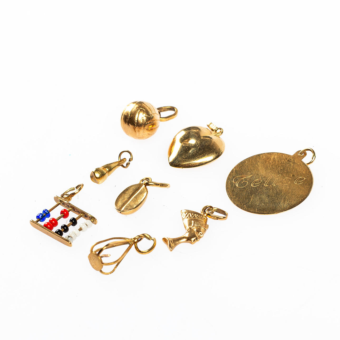 3060567. BERLOCKER / HÄNGEN, 8 delar, 18 k guld.