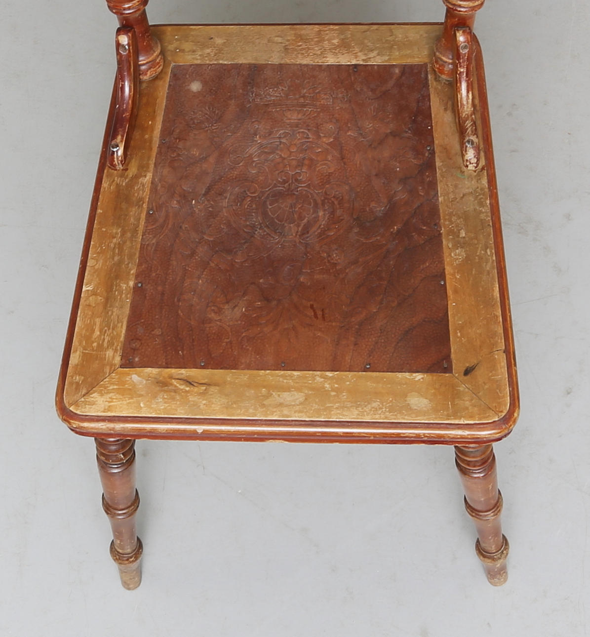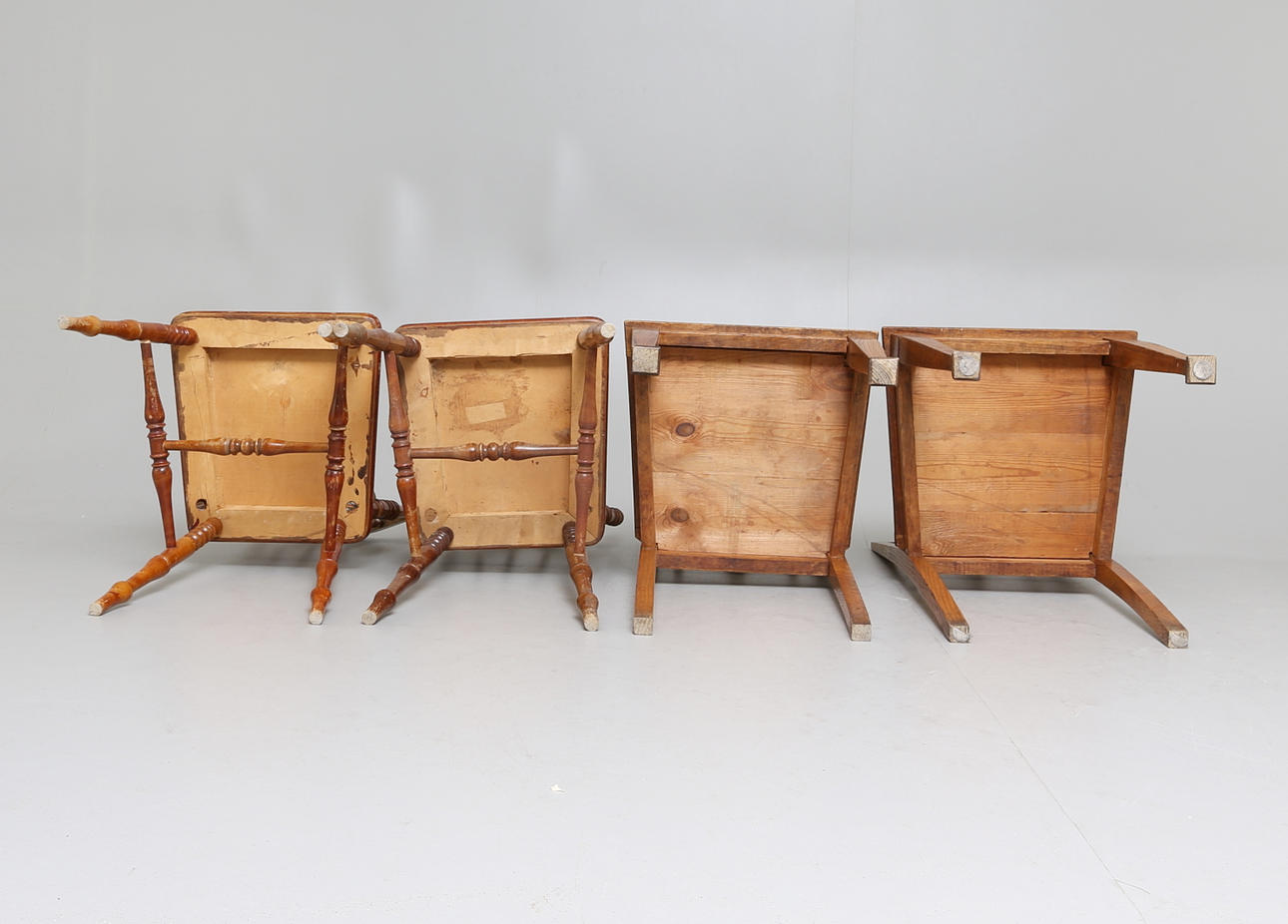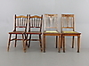 Ålders samt bruksslitage. Några stolar med limmade ovanstycken.