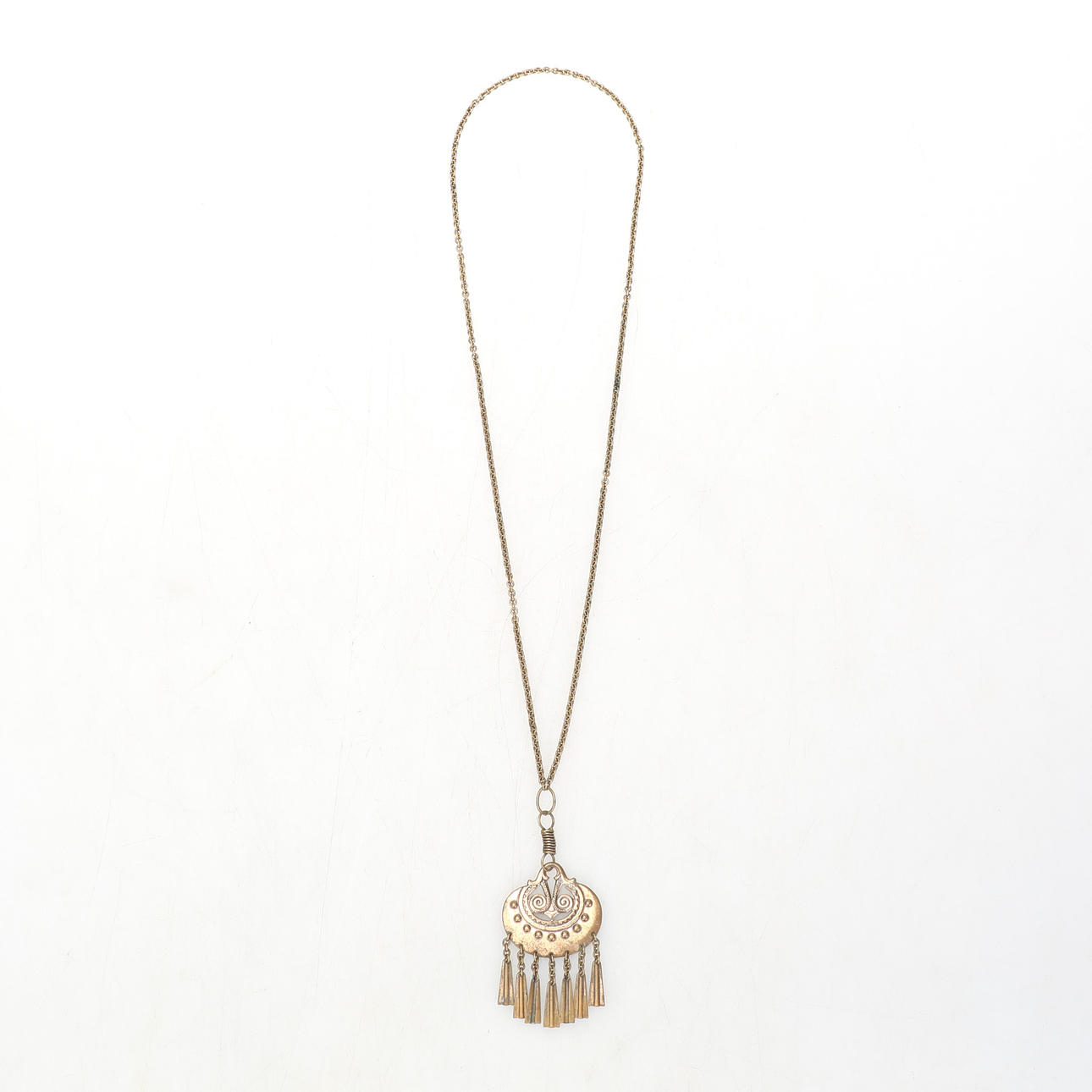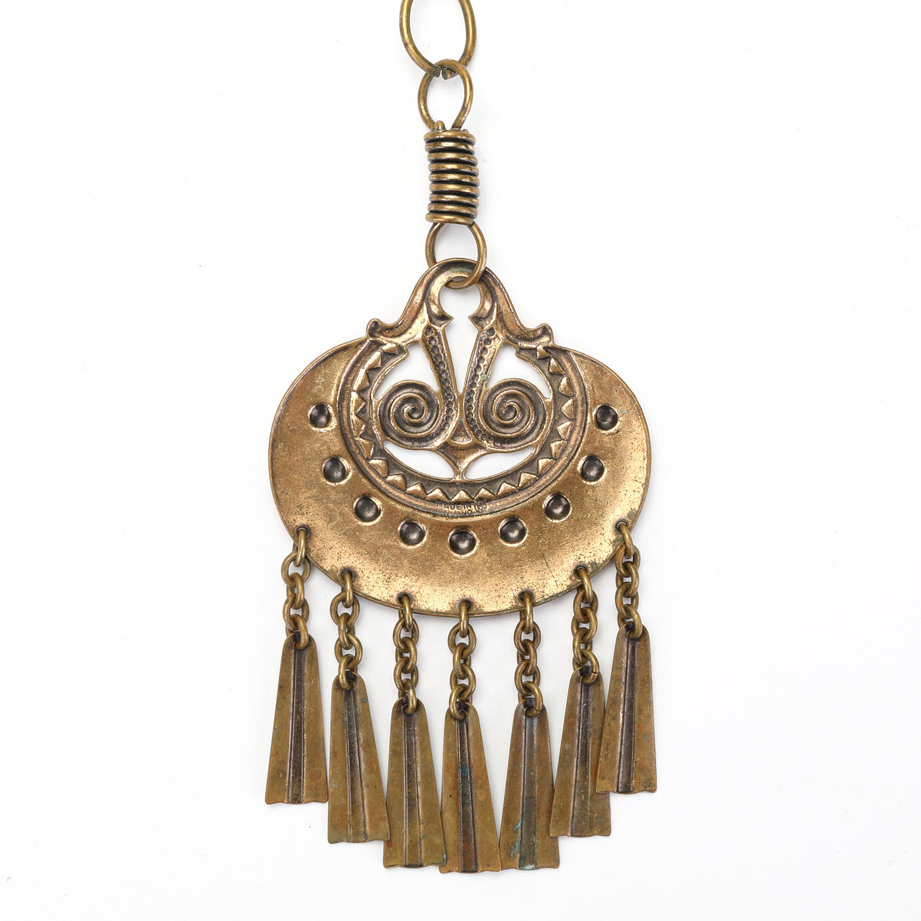 Bronshalsband från finska Kalevala Koru, Kedjan är ca 80 cm lång, hängsmycket mäter ca 5 x 7,5 cm exklusive hängöglorna.